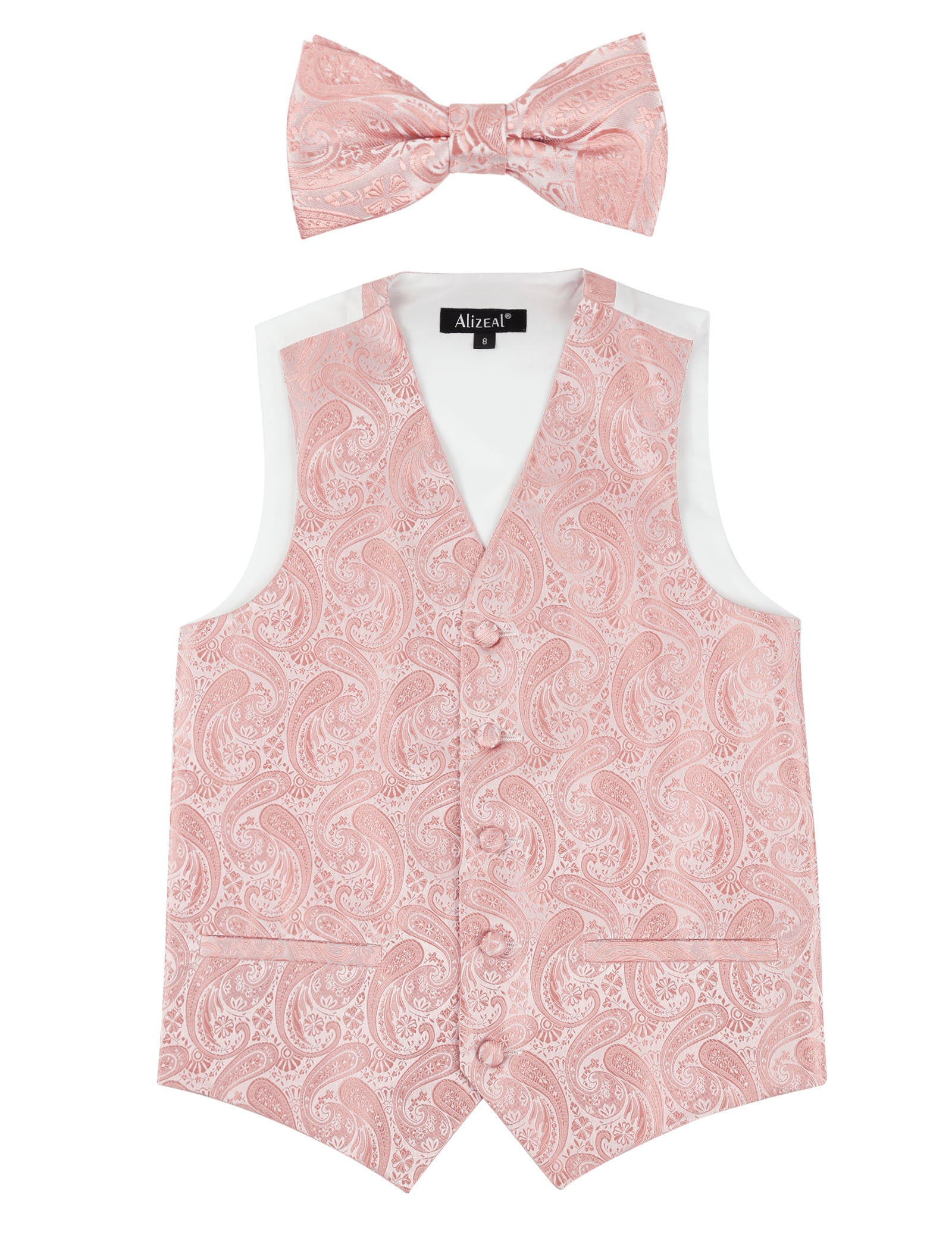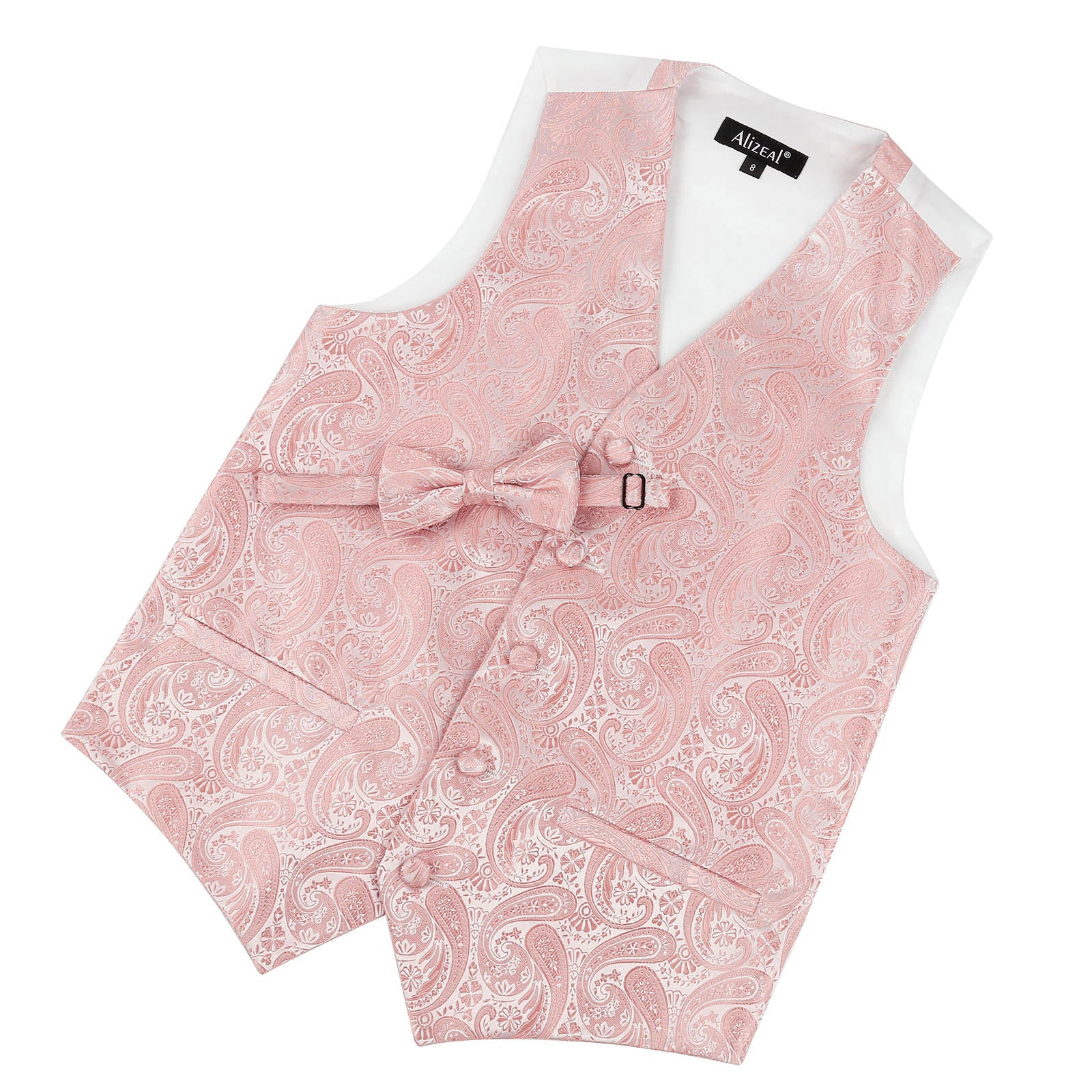 Boy's Paisley Jacquard Pre-Tied Bow Tie with Classic Floral Dress Suit Vest Set, 077-Pink