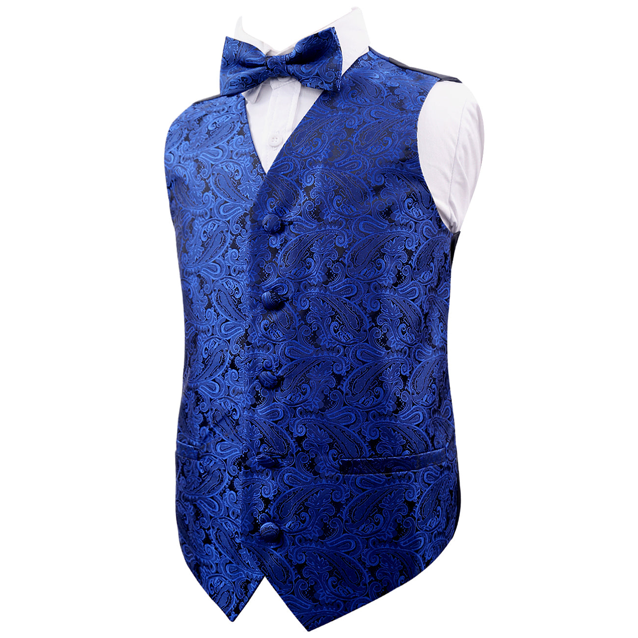 Boy's Paisley Jacquard Wedding Pre-Tied Bow Tie and Tuxedo Waistcoat Set, 079-Royal Blue
