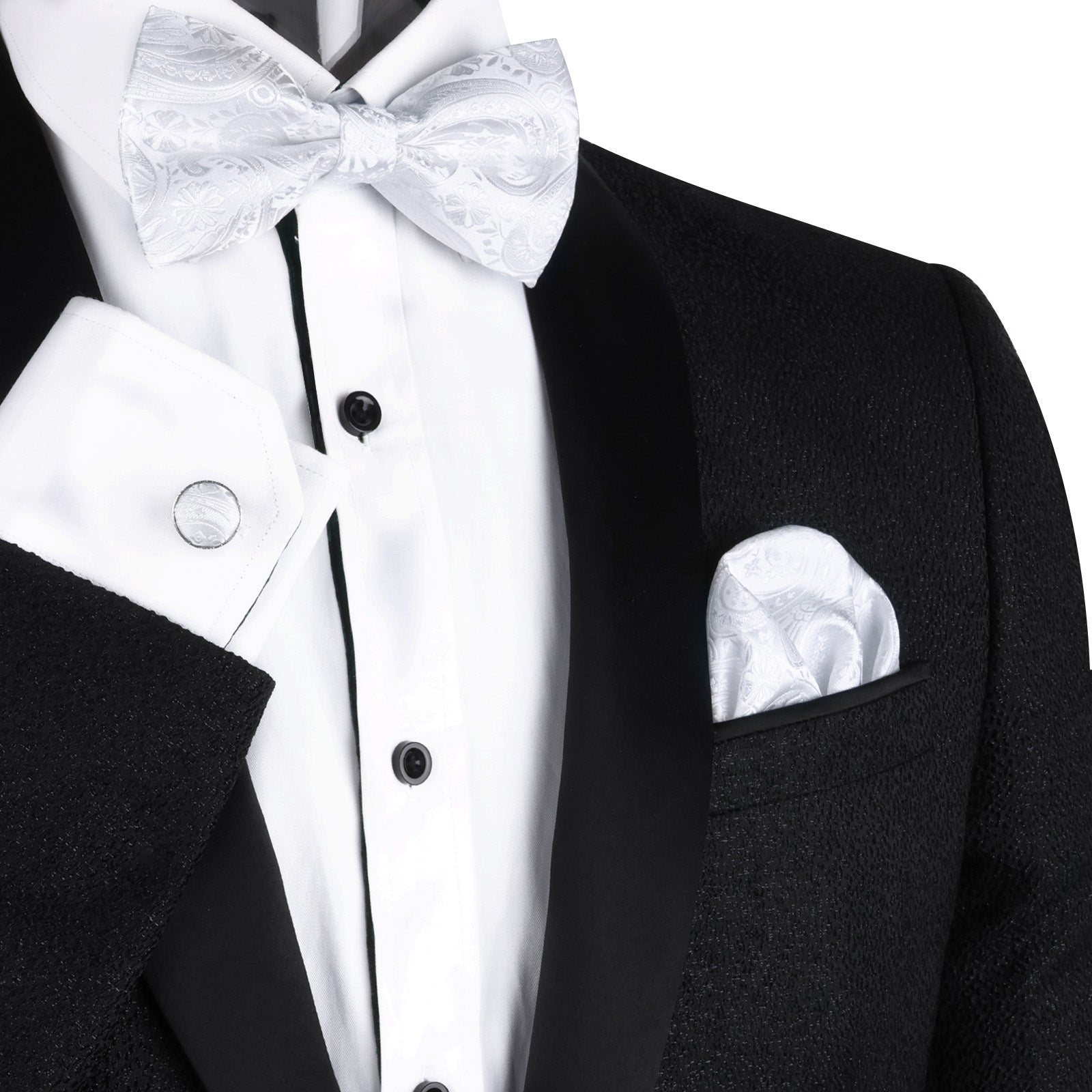- DESIGN: The V-neck waistcoat, the bow tie, hanky and cufflink are designed with classic paisley pattern and diverse colors. Without question, this set is a wonderful choice to your collection for its outstandingly ornamental effect