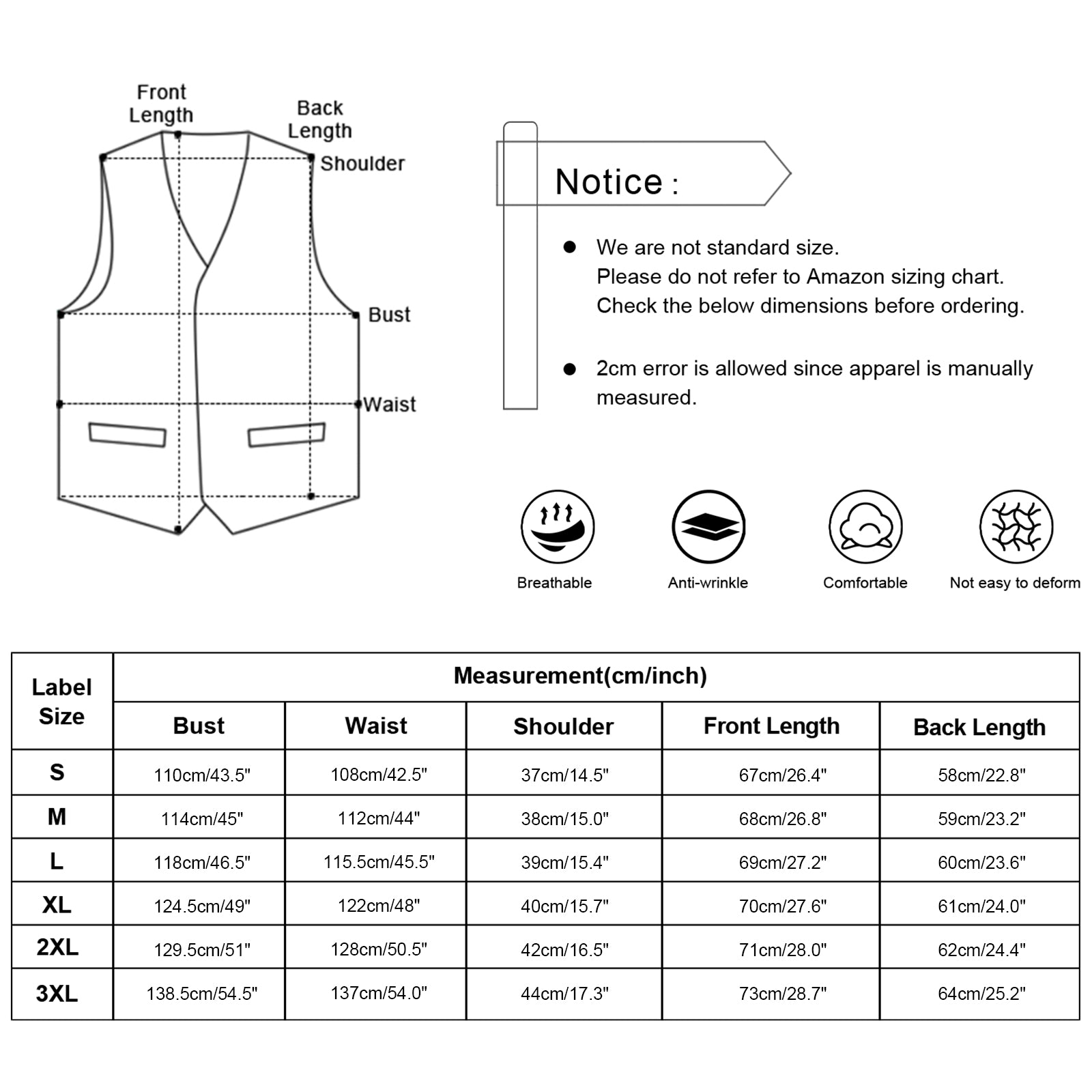 - PACKAGE INCLUDE: 1* waistcoat, 1* bow tie(12*6.5cm), 1* necktie(8.5*150cm), 1* pocket square(25*25cm) and a pair of cufflinks in a gift box