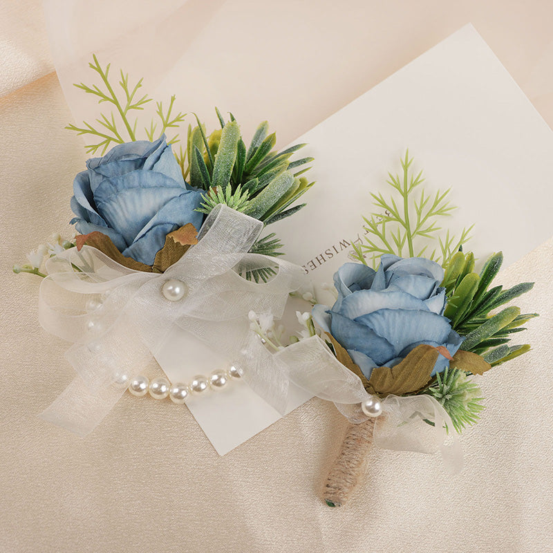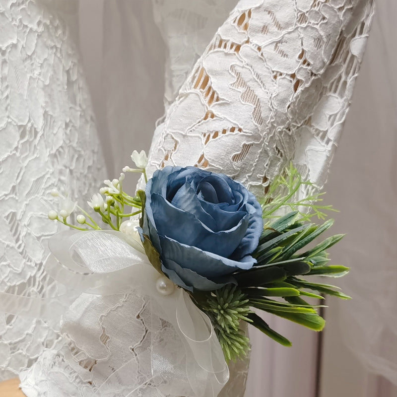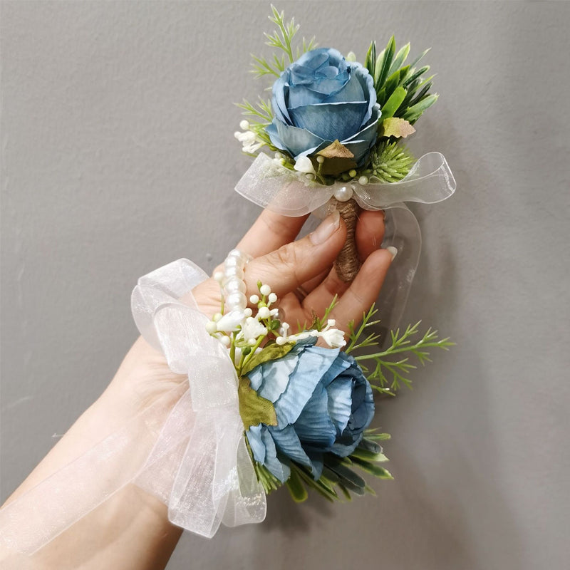 Blue Artificial Roses Set of Wrist Crosage and Boutonniere