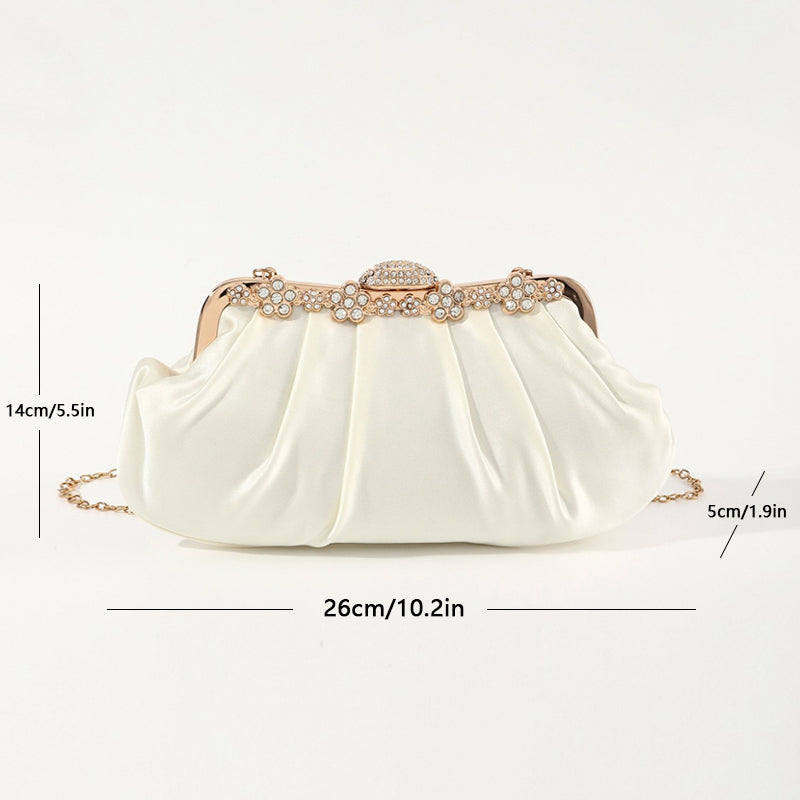 Anlässe: Diese Tasche eignet sich für verschiedene formelle Anlässe und den Alltag. Das Satinmaterial strahlt einen sanften Glanz aus, während die Diamantverzierung für ein schillerndes Gefühl von Luxus sorgt. Das Rüschendesign verleiht der Tasche einen Hauch von Schichtung und Bewegung und macht sie zum Blickfang bei Abendessen, Hochzeiten oder exklusiven Partys.