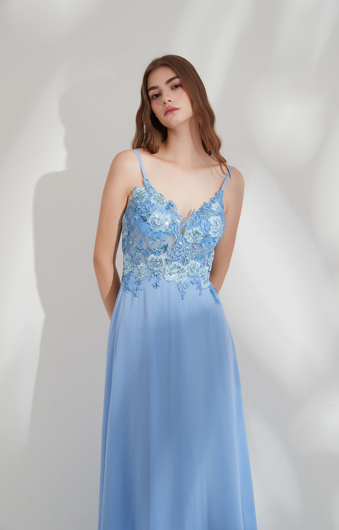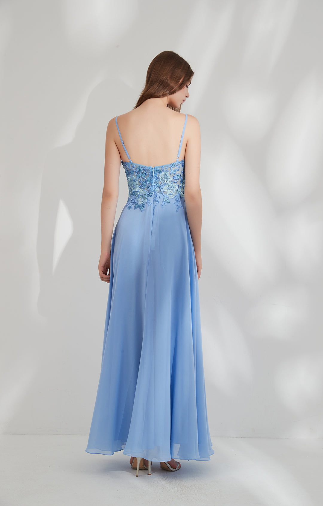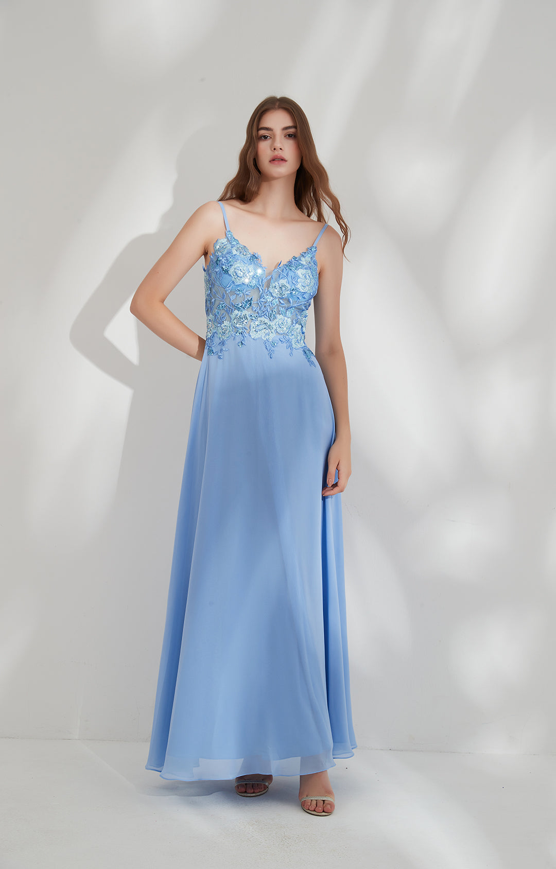 Bodenlanges Chiffonkleid mit Stickerei und Blumenmuster und Spaghettiträgern