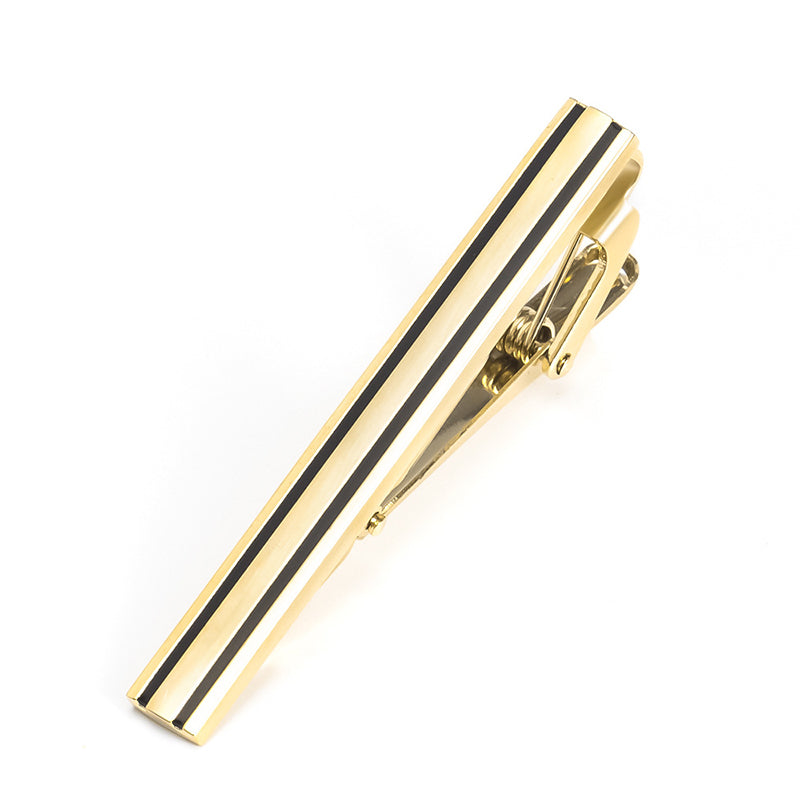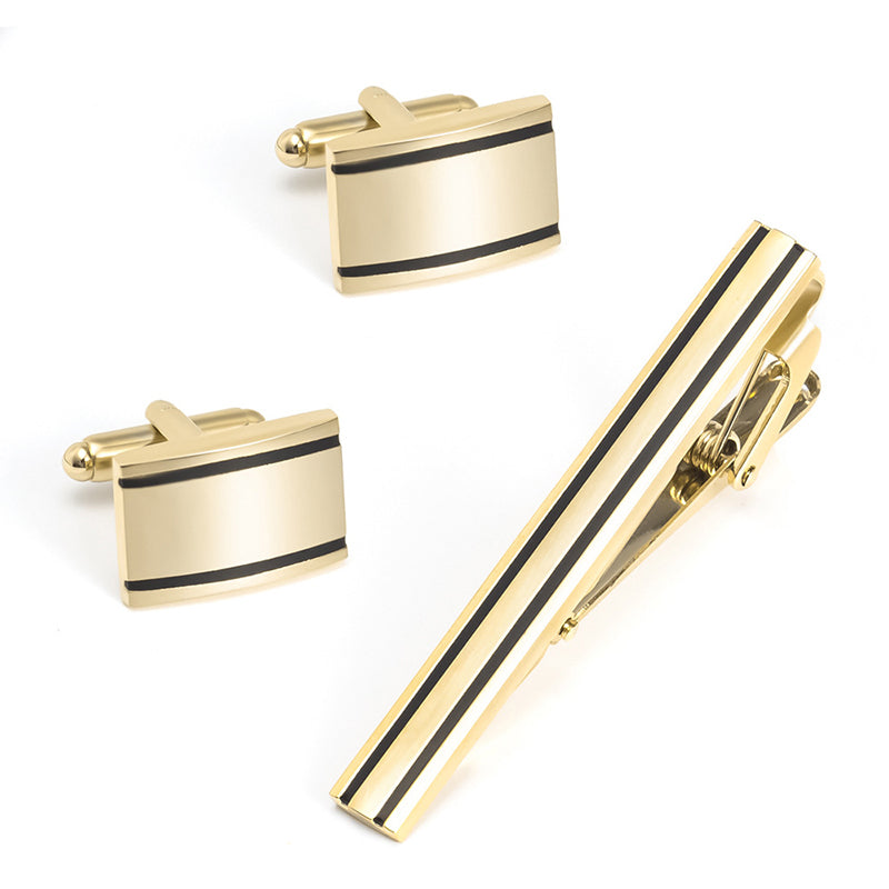 Herren-Set mit goldfarbenen, gestreiften, rechteckigen Manschettenknöpfen und Krawattenklammer