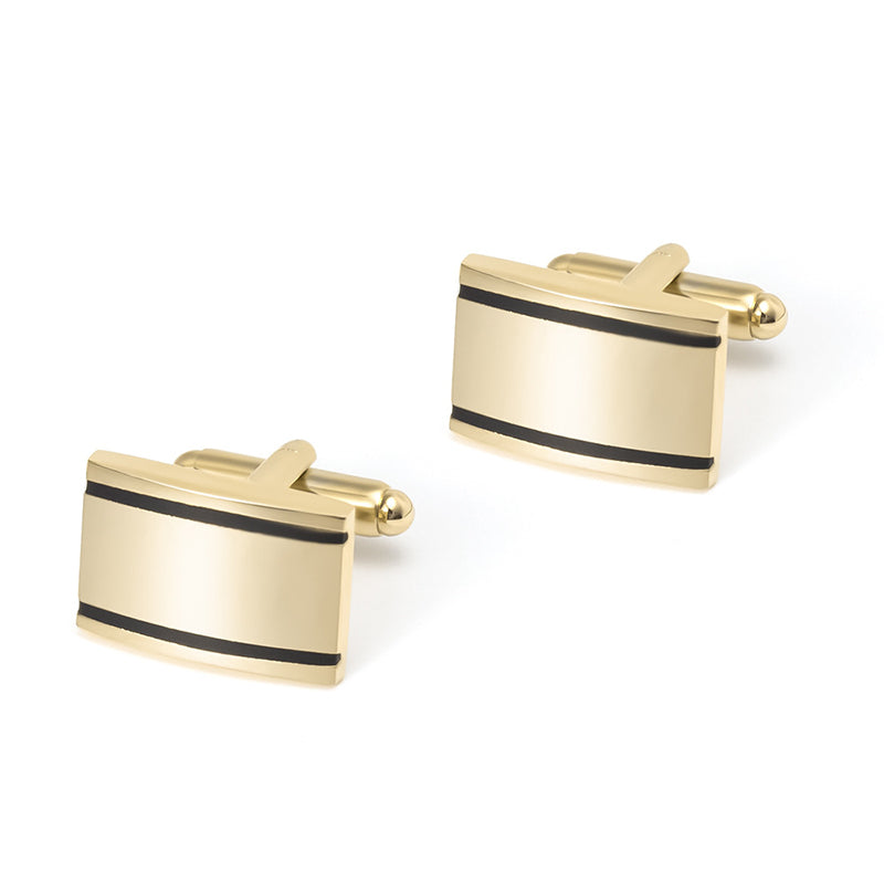 Dieses schlichte, rechteckige Manschettenknopfset aus Gold verfügt über ein wunderschönes schwarz-vergoldetes Panel mit Linienätzung für zusätzliche Details und hat ein zeitloses Design, das zu allem passt.
