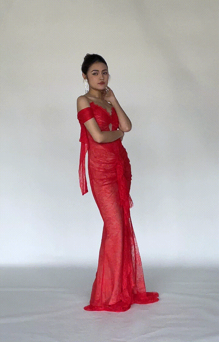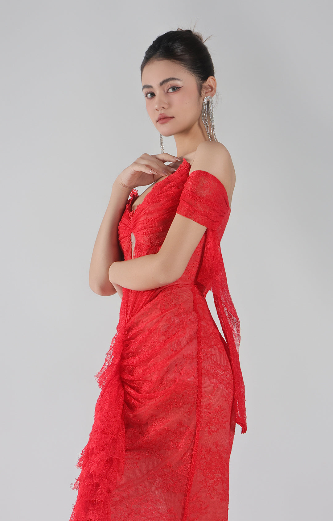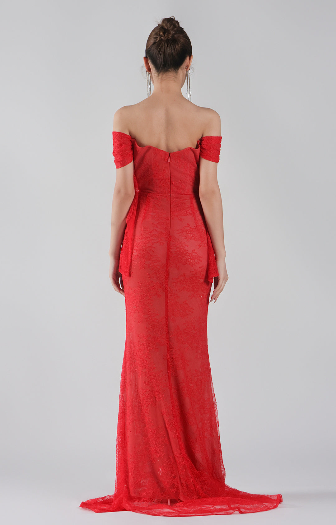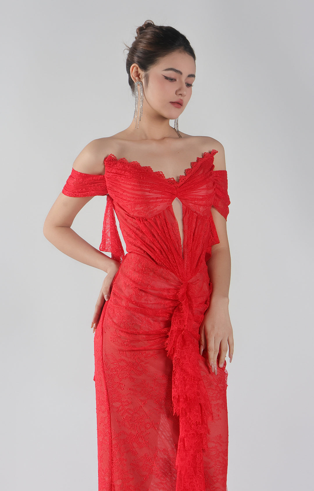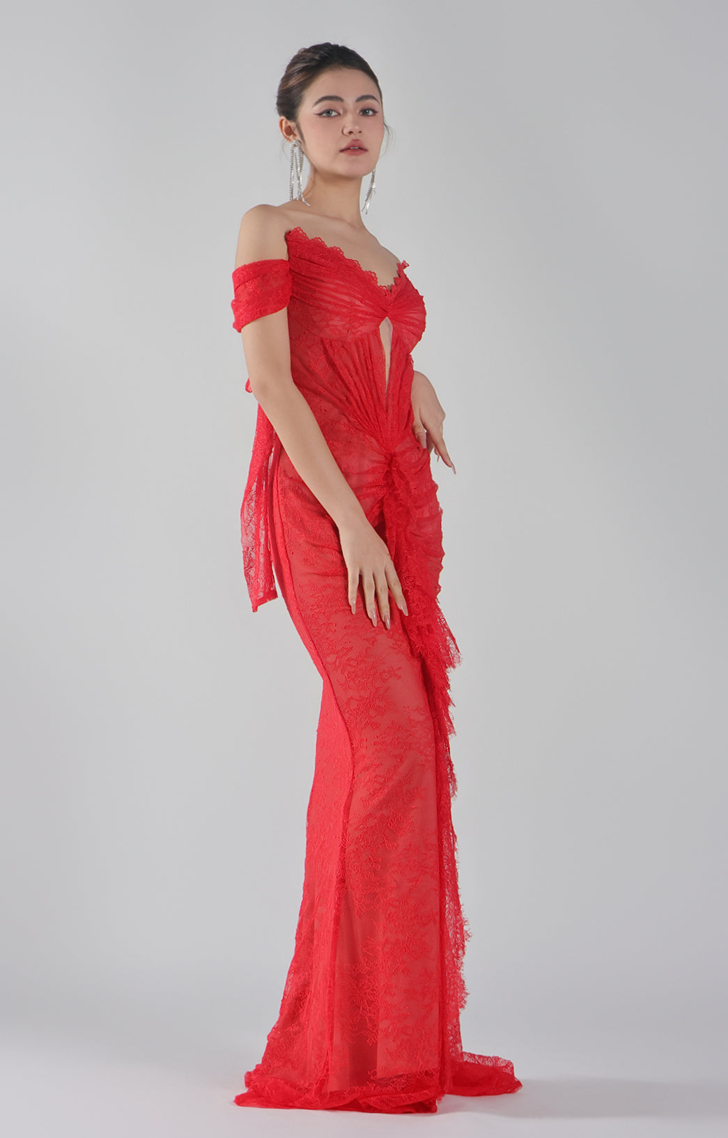 Ruched Lace Off Shoulder Trailing Dress with Ribbon