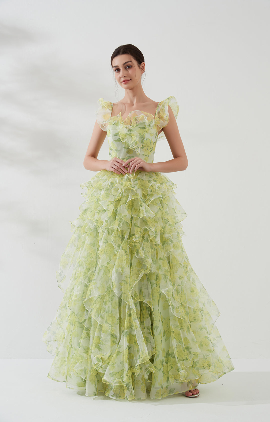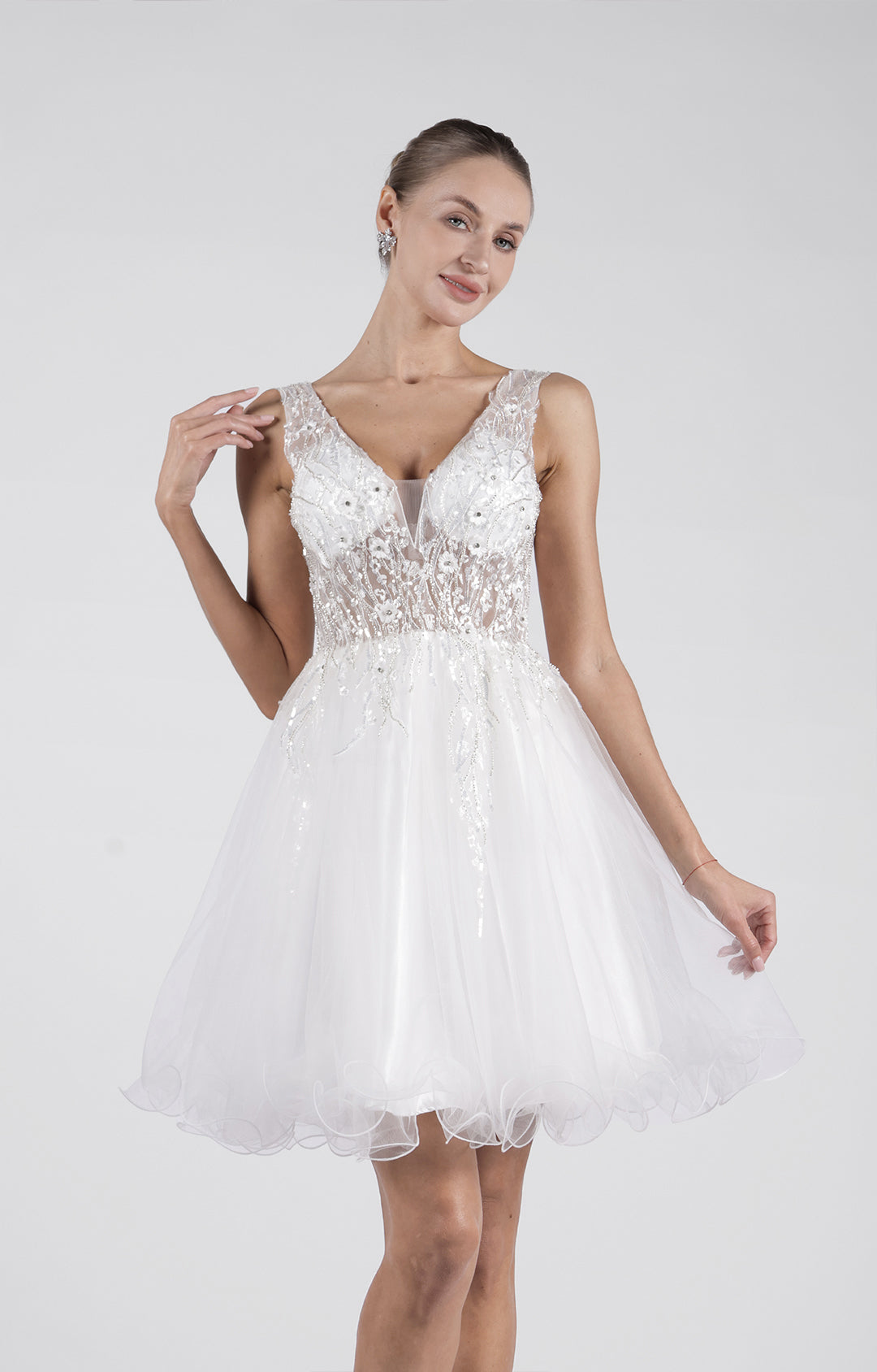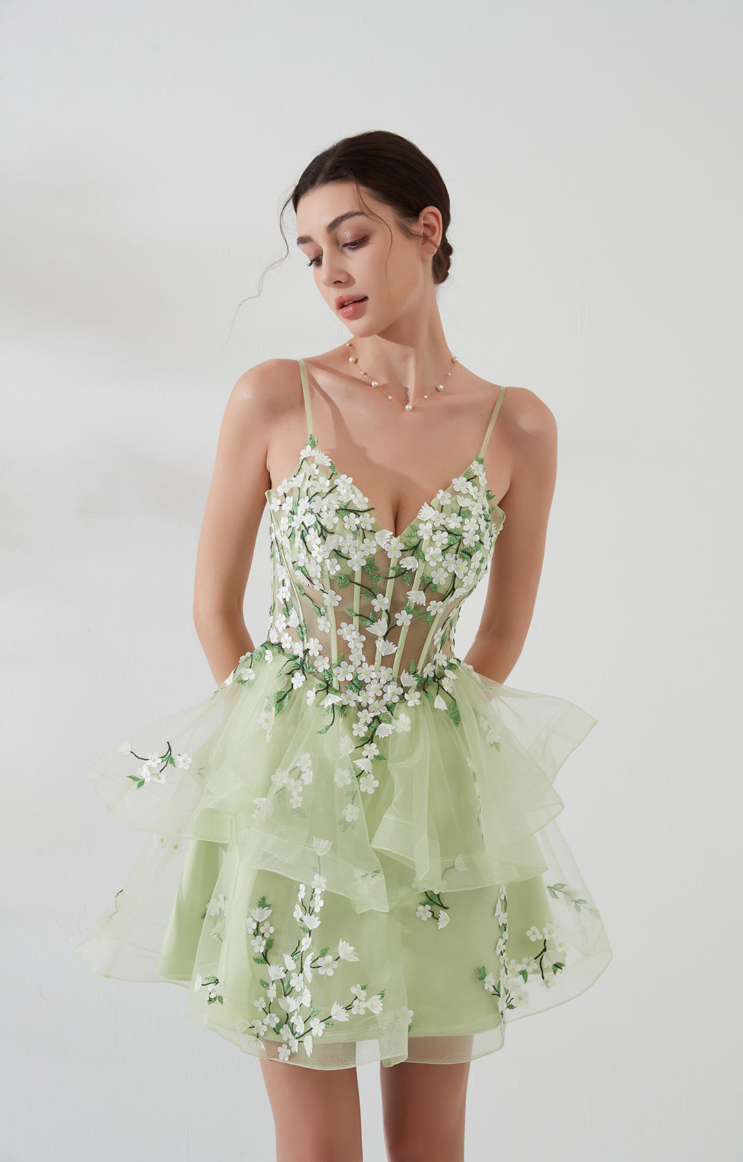 V-Ausschnitt Spaghettiträger Stickerei Applikation Puffy Kurze Kleider