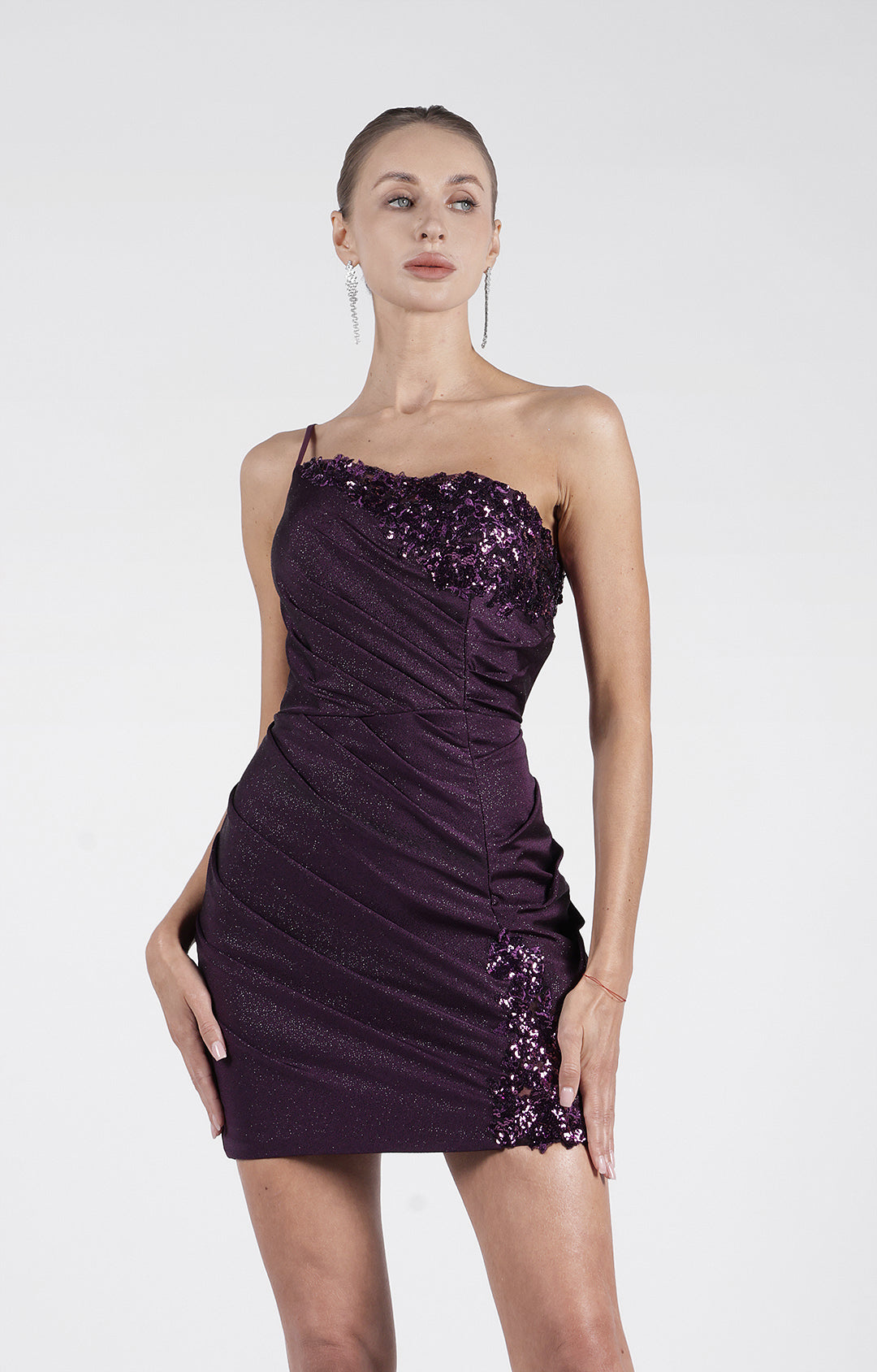 One-Shoulder Spaghettiträger Etui Pailletten Plissee Minikleider
