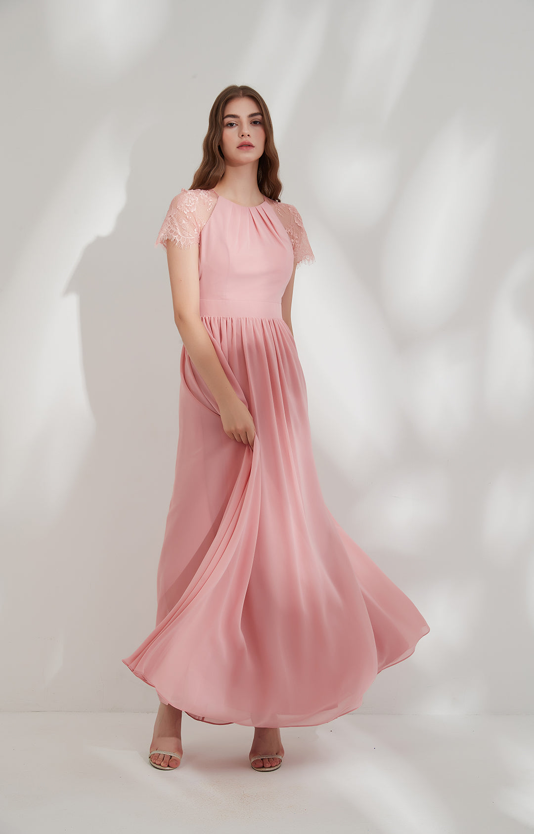 Bodenlanges Chiffon-Brautjungfernkleid mit Cut-out am Rücken und Spitze und kurzen Ärmeln