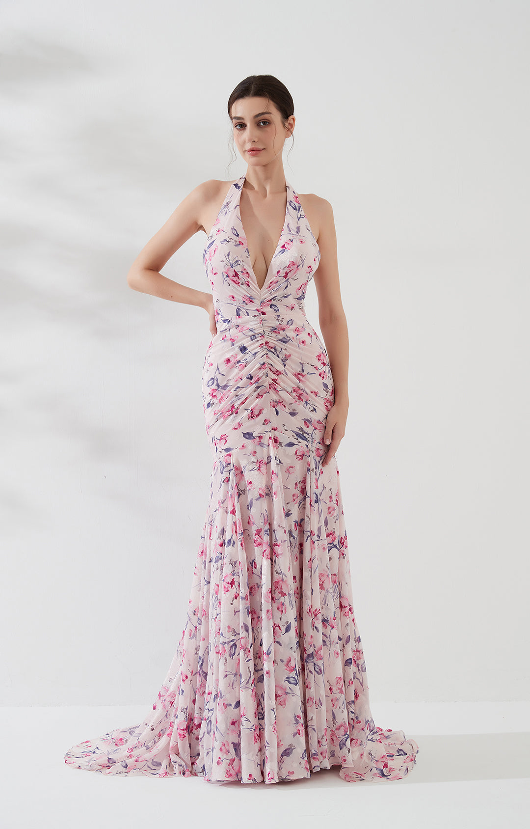 Ärmelloses, tiefes V-Ausschnitt Neckholder-Rückenfreies Jacquard-Meerjungfrauenkleid