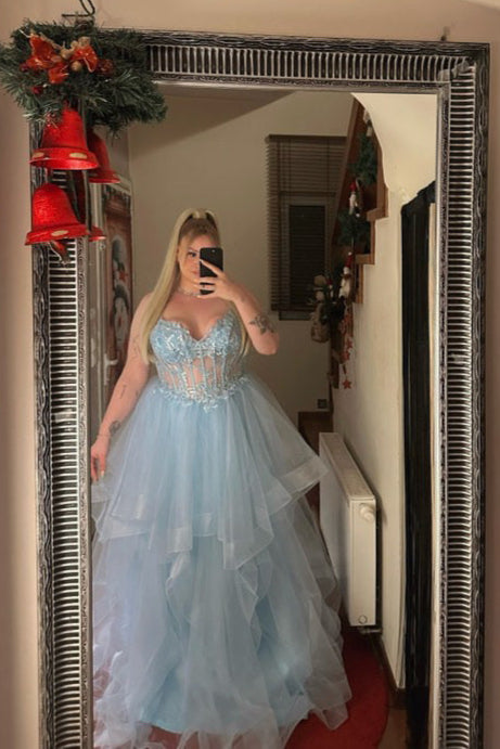 Trägerloses, bodenlanges Kleid mit Spitzenmieder, geschlitztem Tüll und Stufen