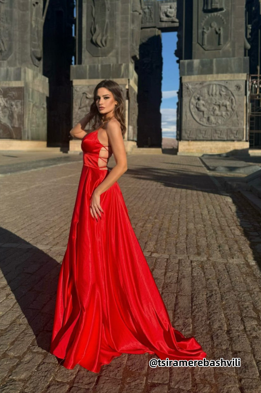 Rückenfreies Maxikleid aus Satin mit tiefem V-Ausschnitt und Schnürung in A-Linie