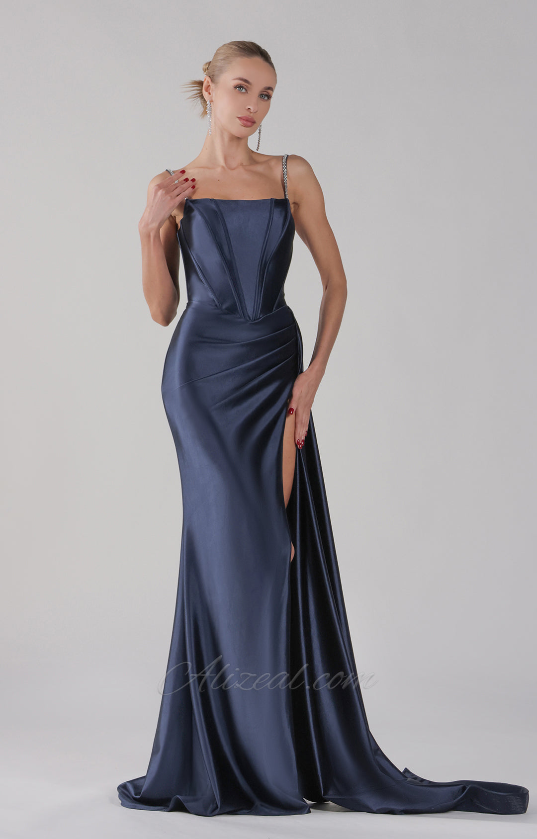 Etuikleid mit tiefem V-Ausschnitt, Spaghettiträgern, hohem Schlitz vorne und bodenlangem Abendkleid