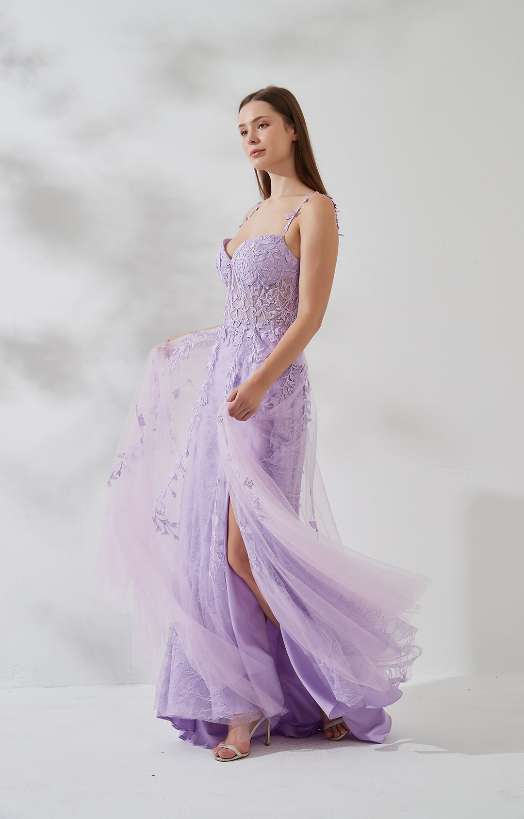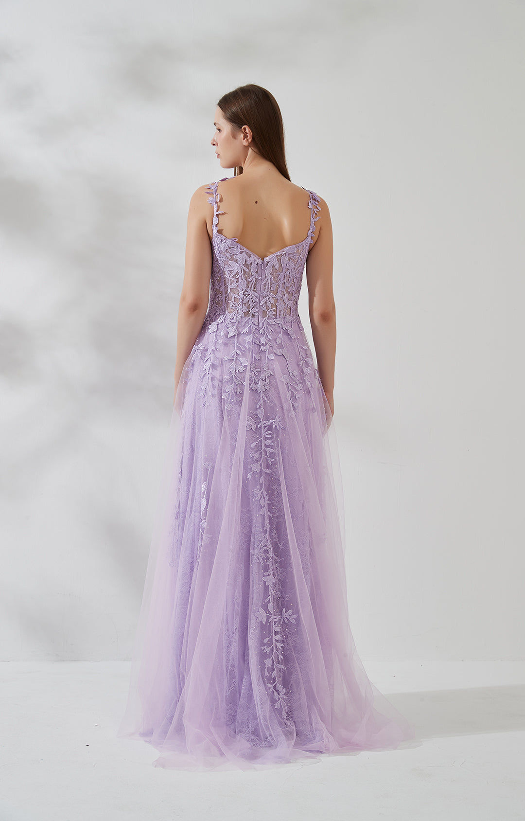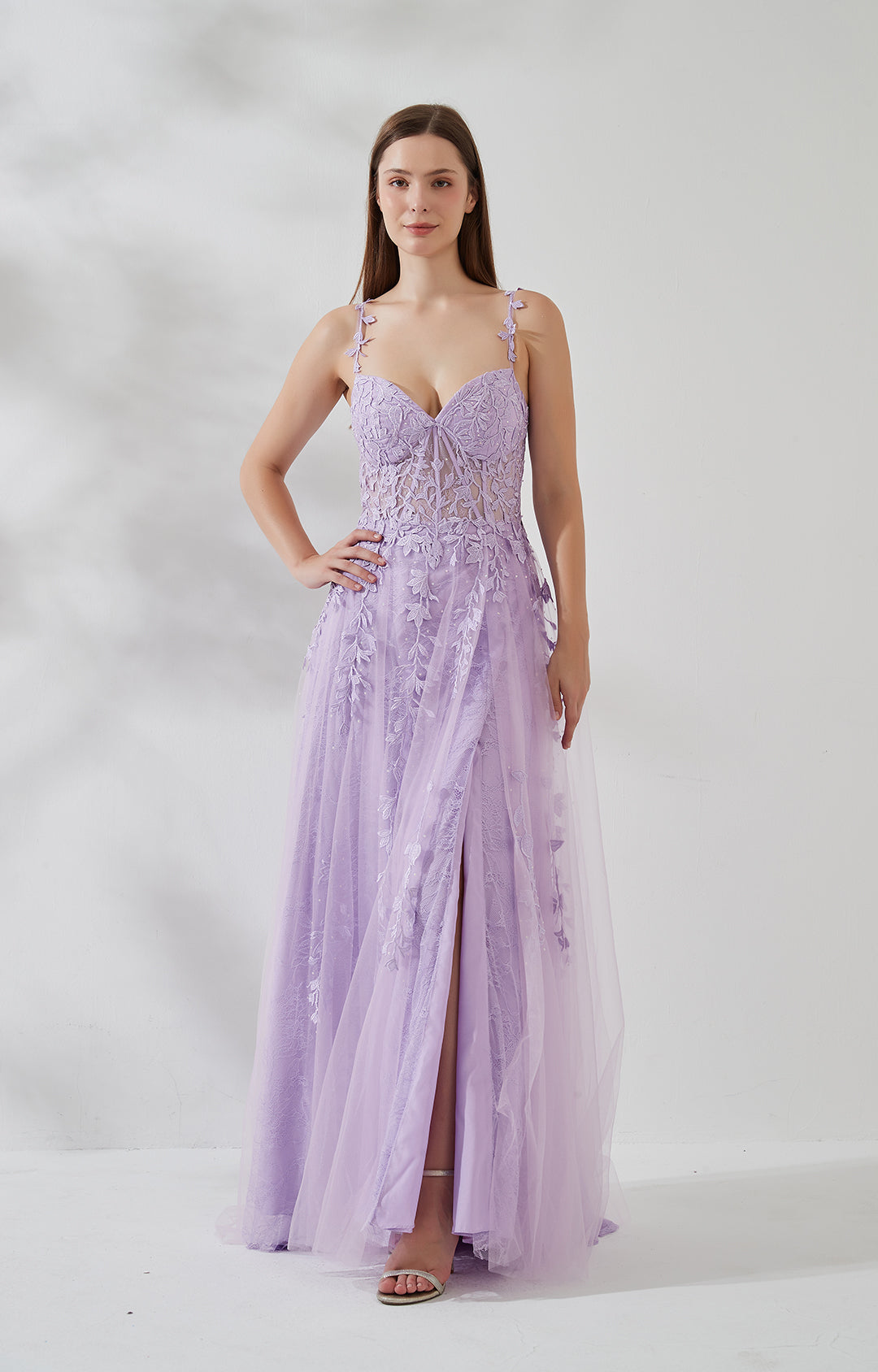 Dieses bodenlange, lila Kleid mit elegantem A-Linien-Rock, Spaghettiträgern und zarten Spitzenapplikationen ist perfekt für Abschlussfeiern, Geburtstagsfeiern und formelle Verabredungen.