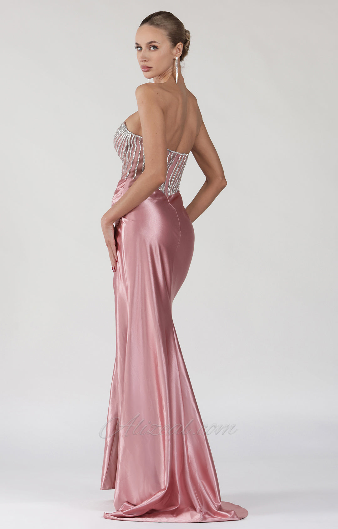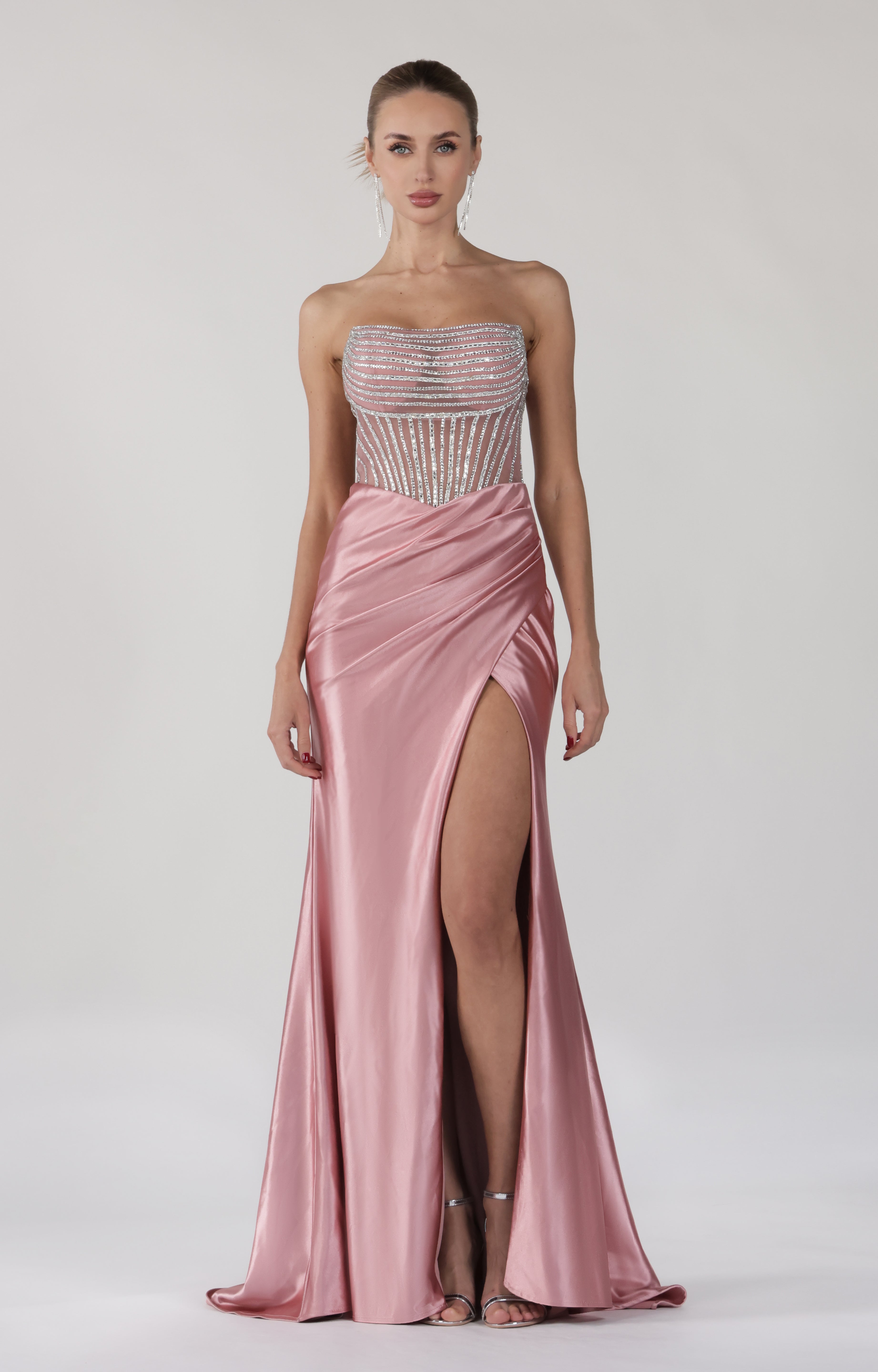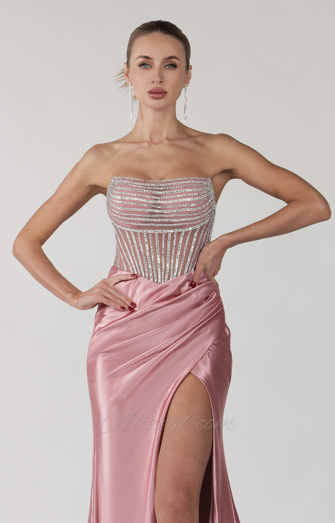 Trägerloses Kleid mit Perlenbesatz, transparenter Taille, hohem Schlitz und Schleppe