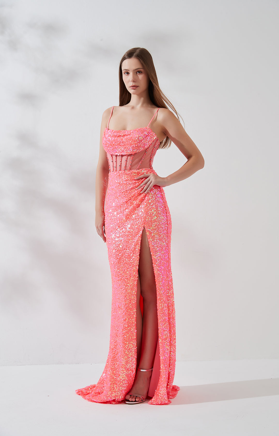 Etuikleid mit gerüschtem, drapiertem Ausschnitt, bestickten Pailletten, hohem Seitenschlitz