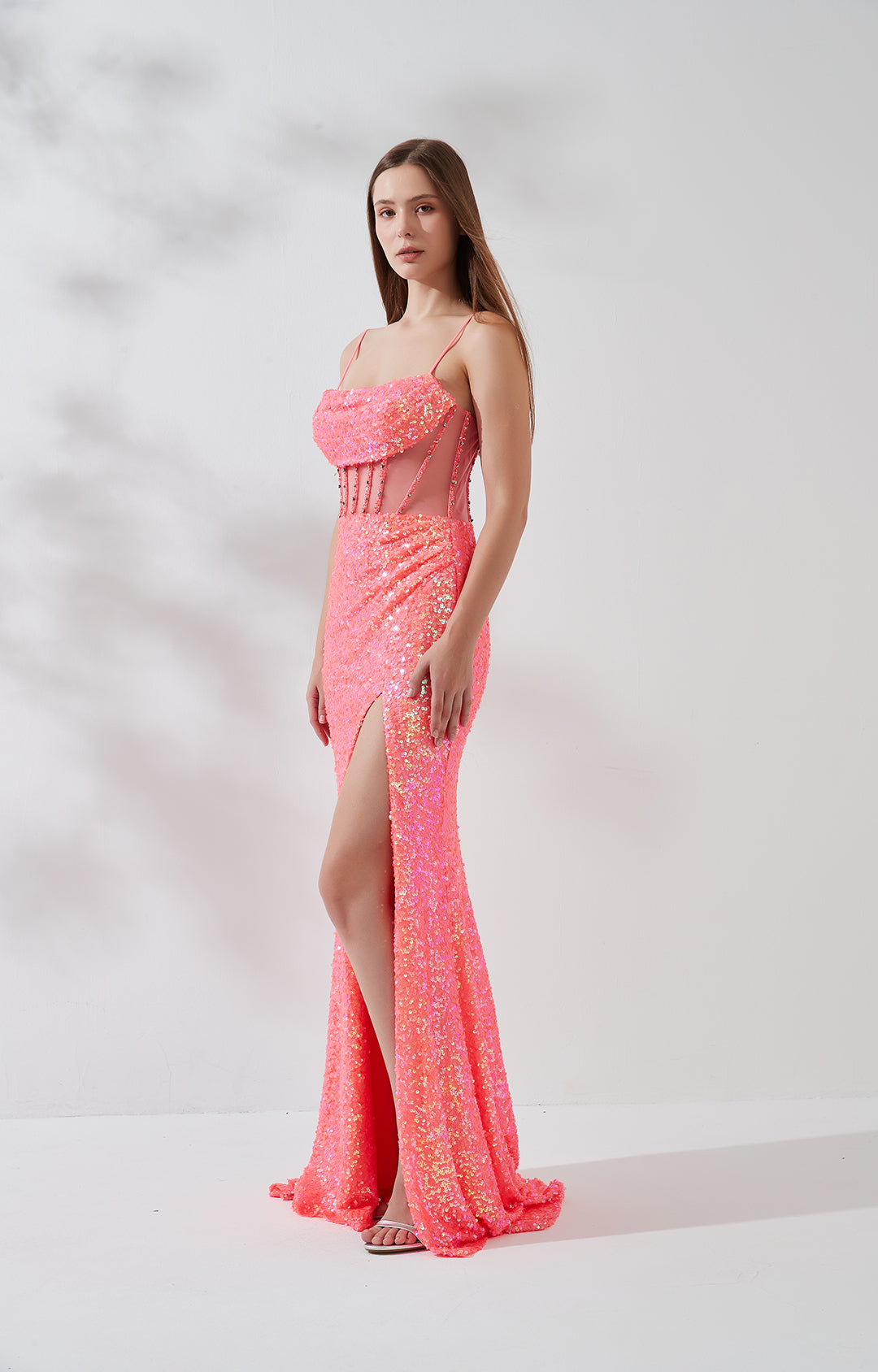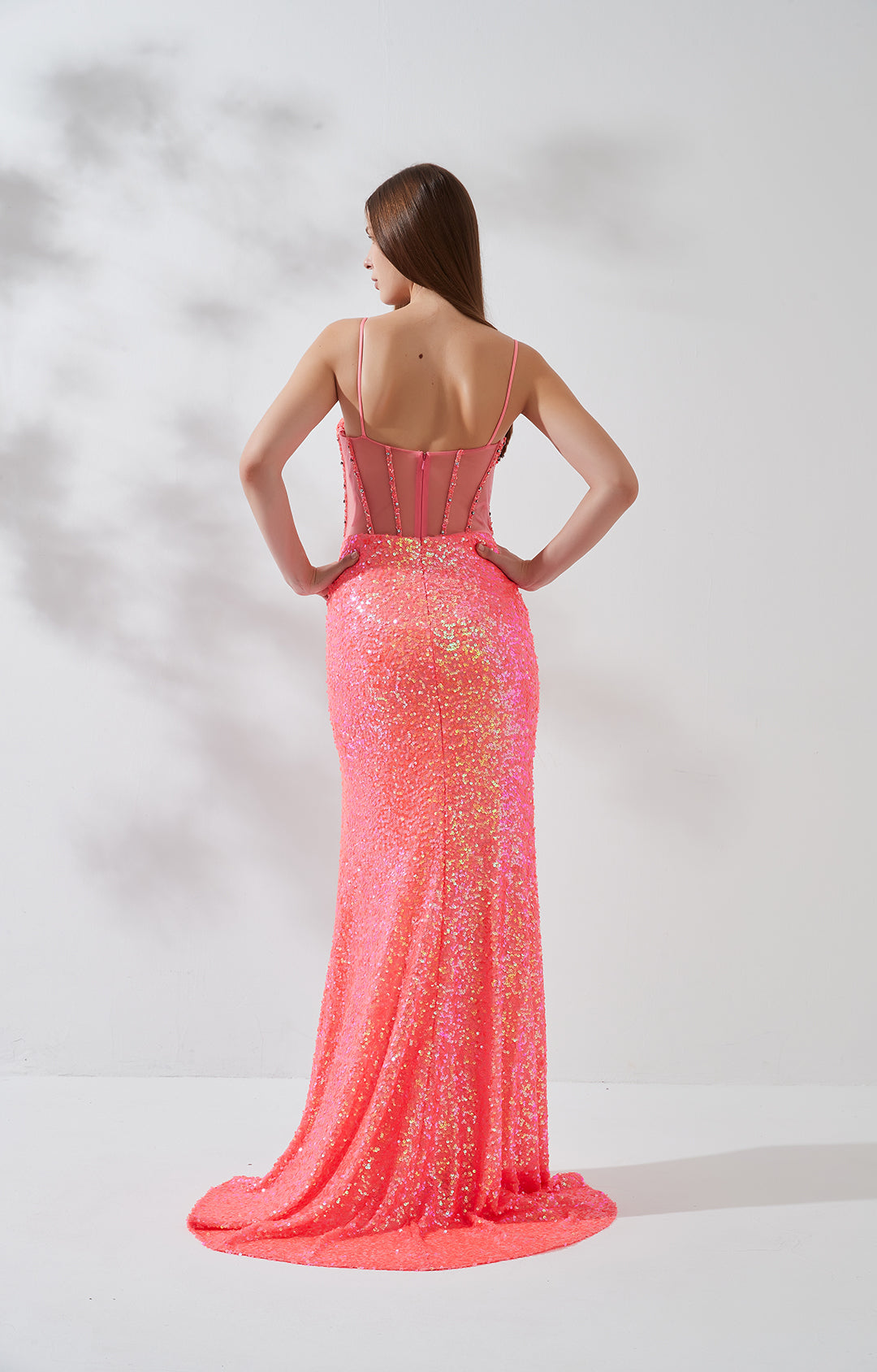 Dieses Kleid besteht aus farbechtem Polyestermaterial und leichtem und transparentem Netzstoff.