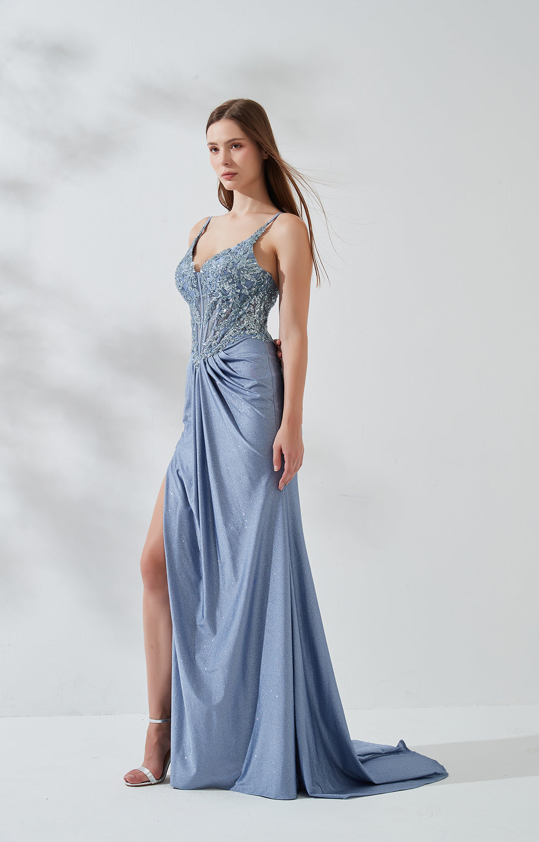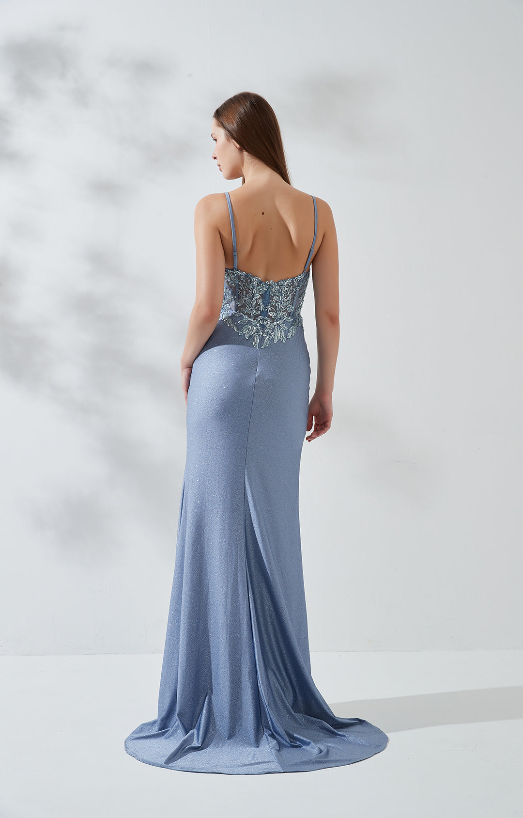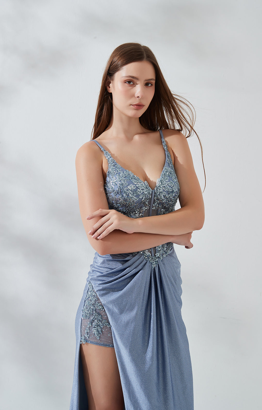 Spaghettiträger, applizierte Plissee-Abendkleider mit hohem Schlitz und Fischgräten-Reißverschluss
