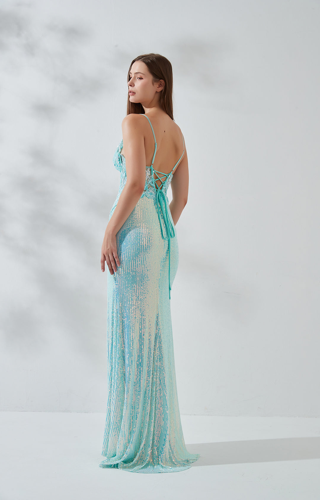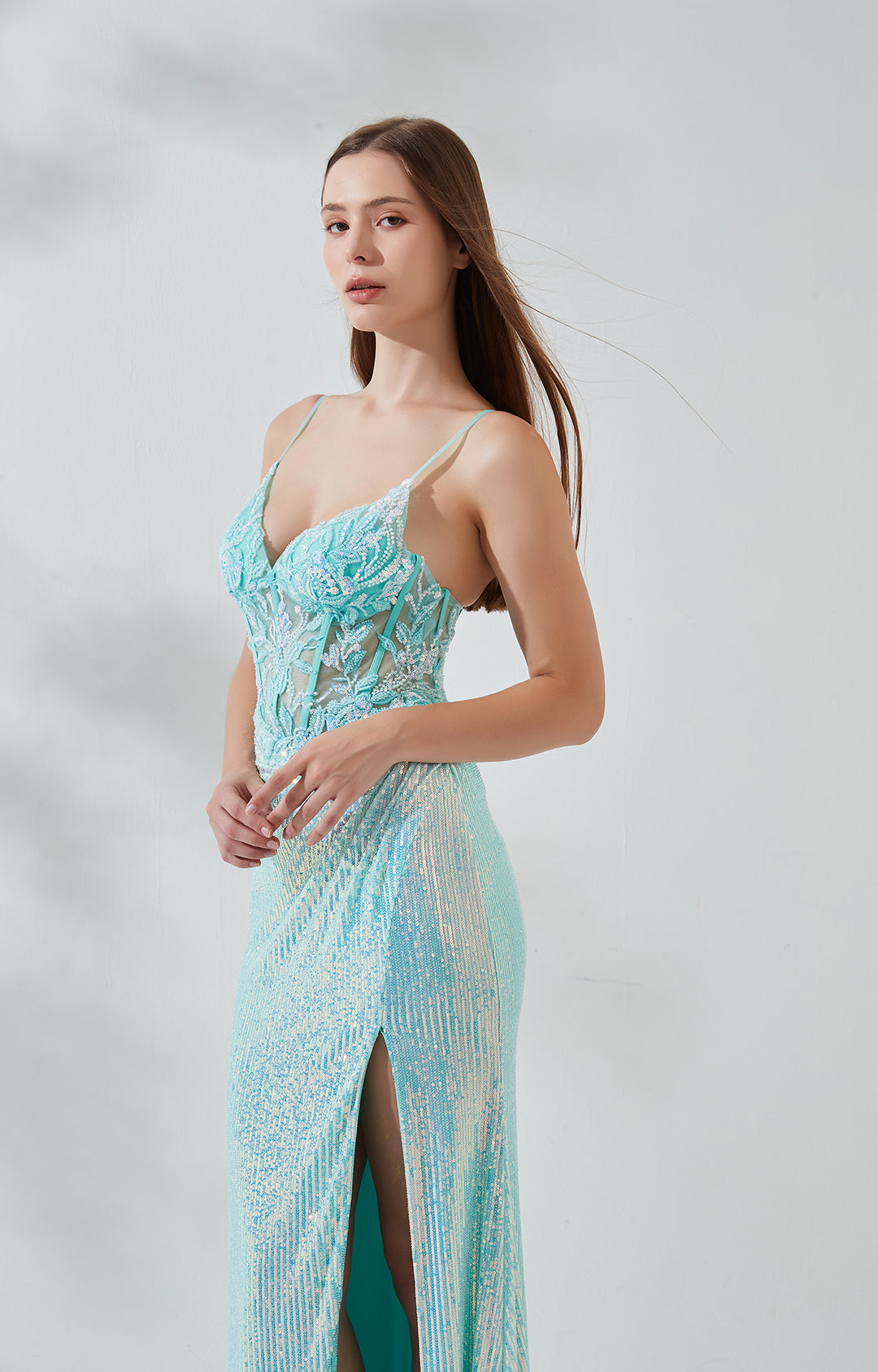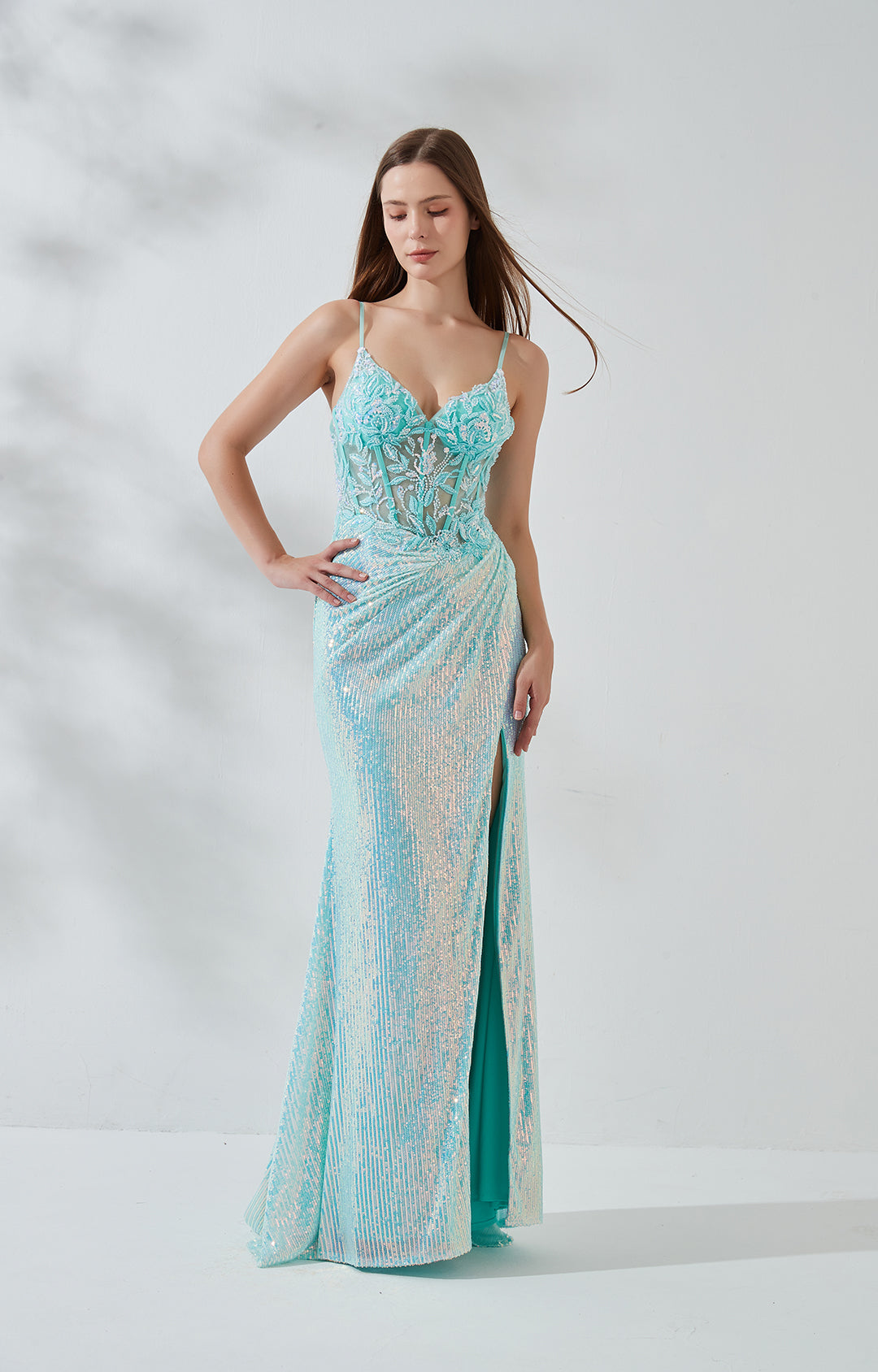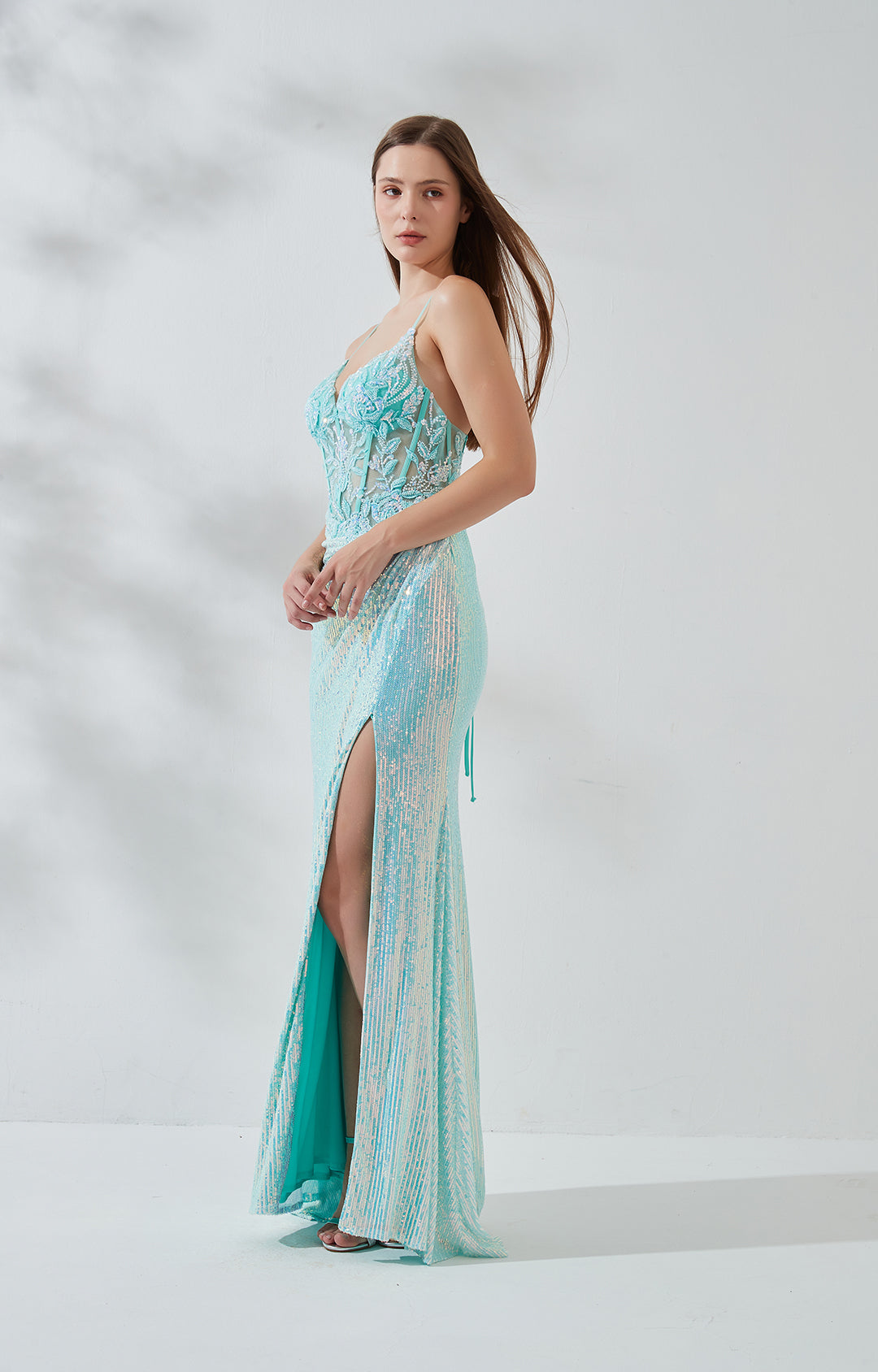Ballkleid mit Spaghettiträgern, V-Ausschnitt, Spitzenapplikationen, Pailletten und hohem seitlichen Schlitz