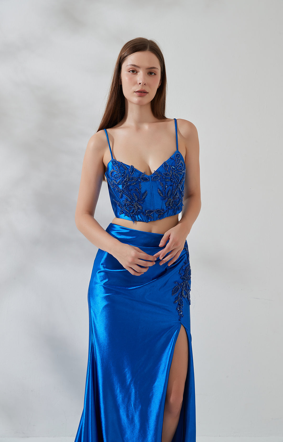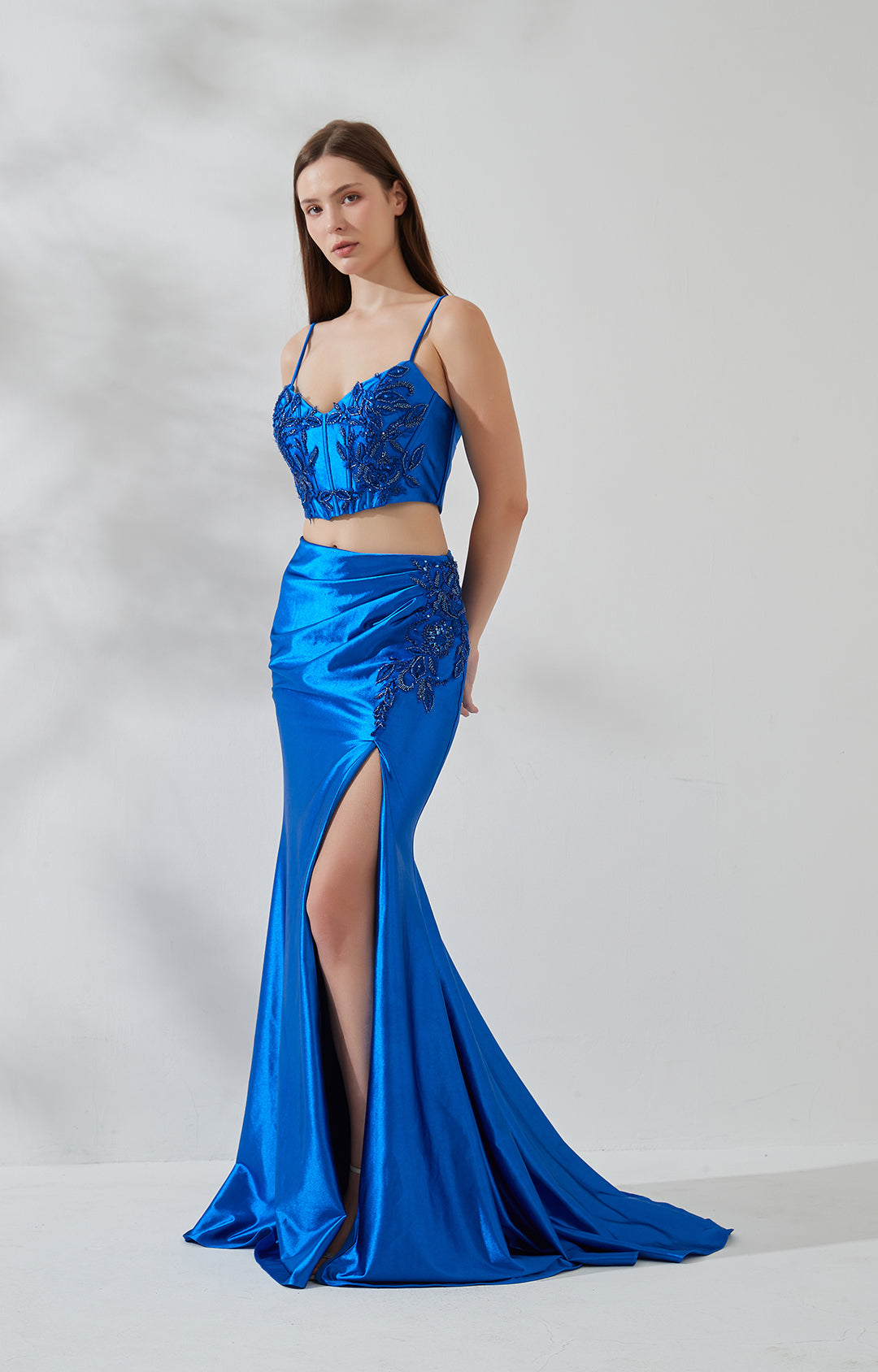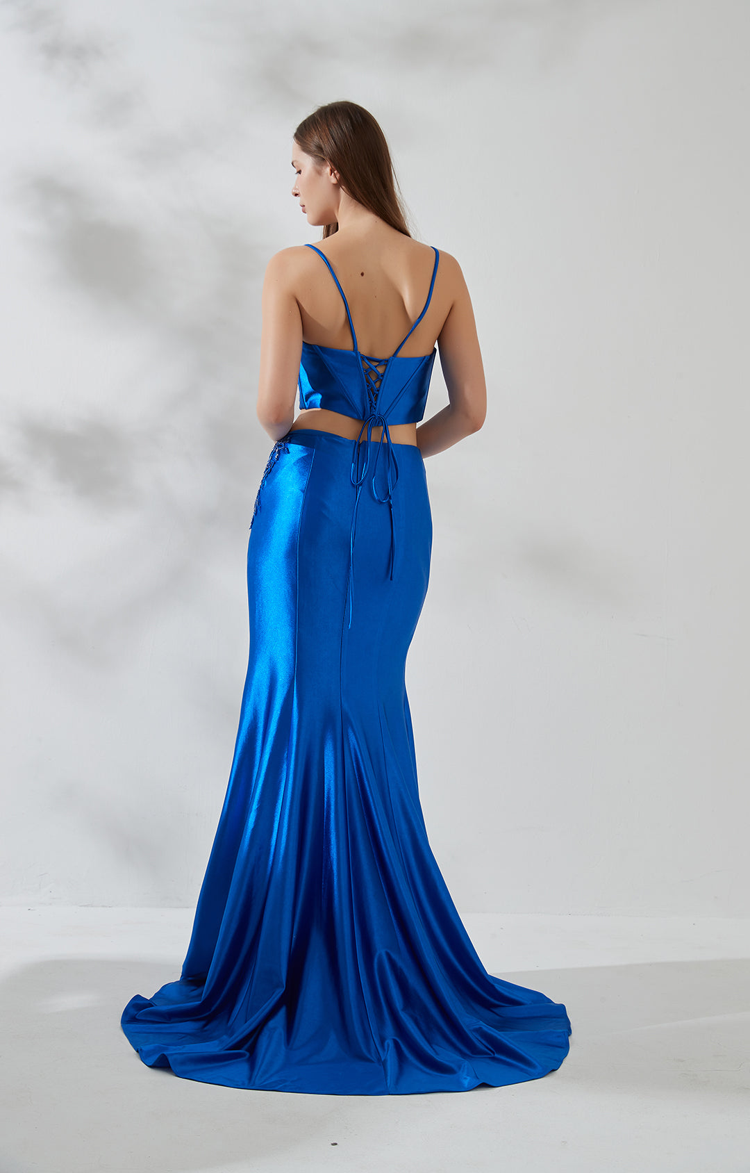 Zweiteiliges Abendkleid mit V-Ausschnitt, Applikationen, Schnürung am Rücken und Fischschwanz