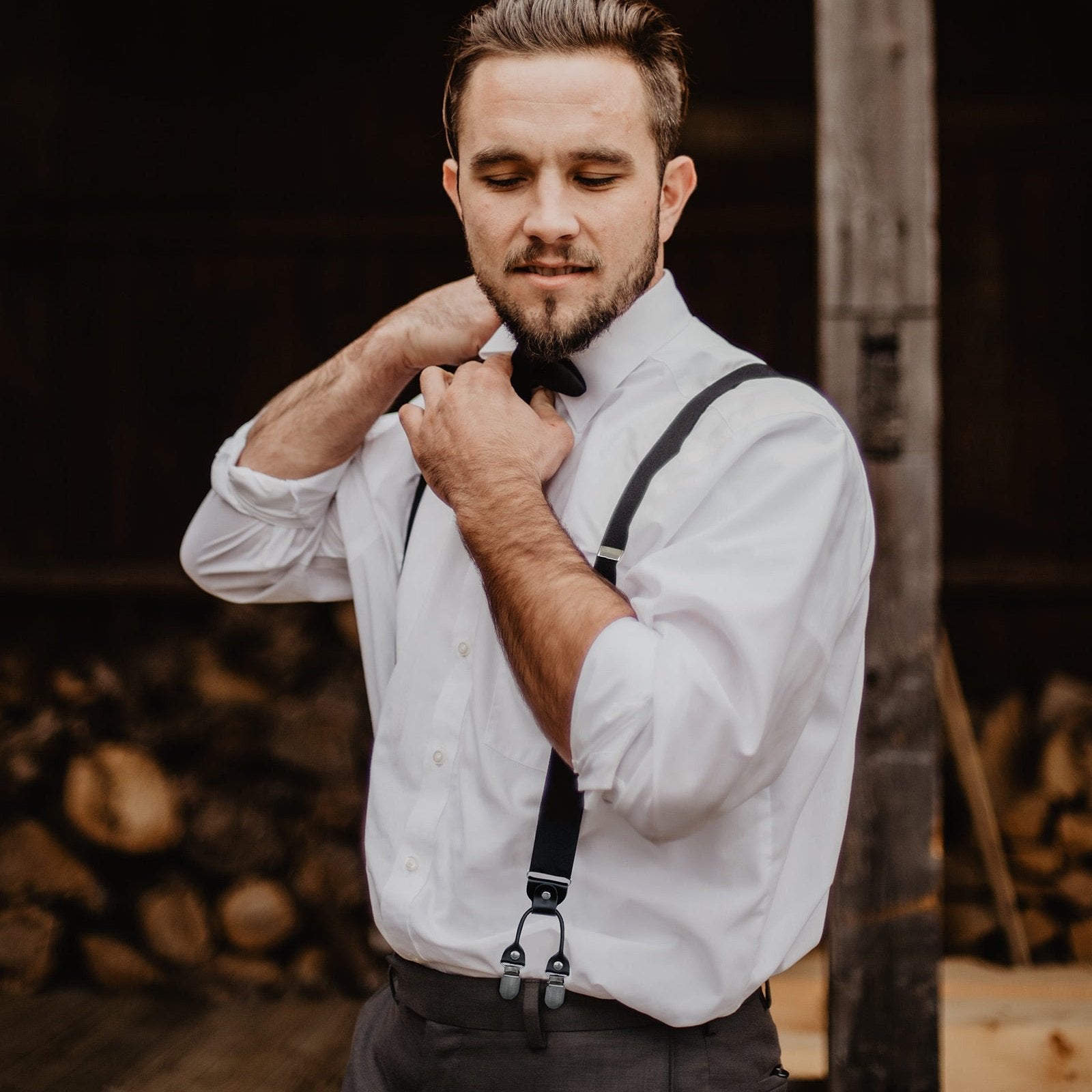 - Lieferumfang: 1 Hosenträger, 1 vorgebundene Fliege, 1 Einstecktuch und 1 Paar Manschettenknöpfe. Alle im gleichen Design, perfekt aufeinander abgestimmt.