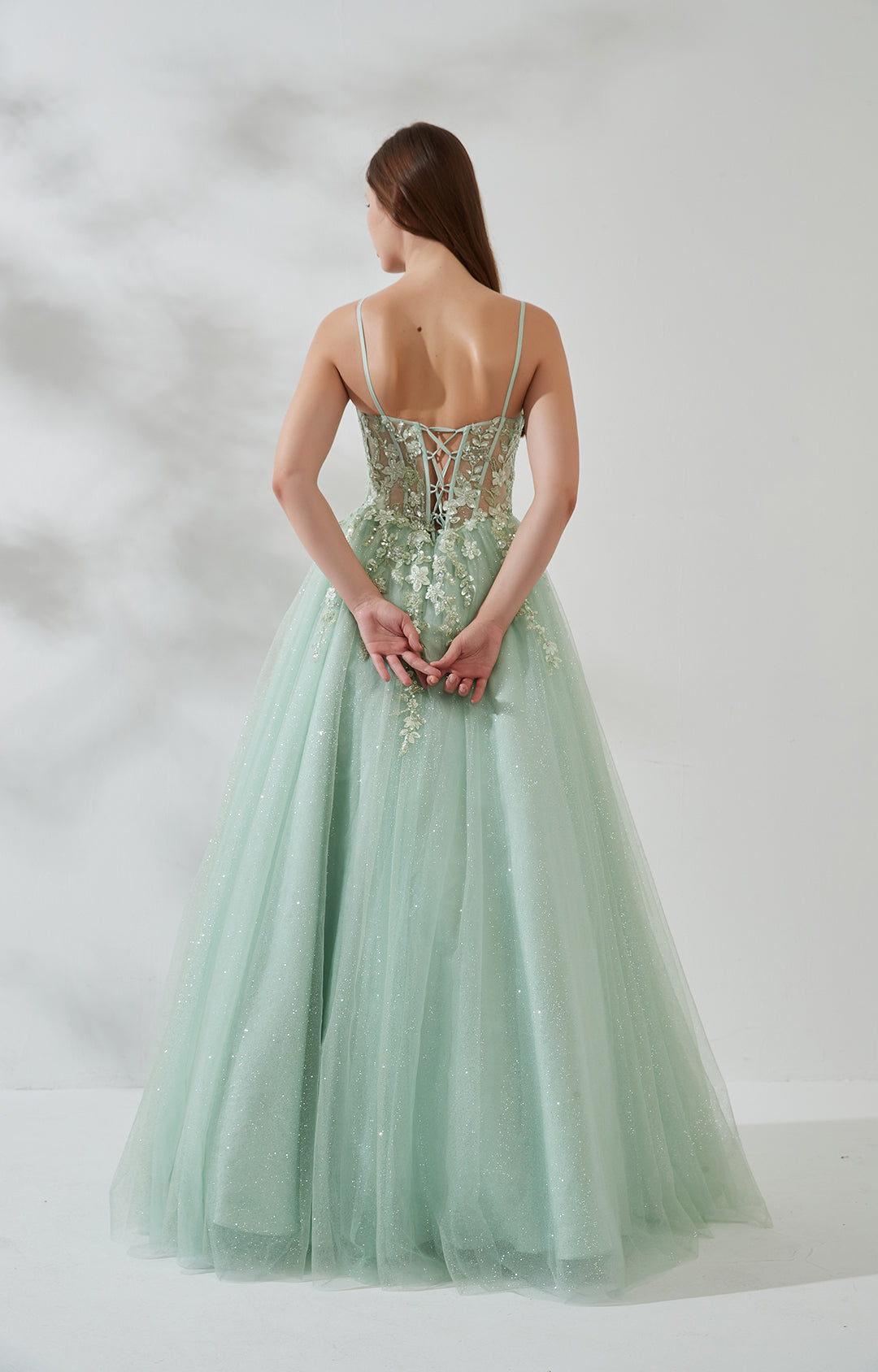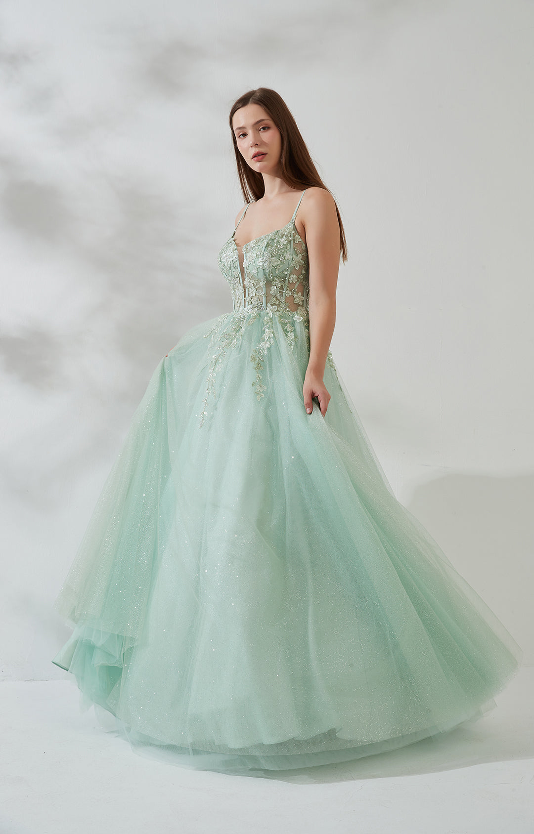 A-Linien-Ballkleid aus Tüllspitze mit glitzernden Applikationen und Schlitz