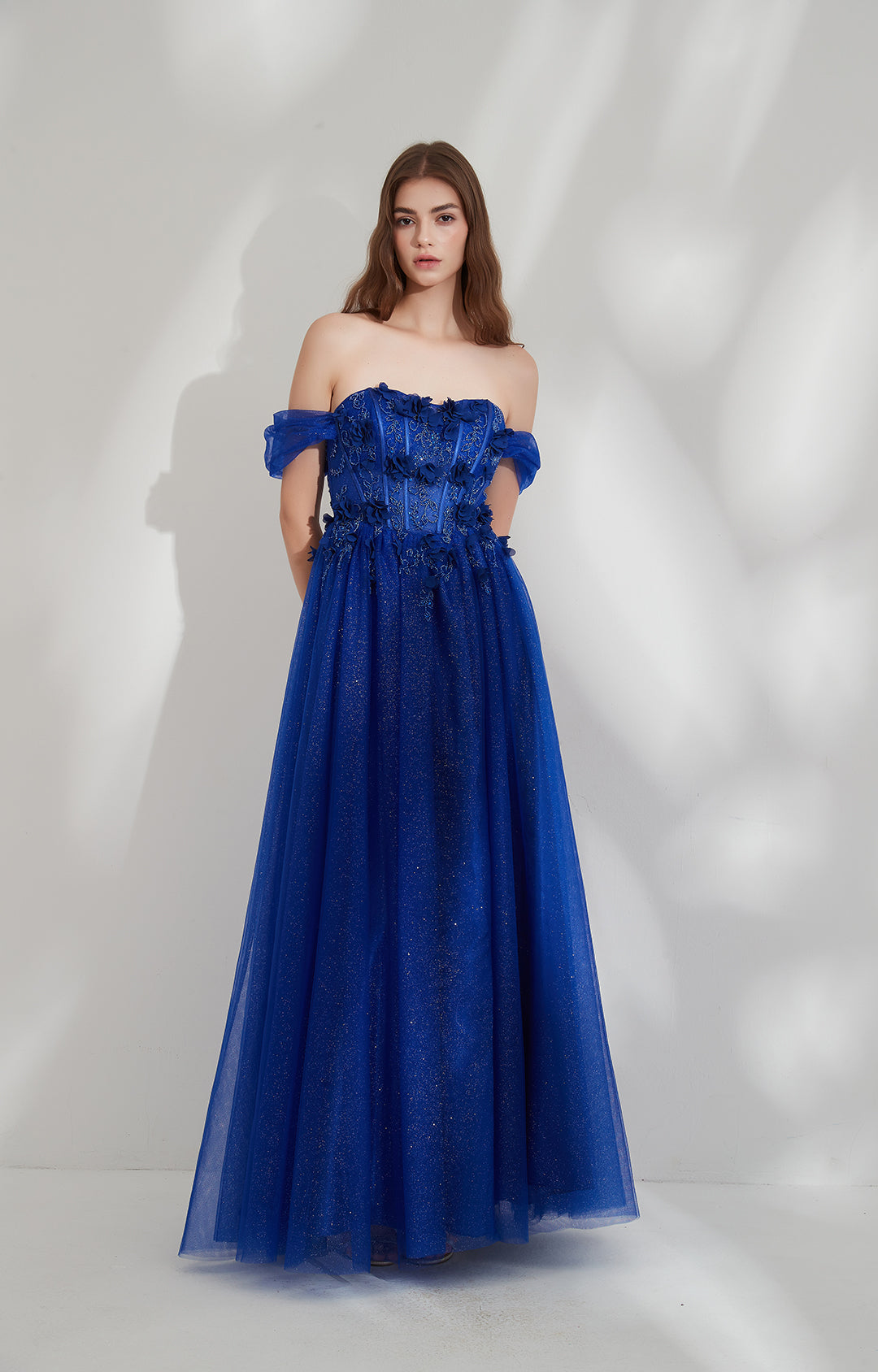 Dieses Kleid besticht durch leicht schimmerndes Netzgewebe, das einen Hauch von Fantasie und Glanz verleiht. Der enge Fischgräten-Stützstoff und der königsblaue Stoff zeugen von Noblesse und Eleganz, während die zarte Spitze und die Paillettenverzierung ein Gefühl von Luxus vermitteln.