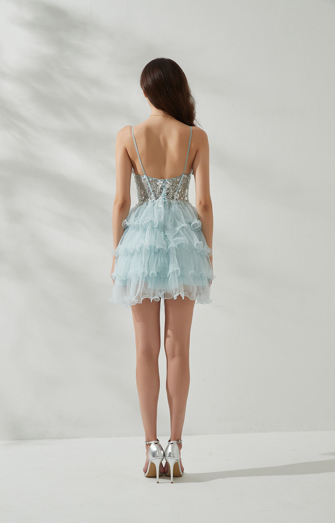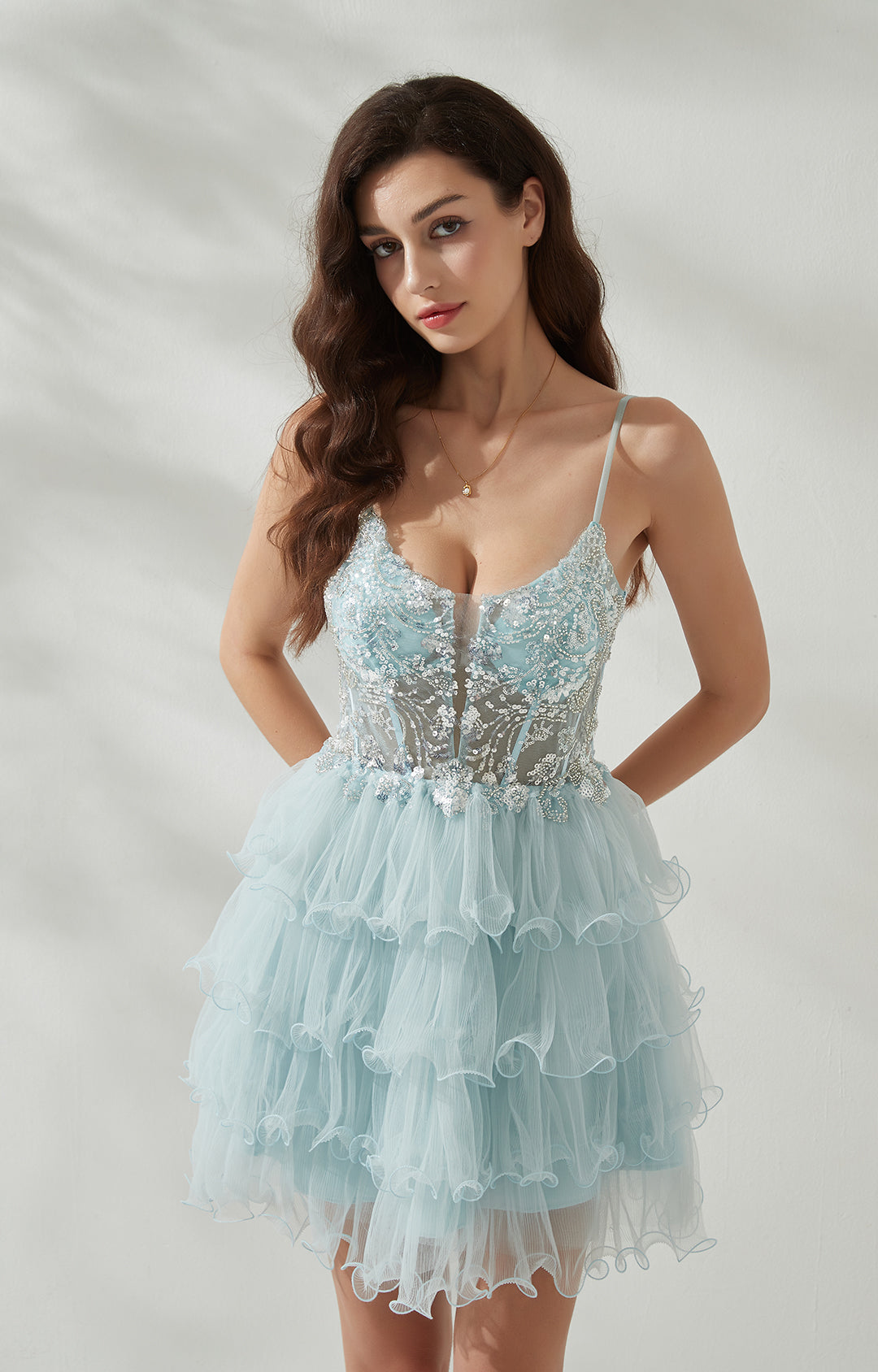 Spaghettiträger Rückenreißverschluss Pailletten Tüll Stufen Puffy Cocktail Minikleid