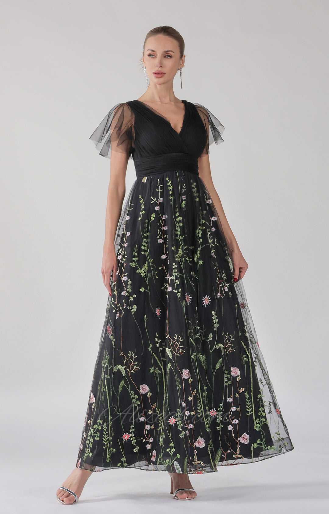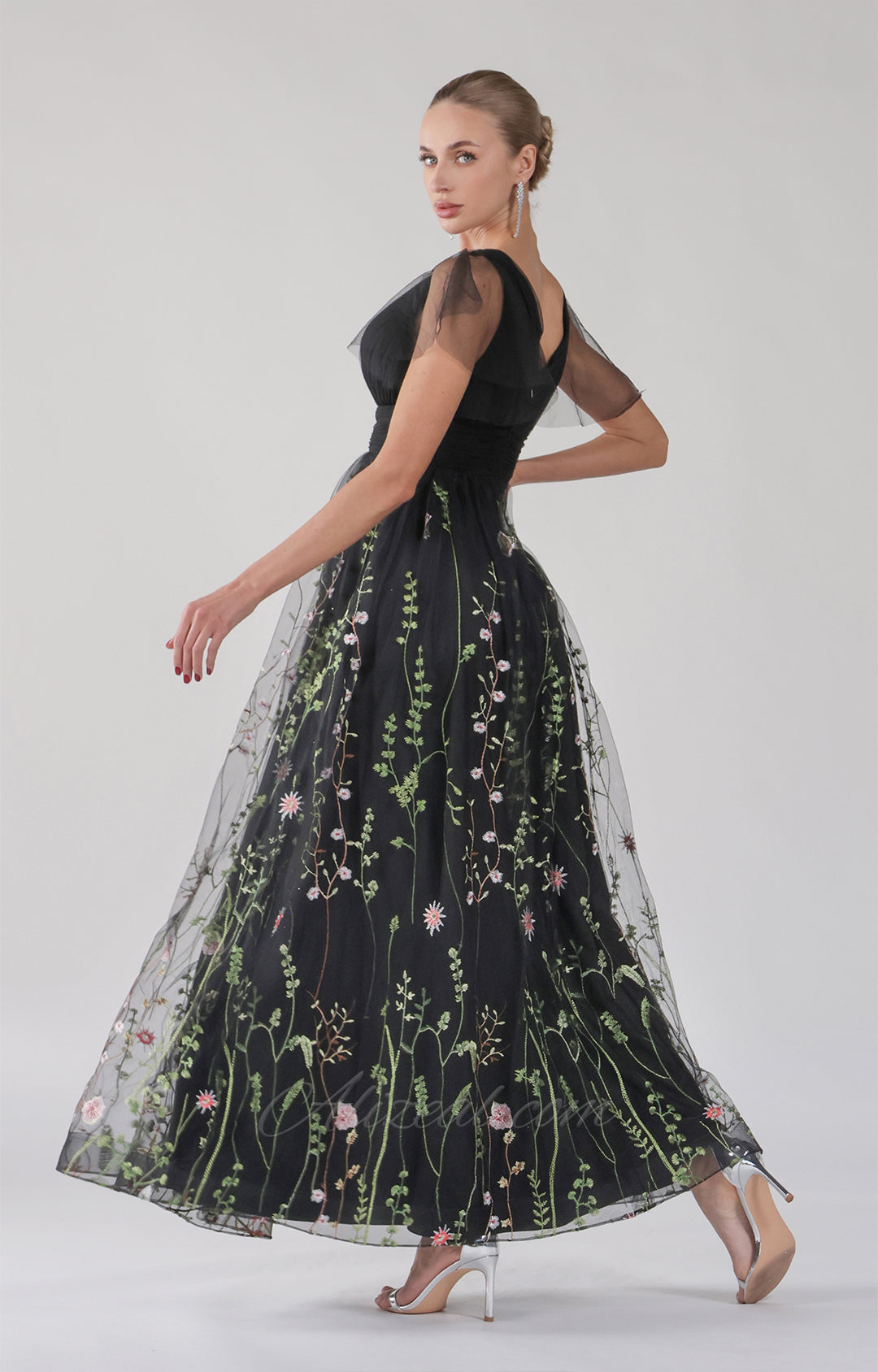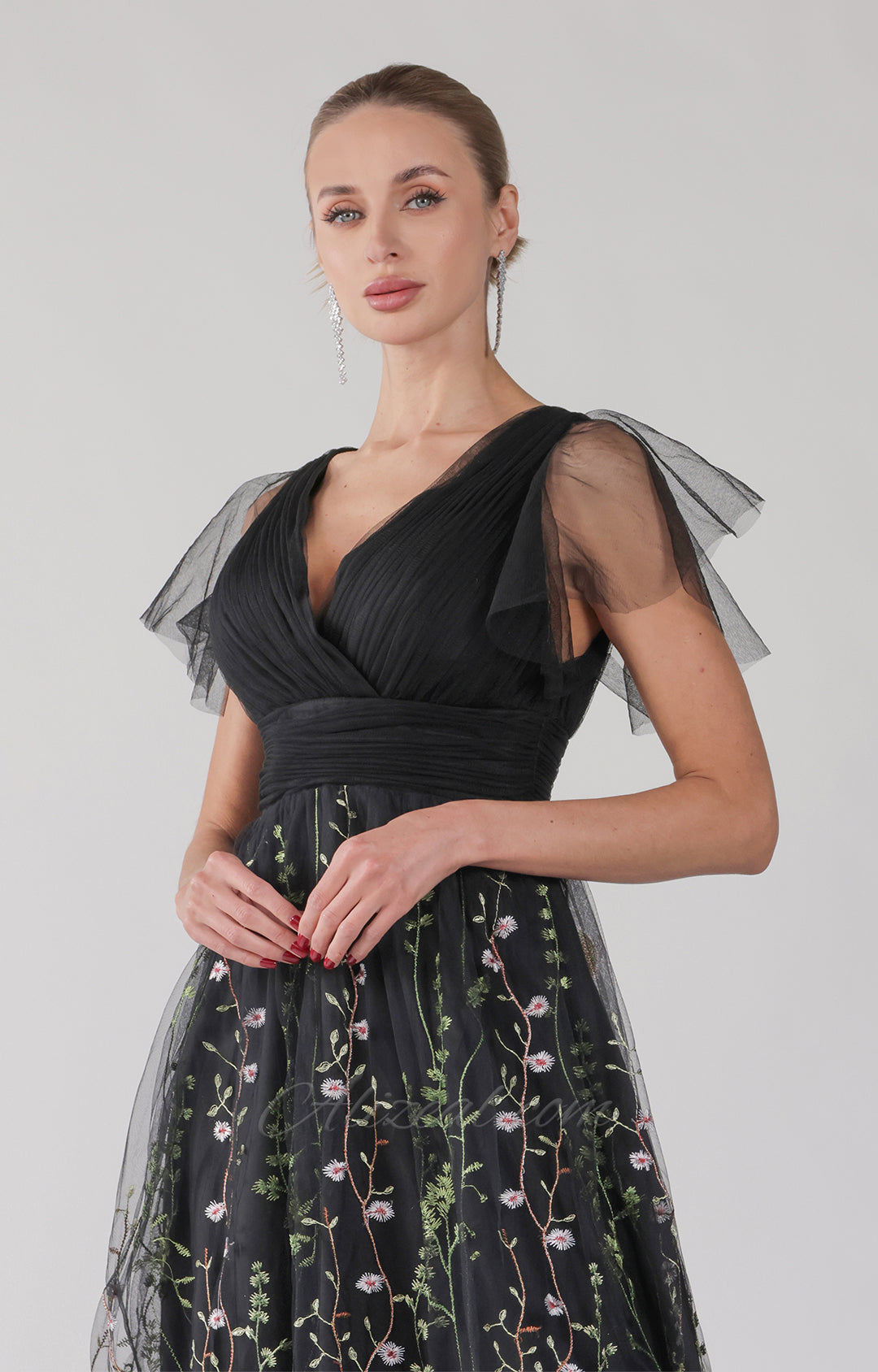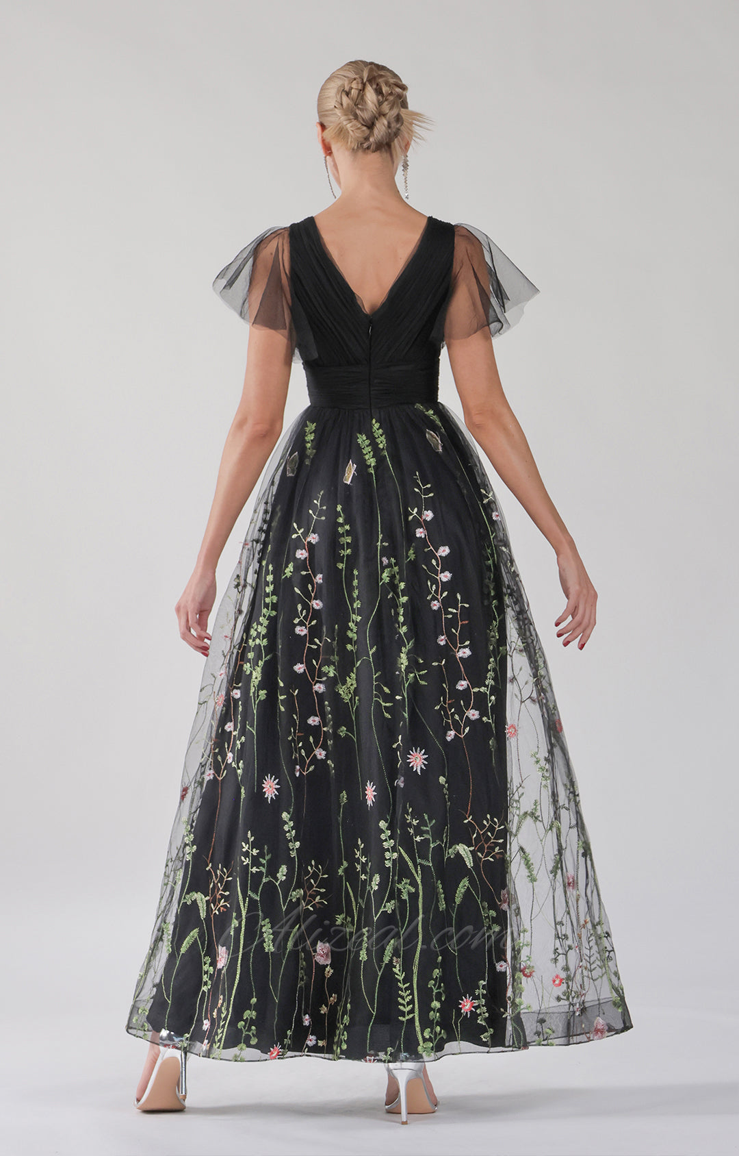 V-Neck A-Line Tulle Ruffle Sleeves Embroidered Maxi Dress