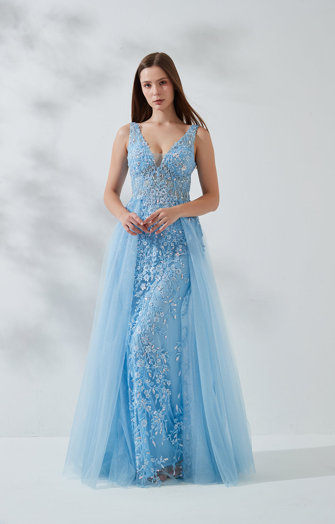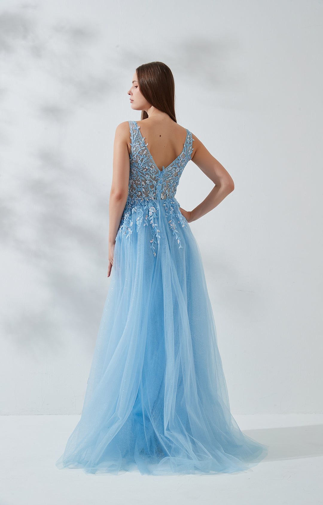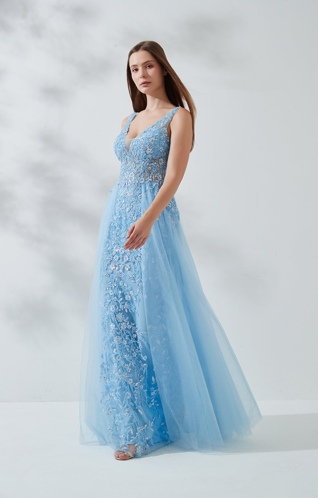 Ärmelloses Ballkleid mit V-Ausschnitt, breiten Trägern und bestickter Spitze und Pailletten