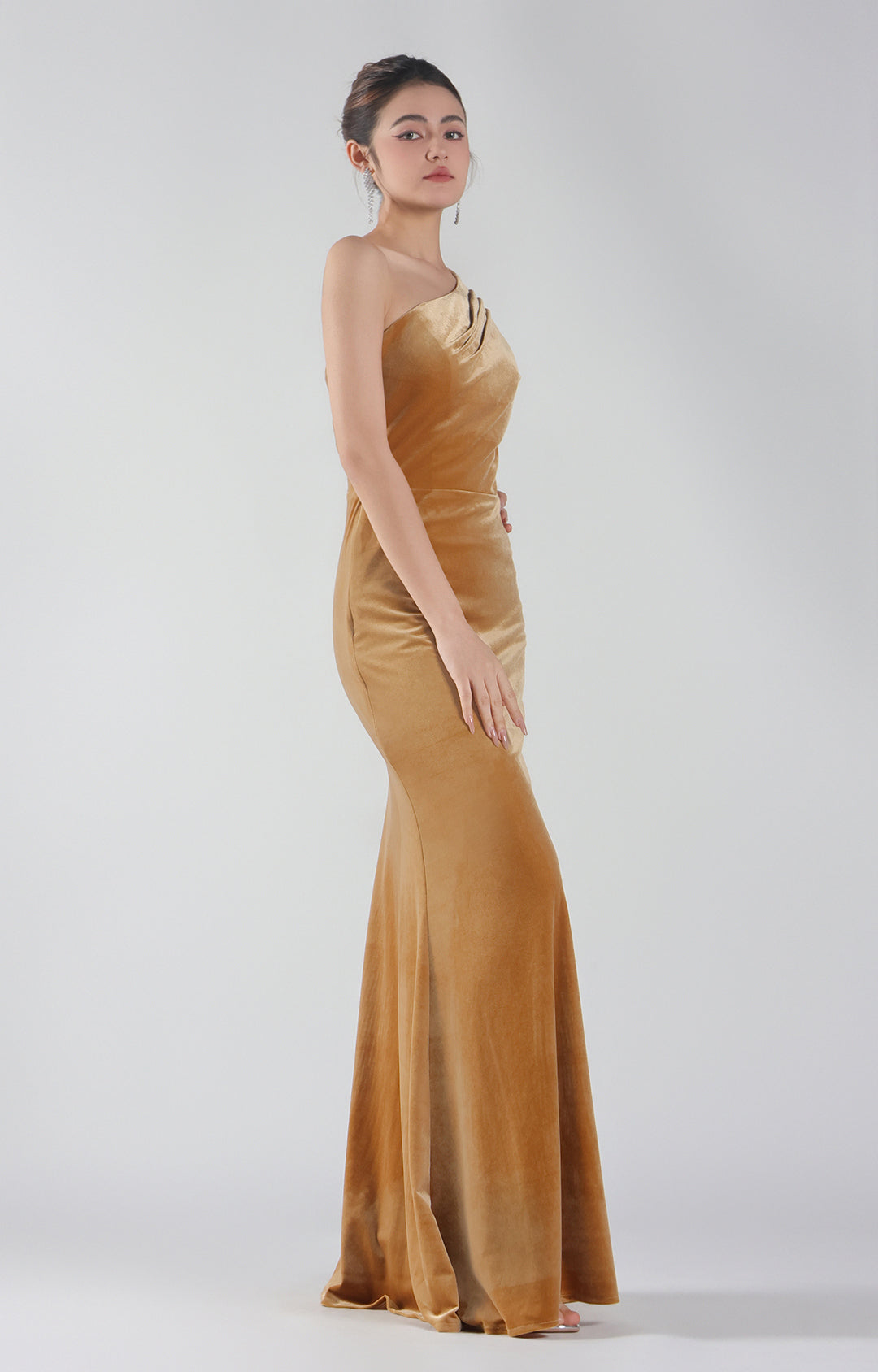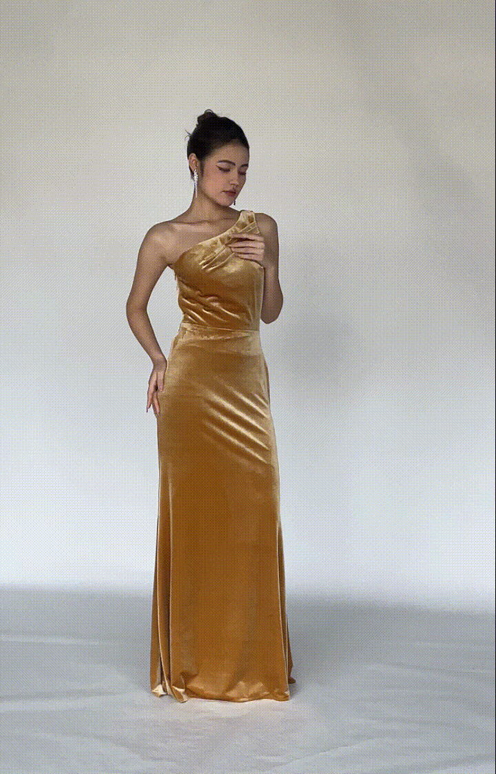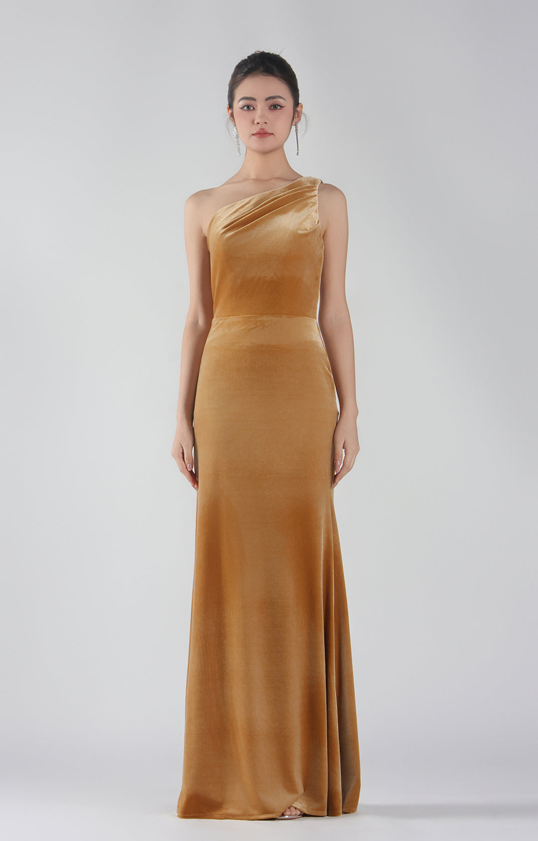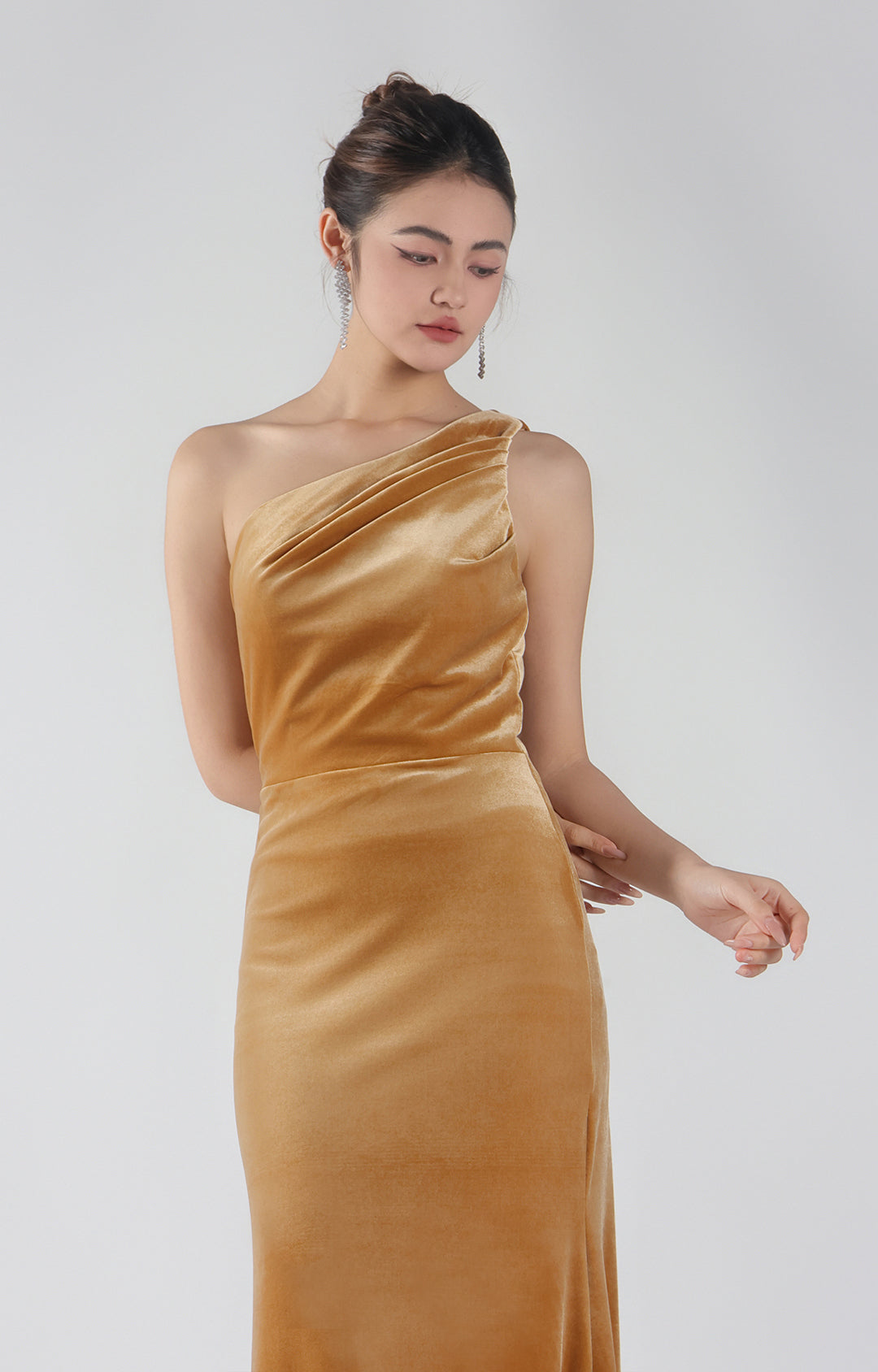 Asymmetrical One Shoulder Pleated Neckline Sheath Maxi Dress