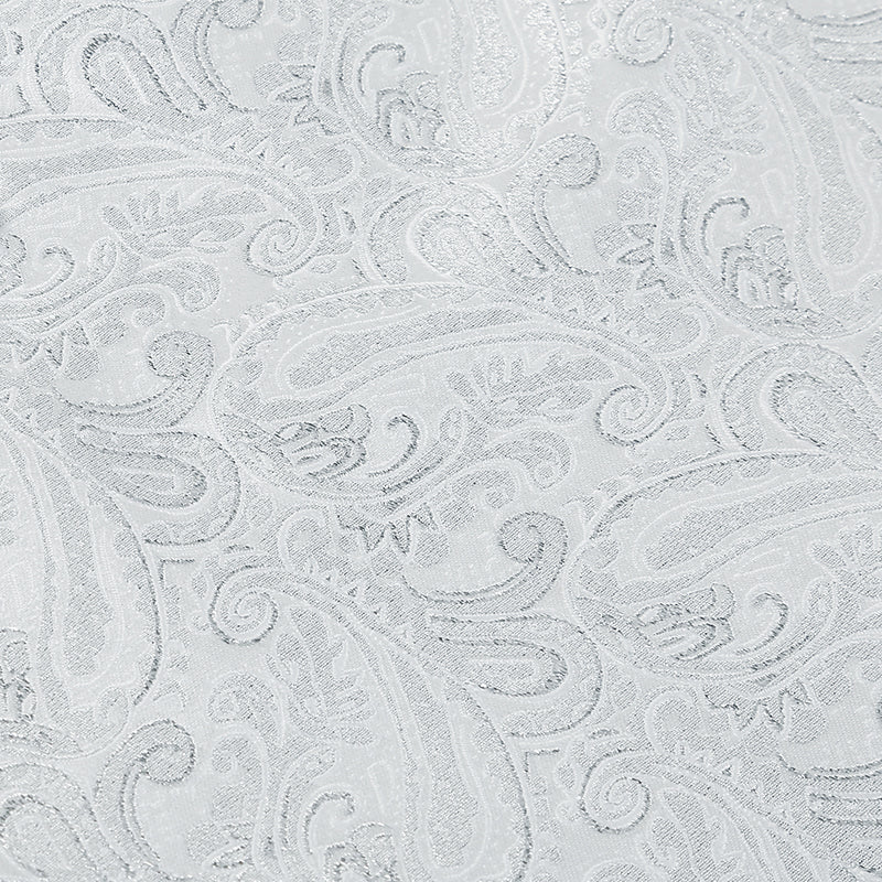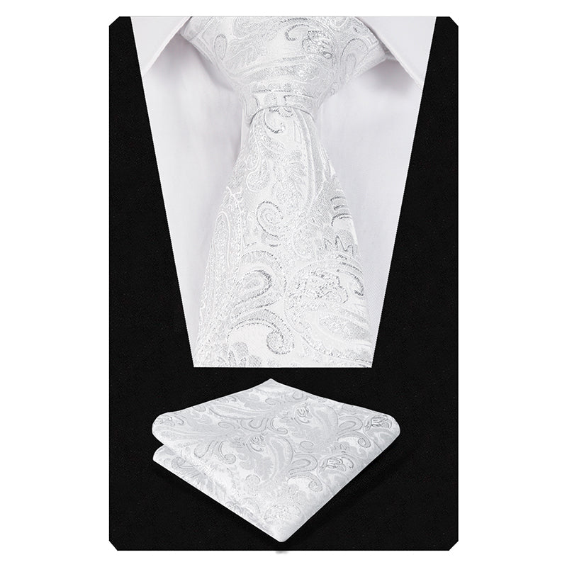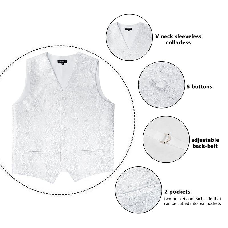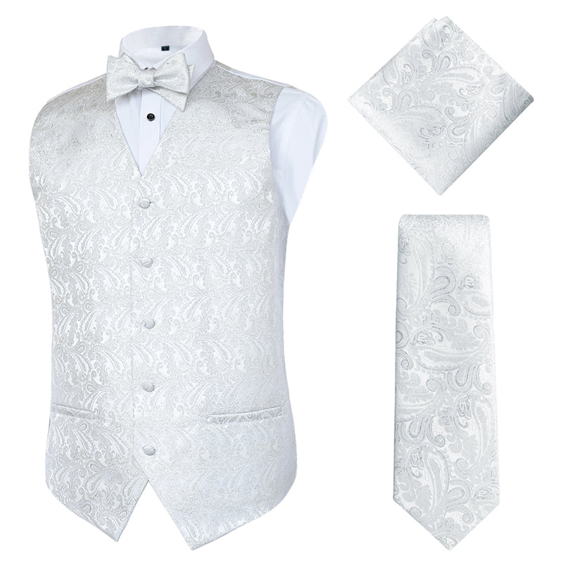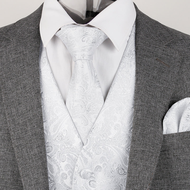 Dieses silberne Paisley-Set aus Weste und Krawatte macht Ihren Look einfach. Das silberne Das Paisley-Muster passt zu Hemden und Anzügen jeder Farbe und ermöglicht Ihnen, die Rollen für jeden Anlass zu wechseln. Dieses strahlend weiße Set ist ein Blickfang für Ihre formelle, legere oder geschäftliche Kleidung.