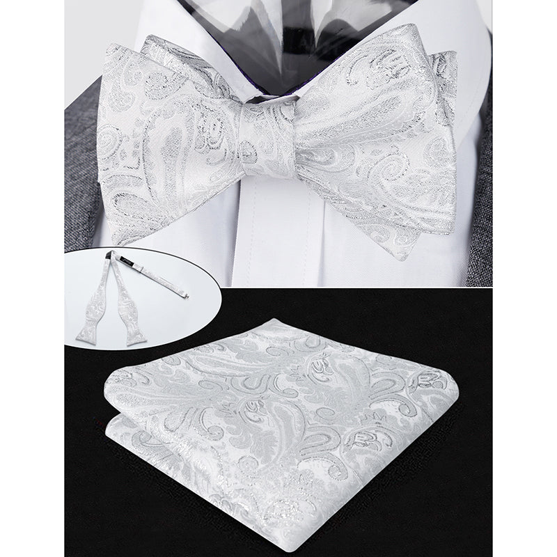 Herren-Anzugweste mit Paisley-Muster, selbstgebundene Fliege, 8,5 cm lange Krawatte und Einstecktuch-Set, 175 – glänzendes Silber