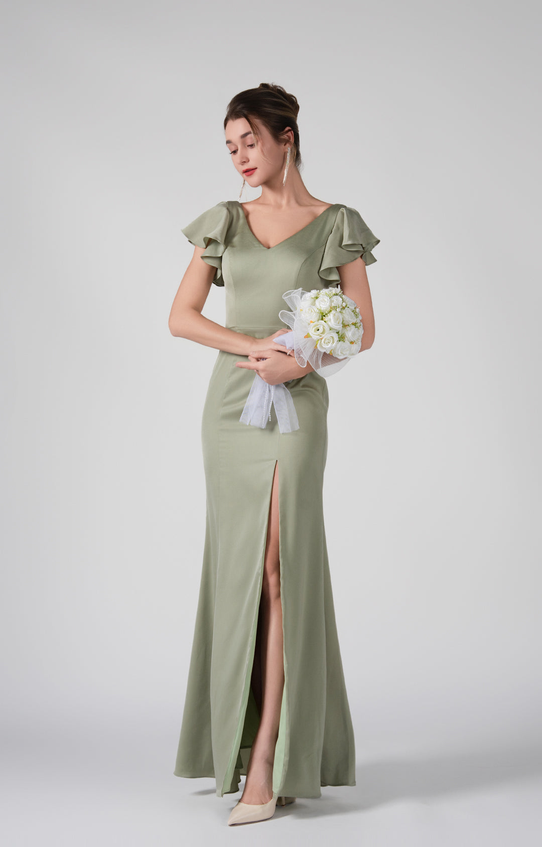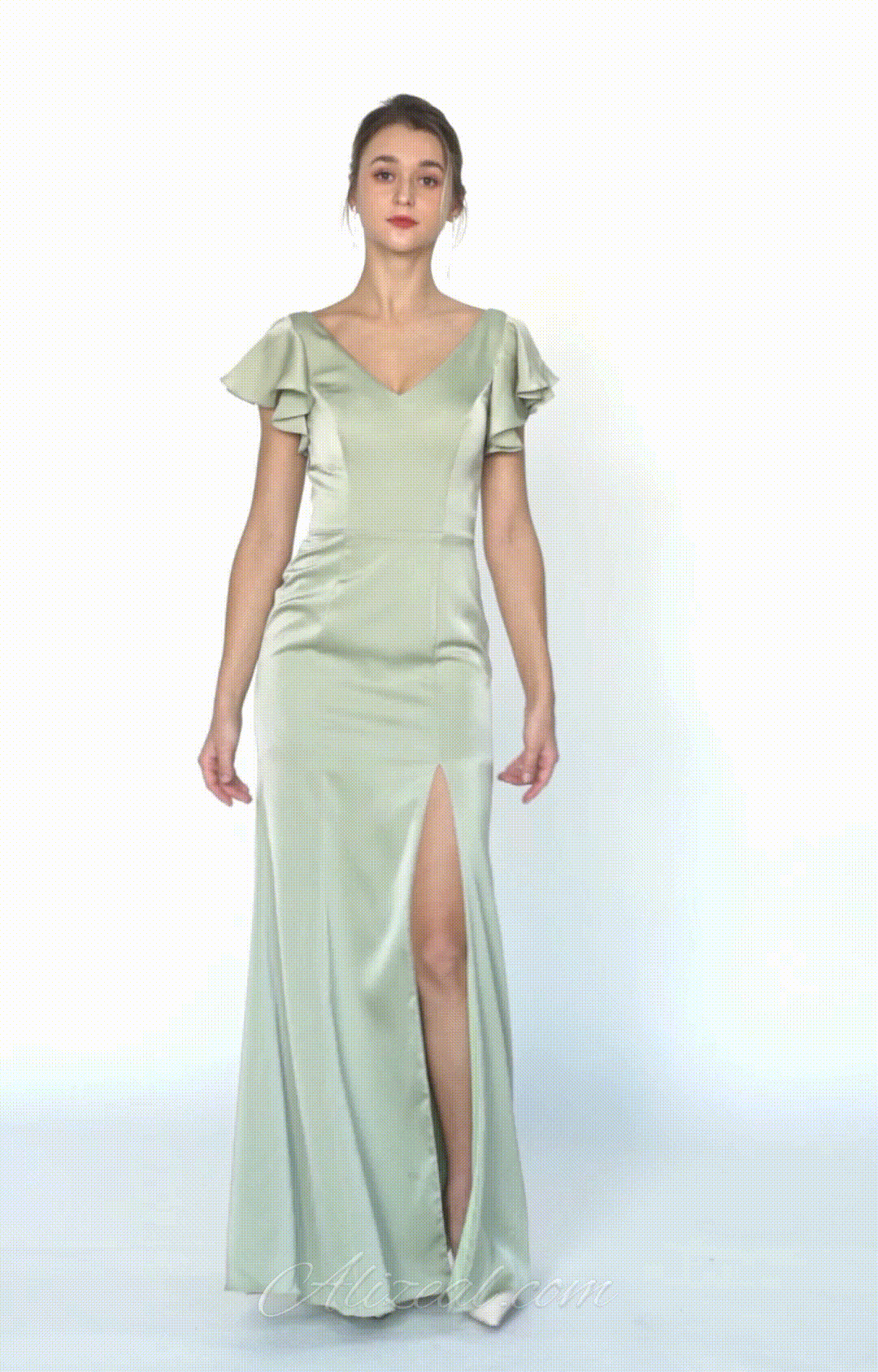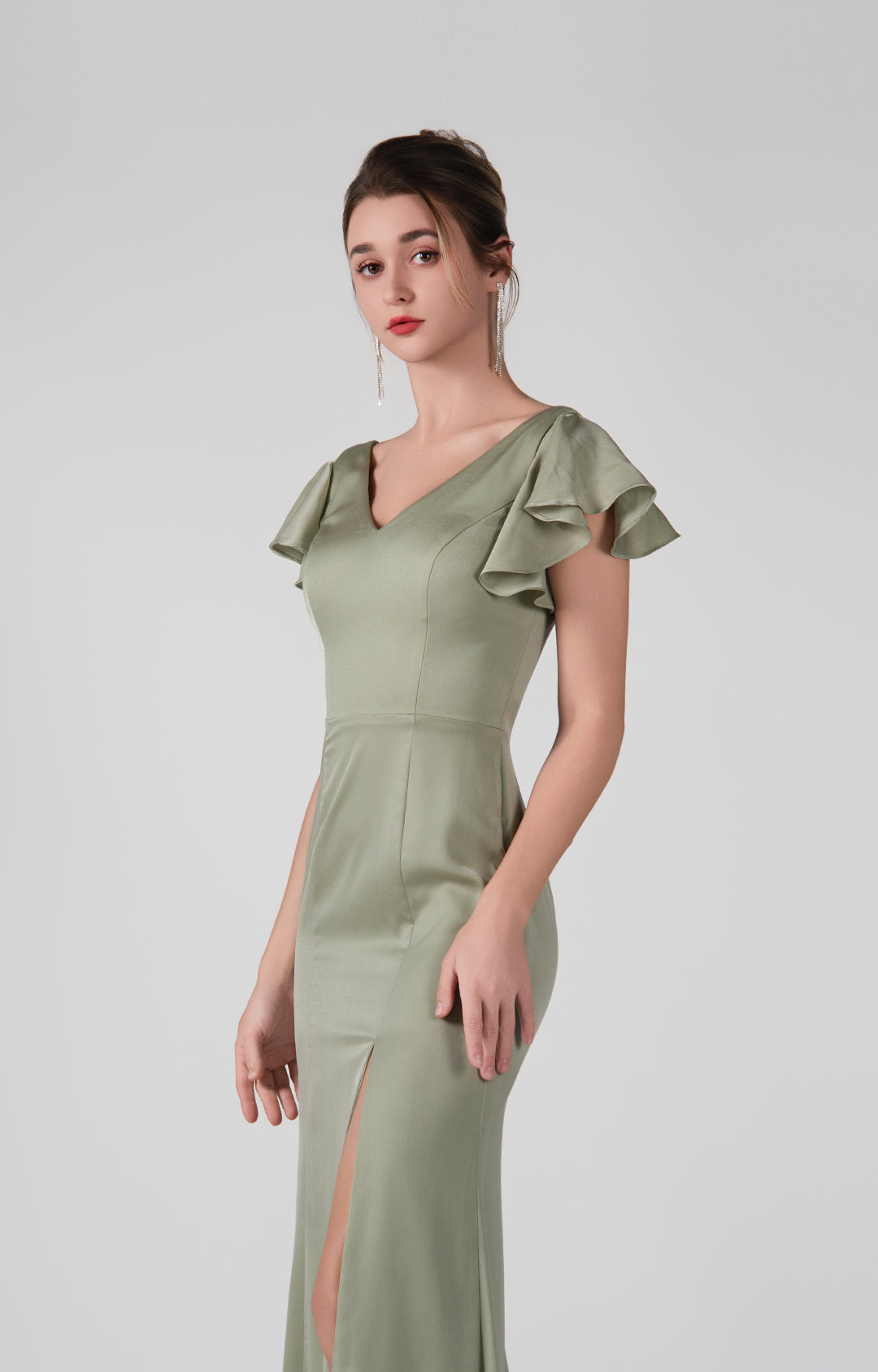 Flutter Sleeves V-Neck Fitted Front Slit Dresses