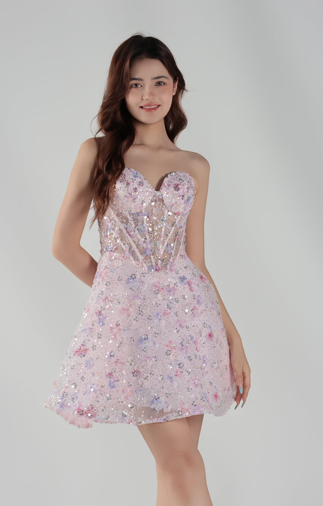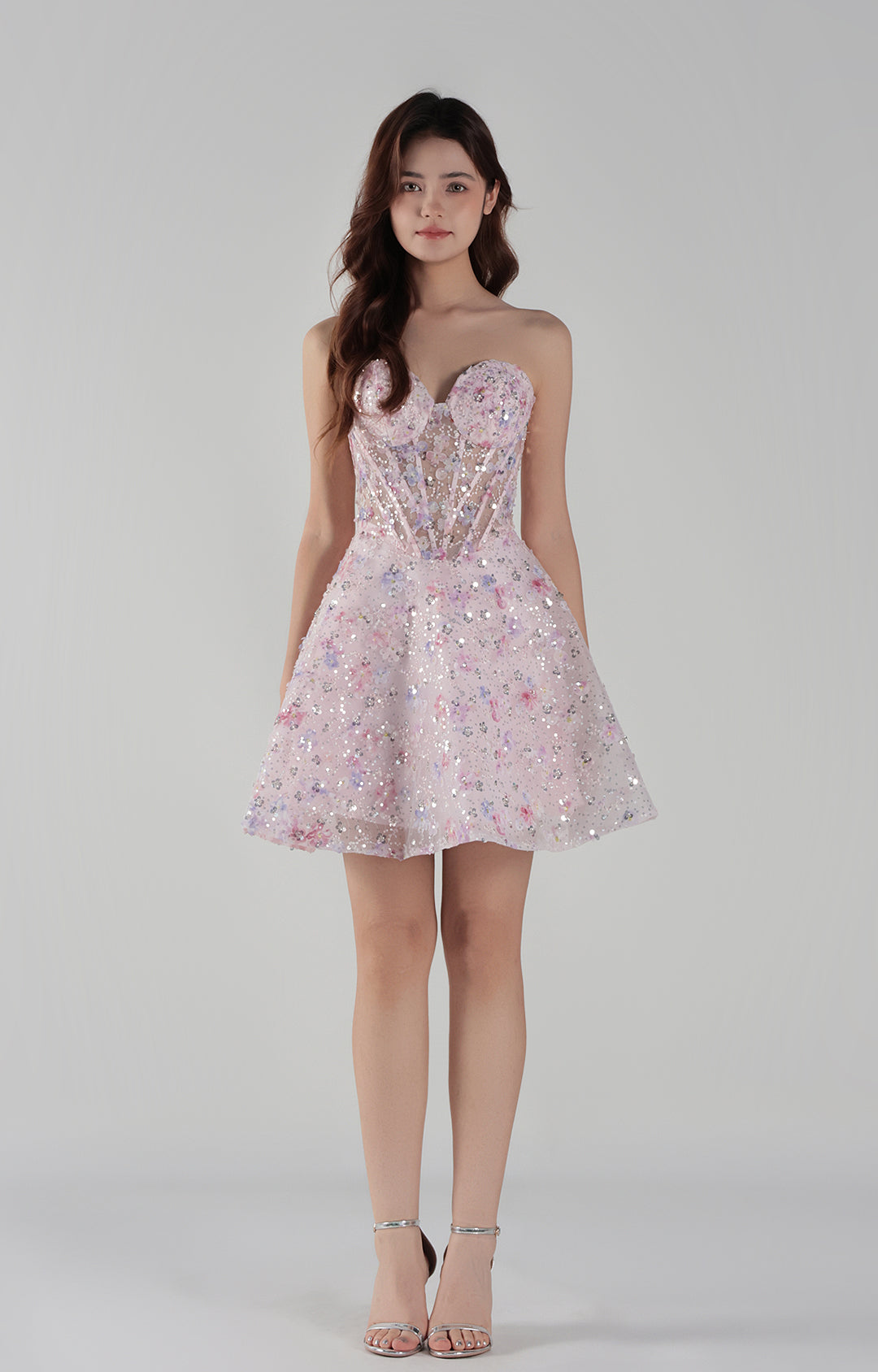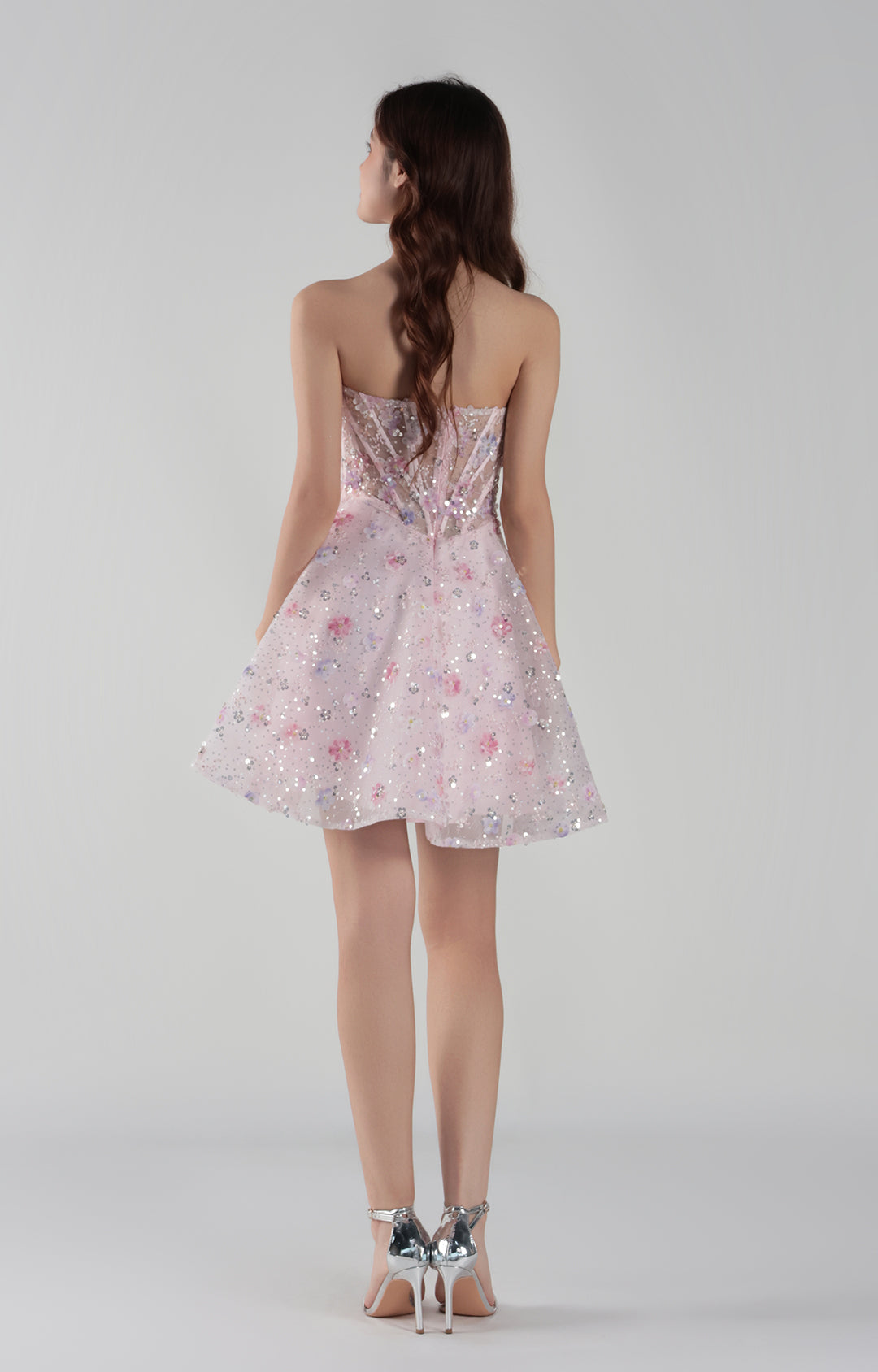 Heart Collar Strapless Sparkling Floral Sequins Flared Mini Dress