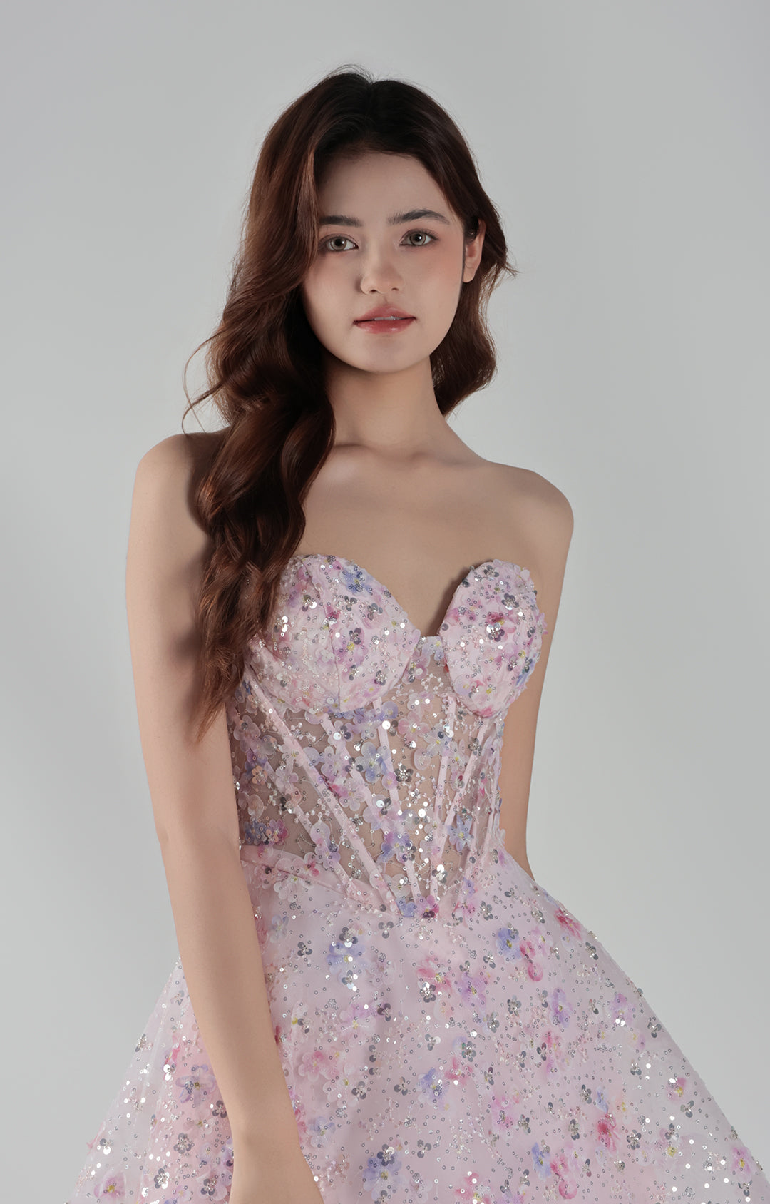 This beautiful dress is crafted from printed tulle combined with shimmering sequins, offering a lightweight and breathable feel while providing a radiant, eye-catching effect.