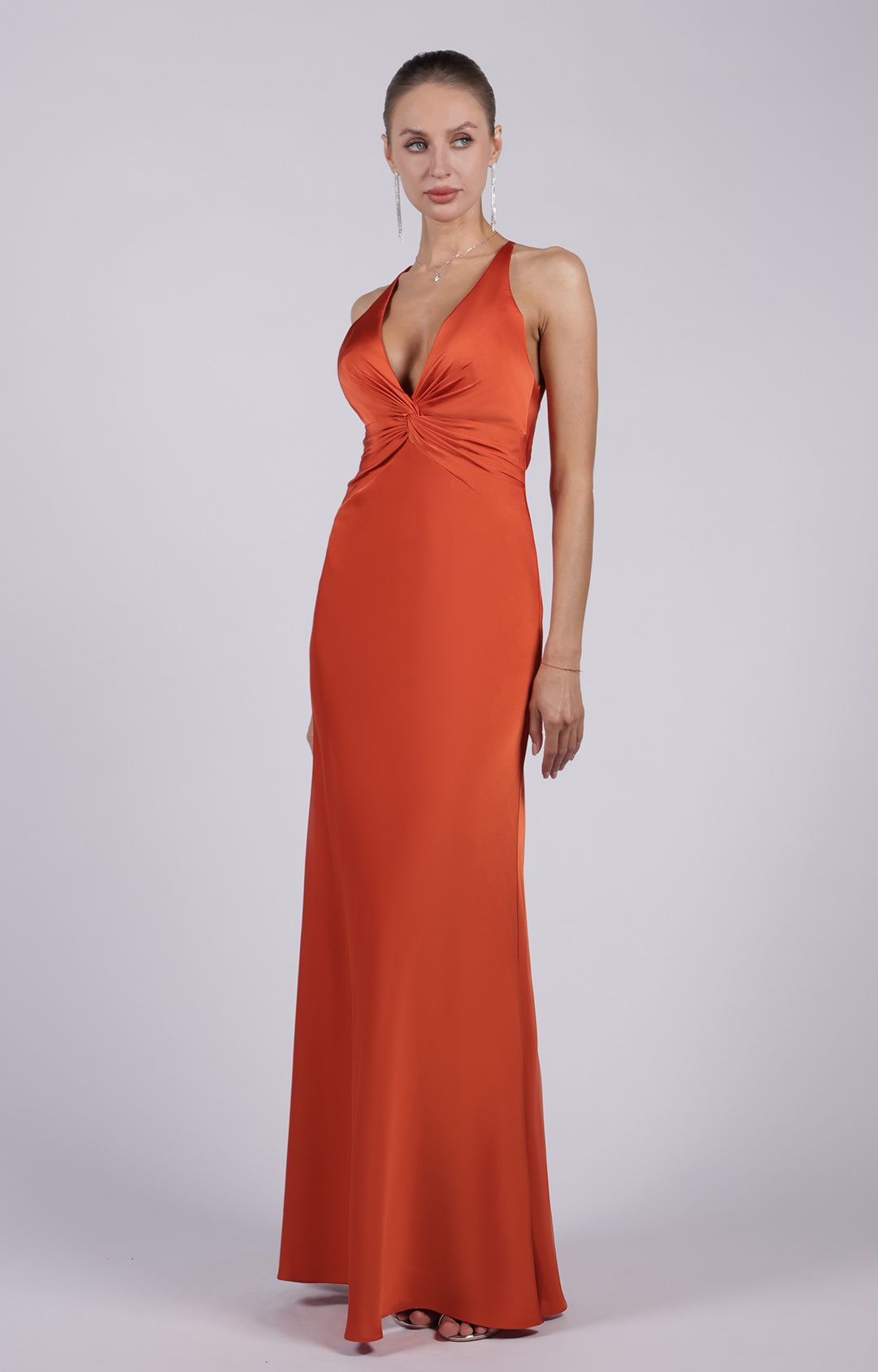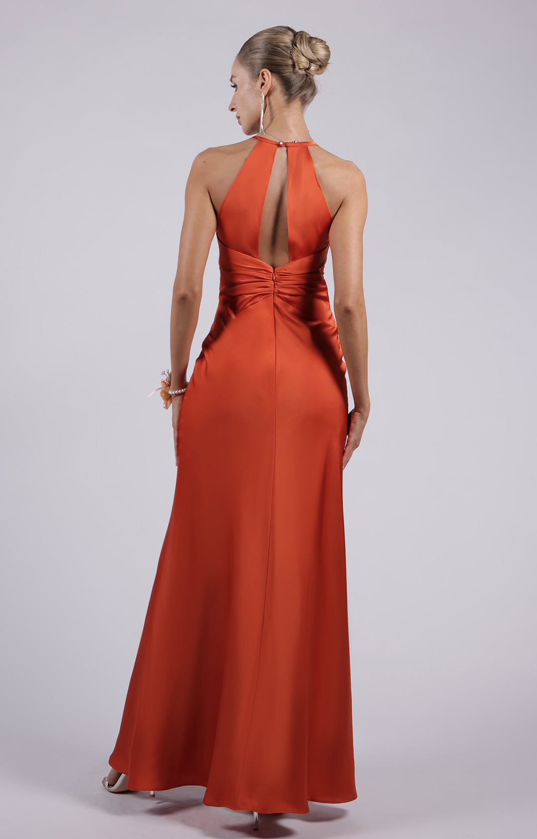 Crafted from acetate-like fabric, this gown offers a luxurious feel with a soft, smooth finish.