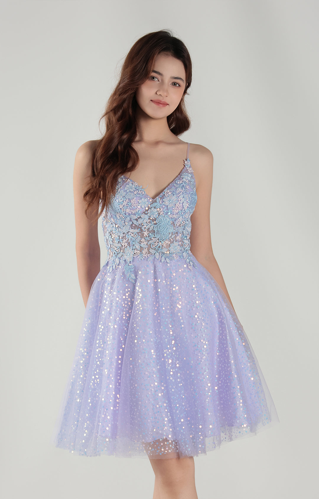 A-line V-Neck Wide Straps Sequins Appliqued Puffy Mini Dress