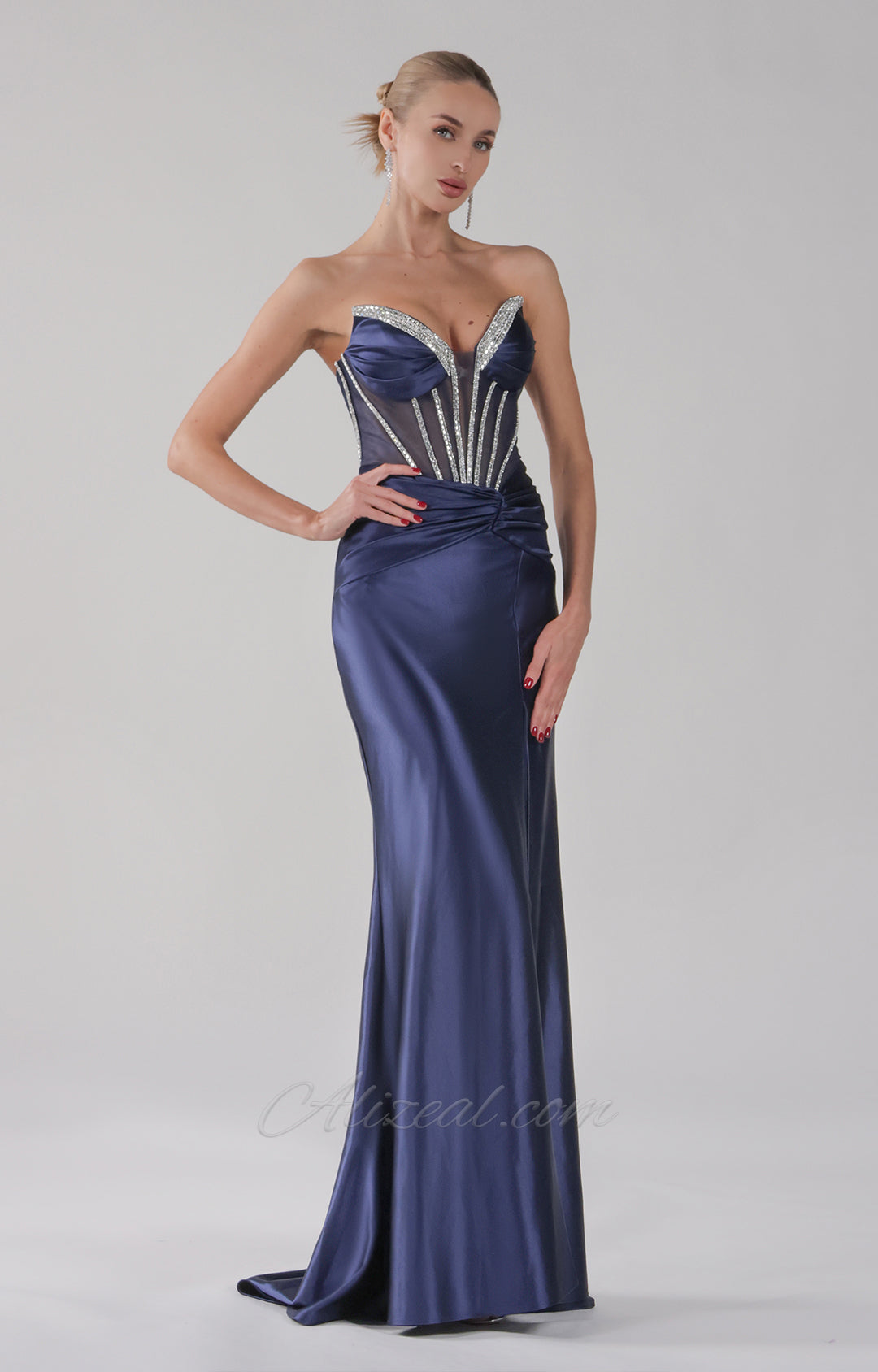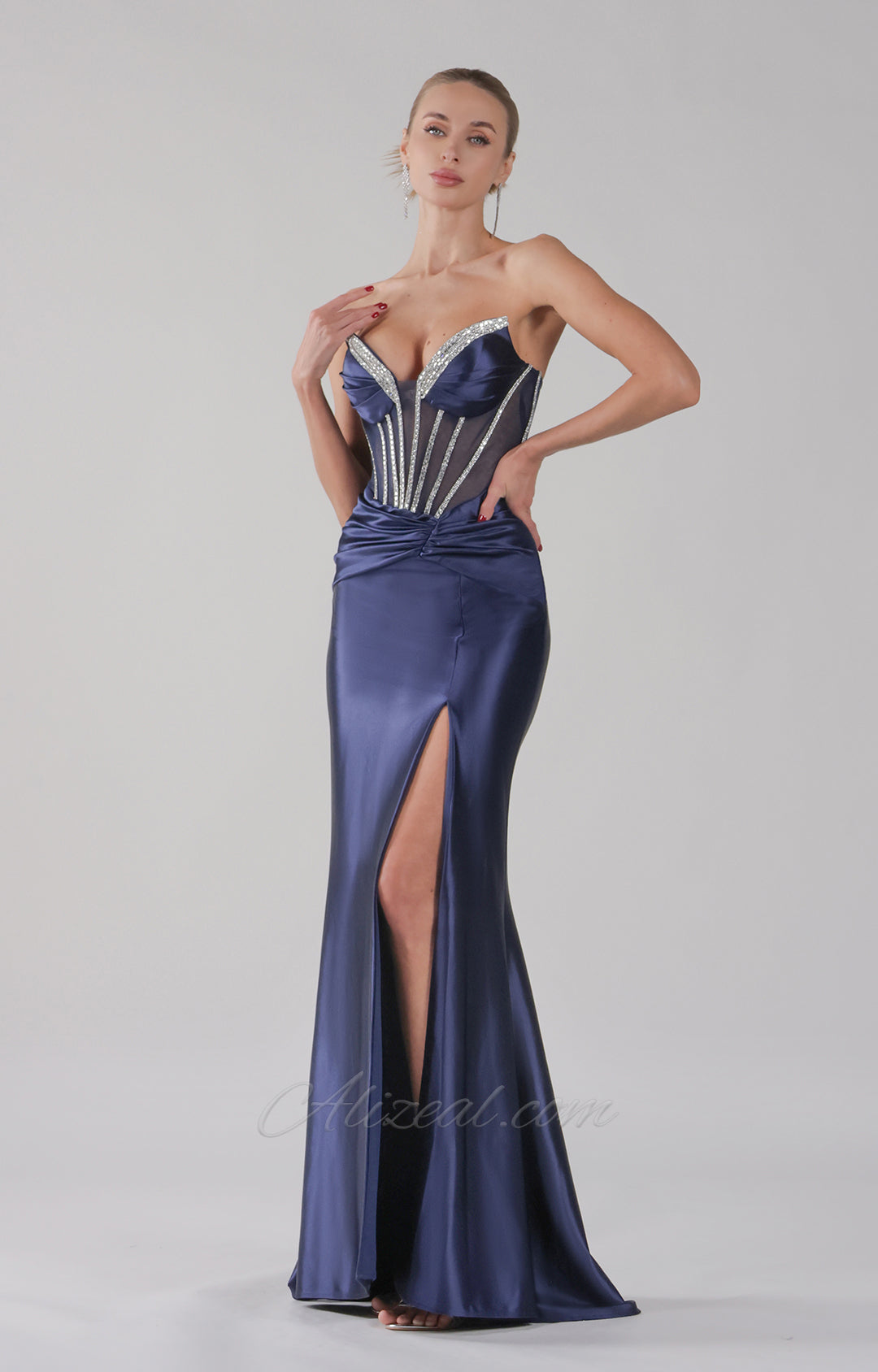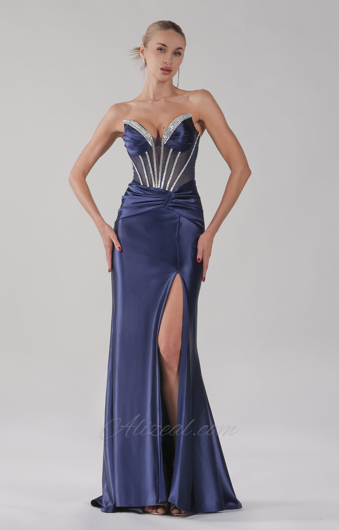 Strapless V-Neck High Split See-Through Corset Pleats Evening Dress