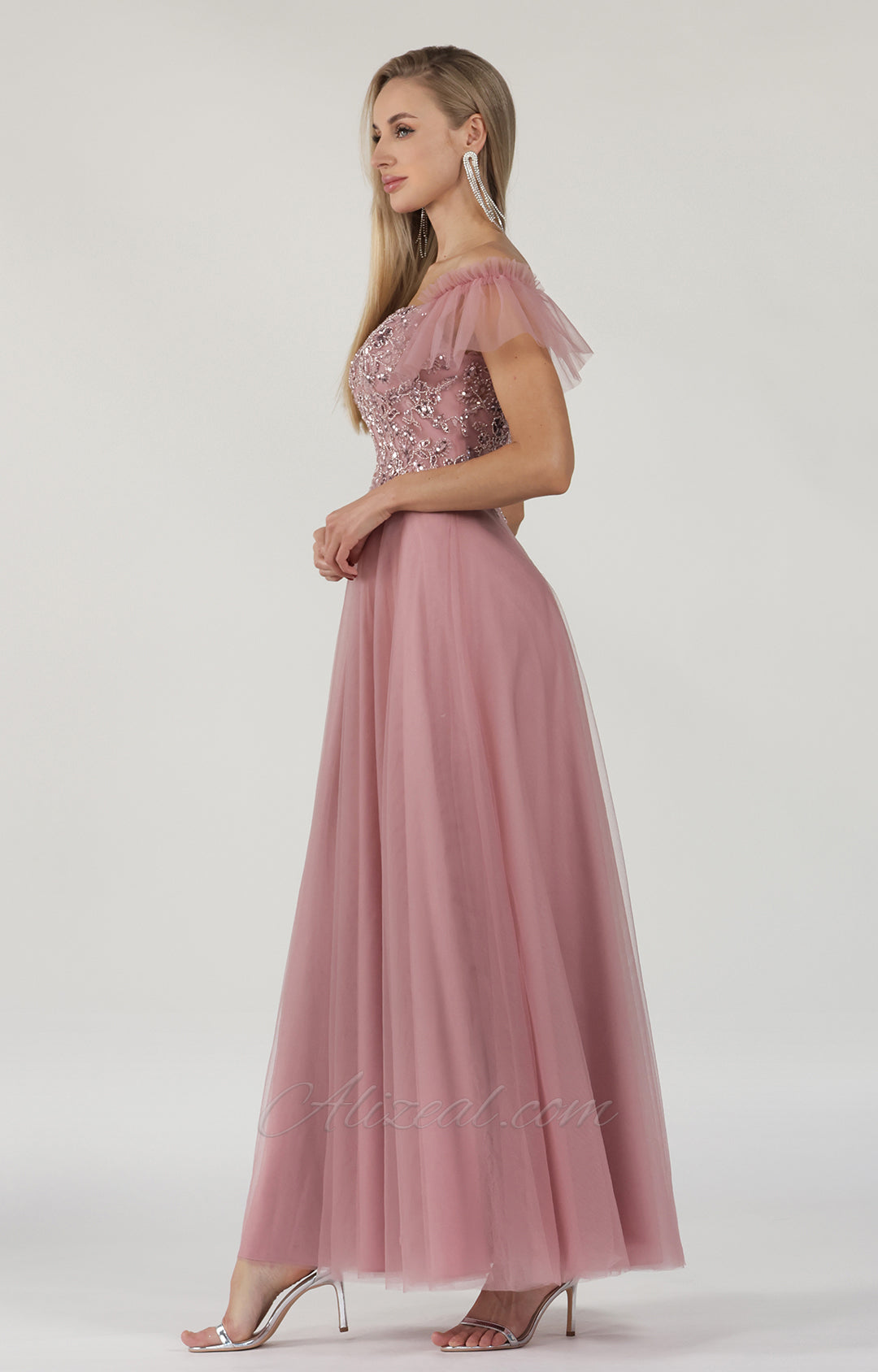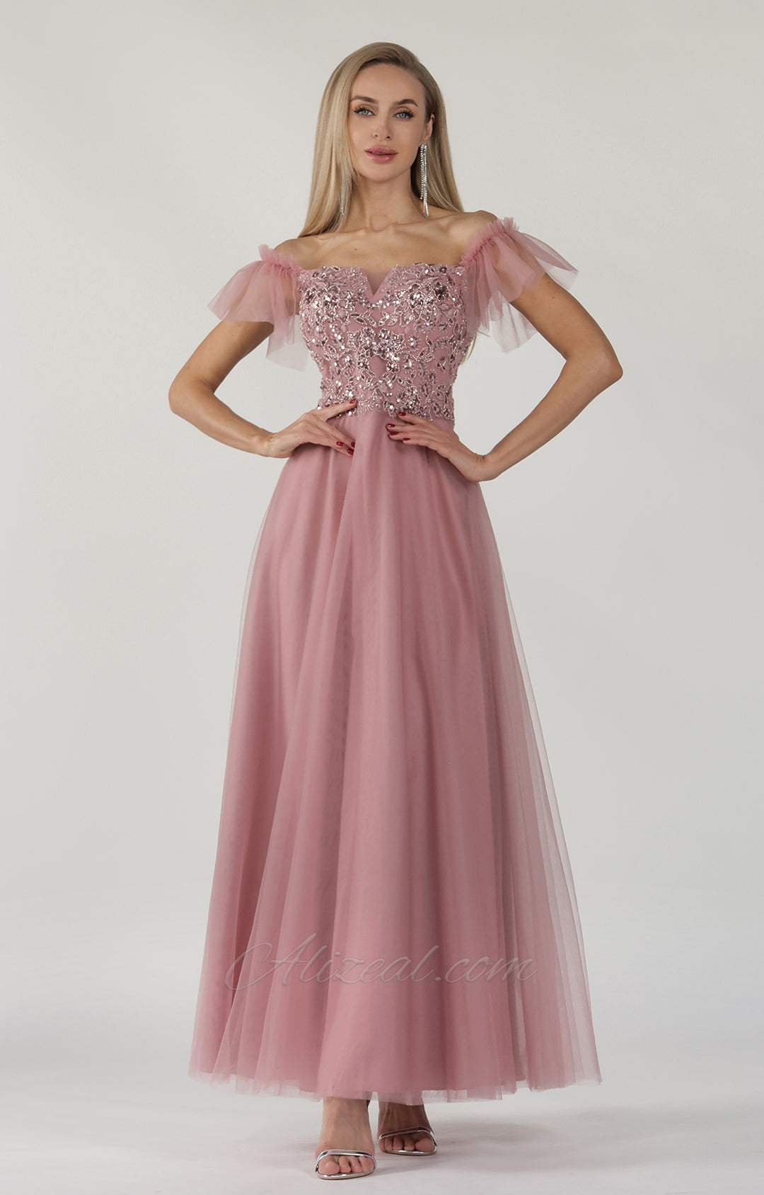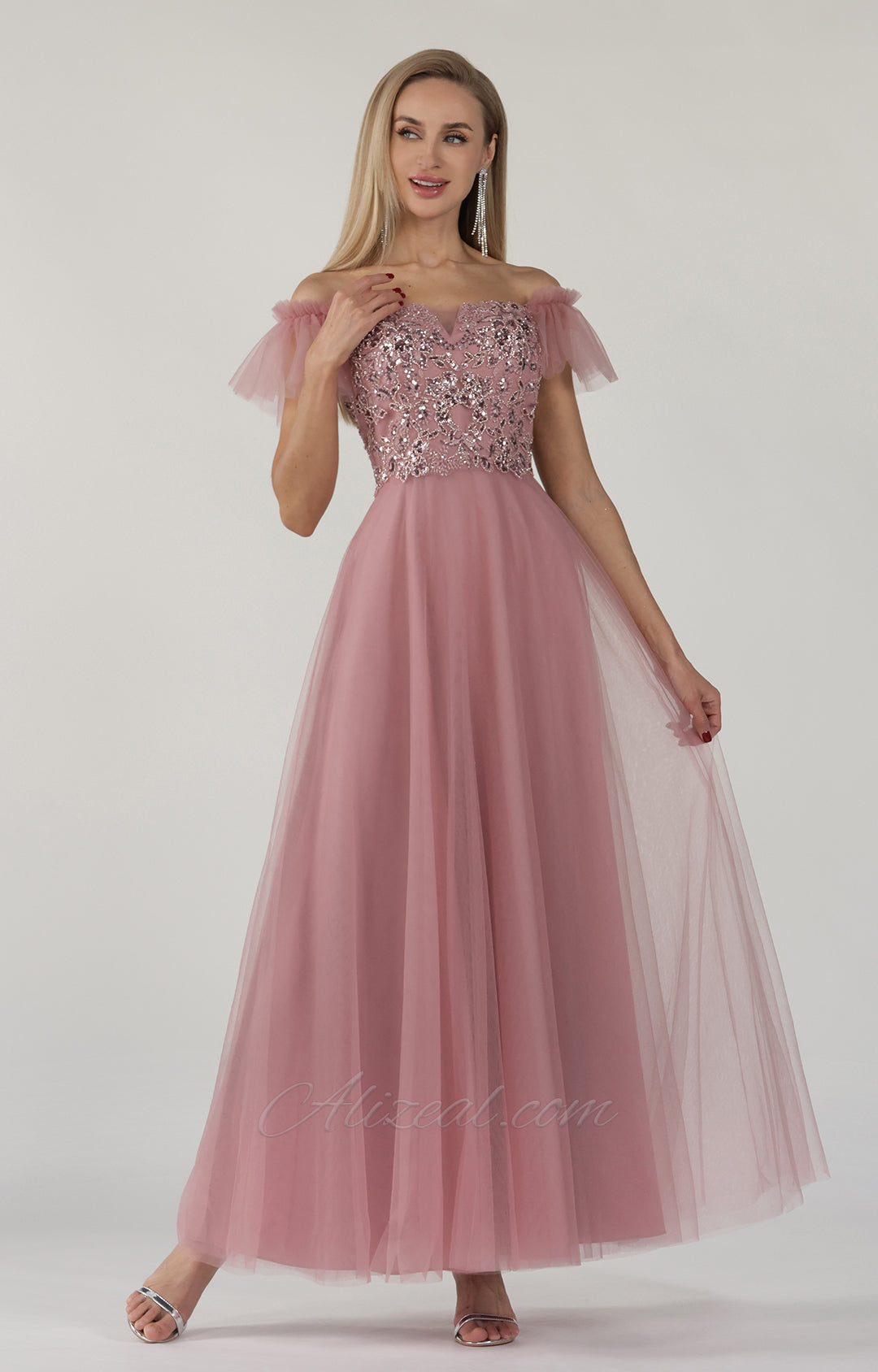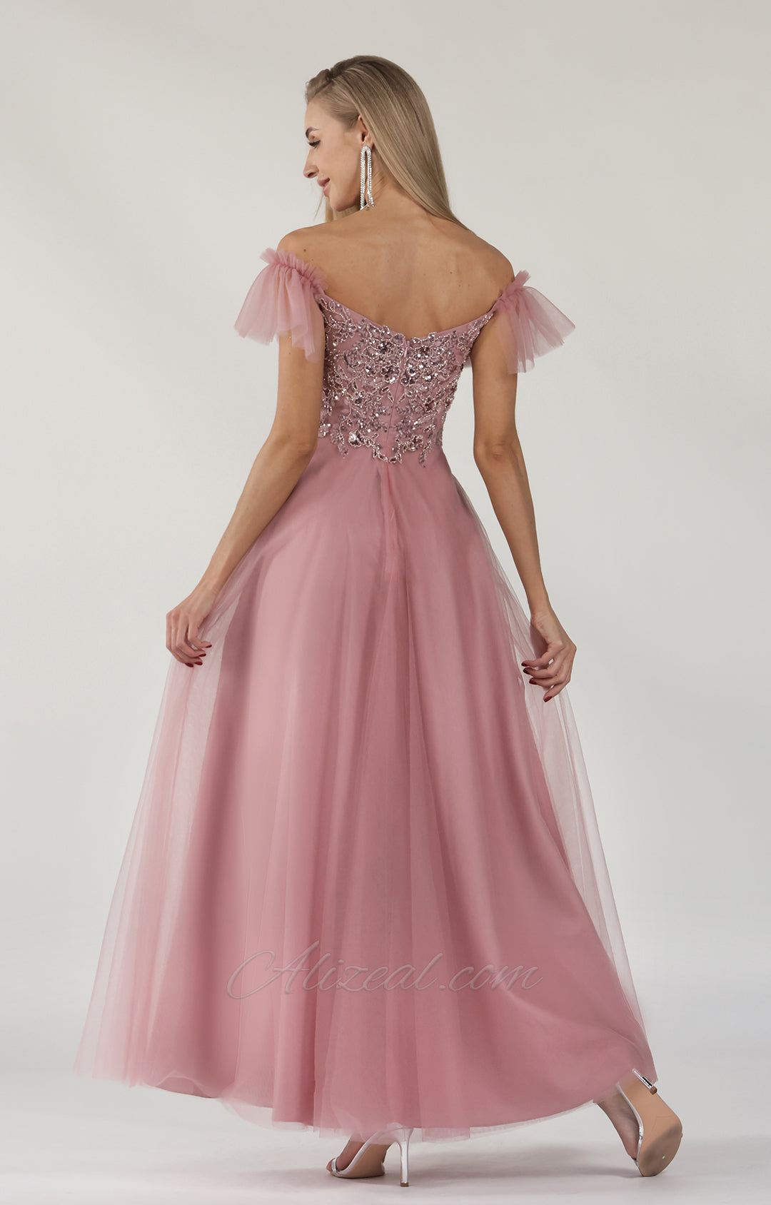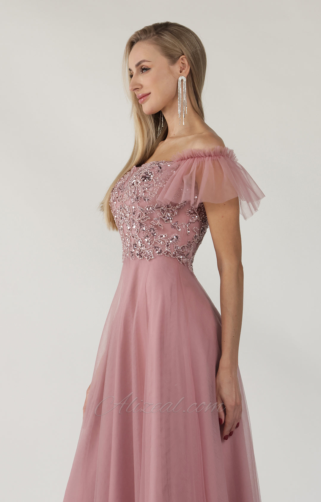 Off Shoulder A-Line Small V-Neck Tulle Appliqued Prom Dress