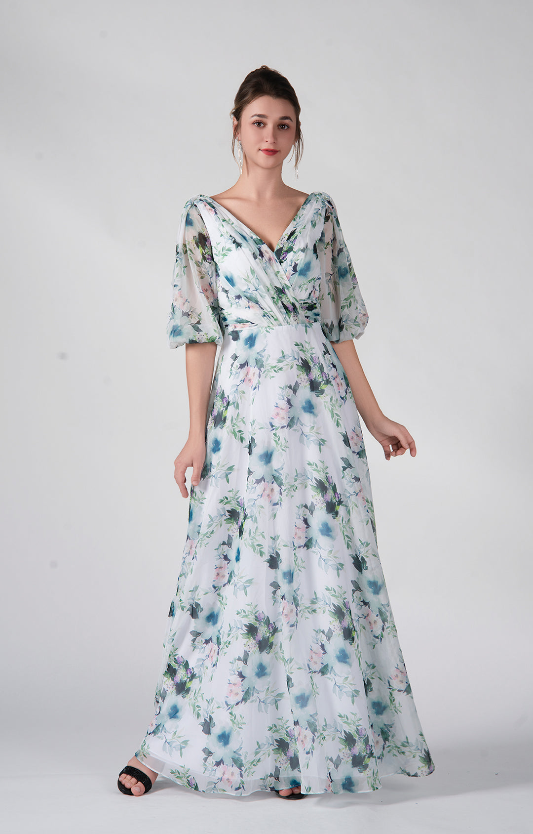 A-Line V-Neck Puffy Cut-Out Sleeves Pleats Maxi Dress