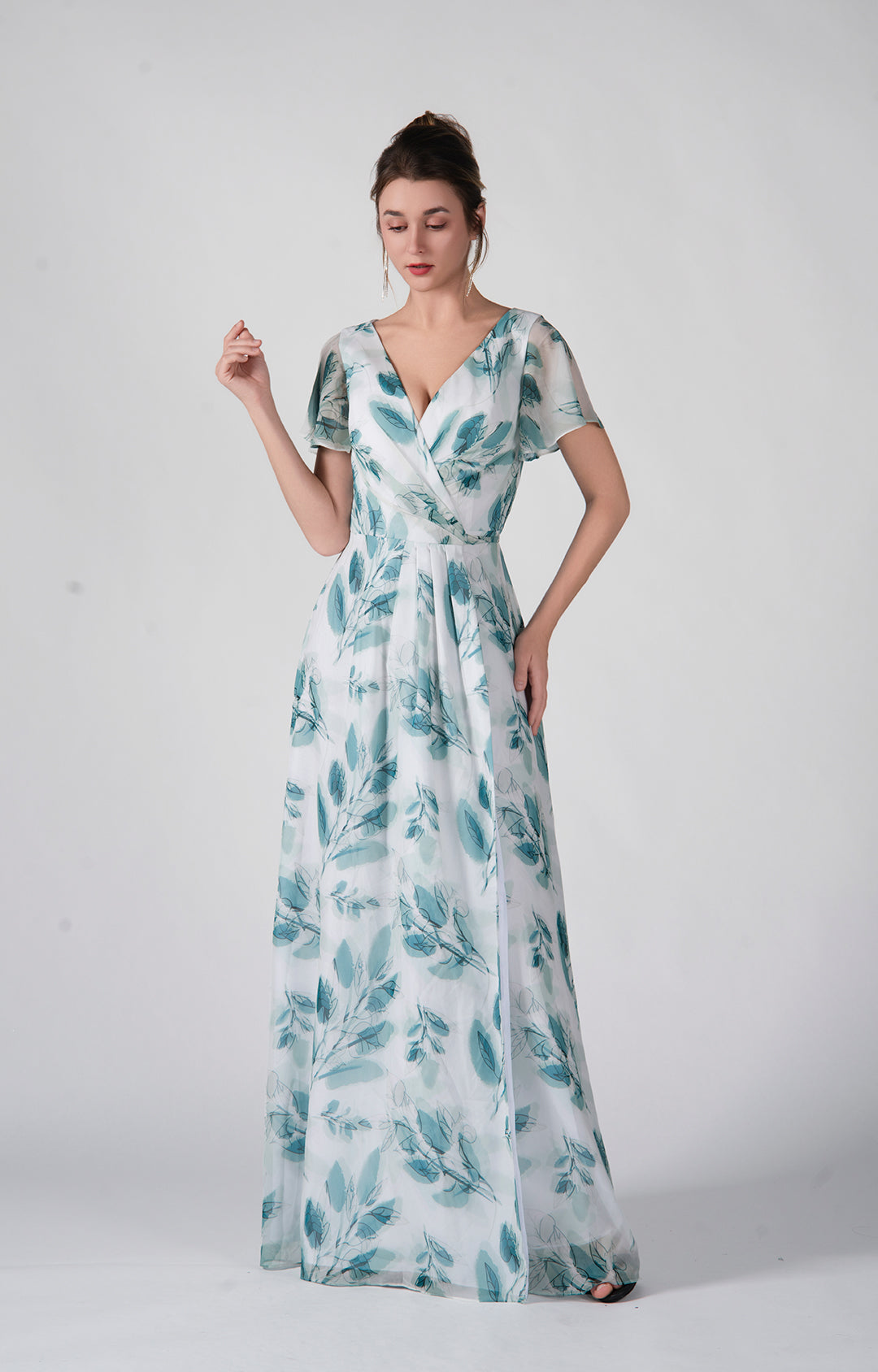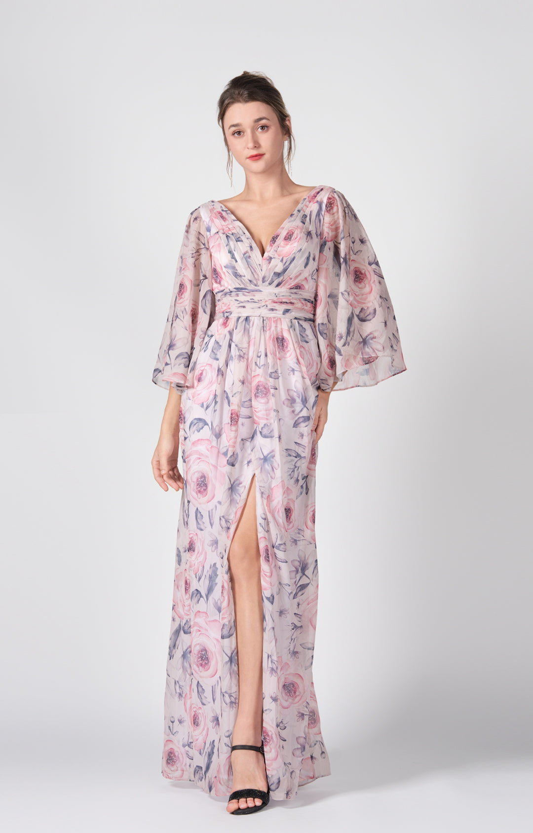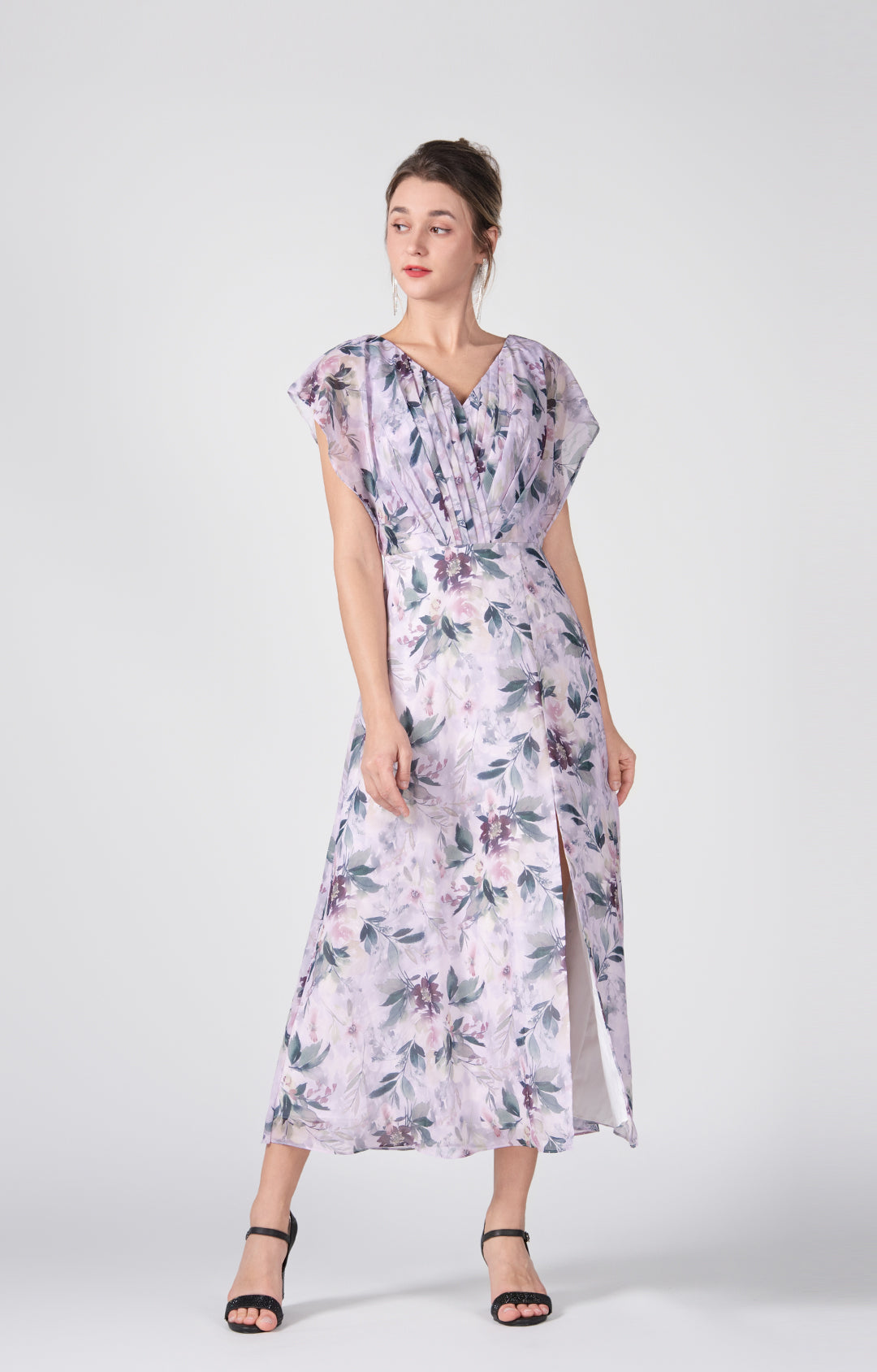 V-Neck Flutter Sleeves Front Split Floor-Length Dress