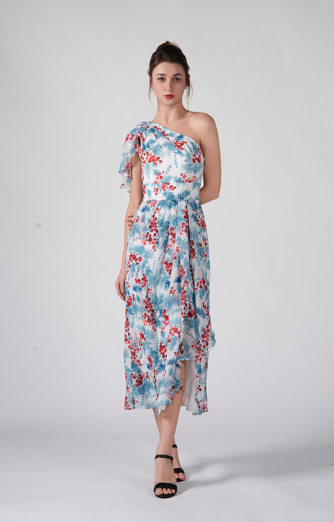 One Shoulder Ruffles Flowy Pleated Midi Dress