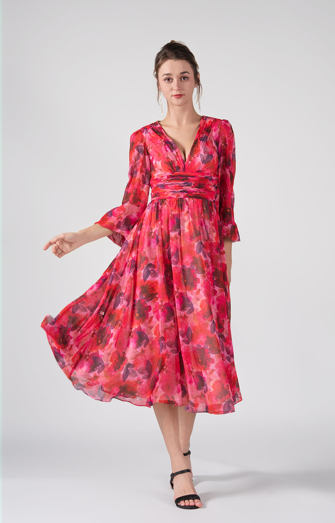 V-Neck Long Puff Sleeves A-Line Pleats Midi Dress