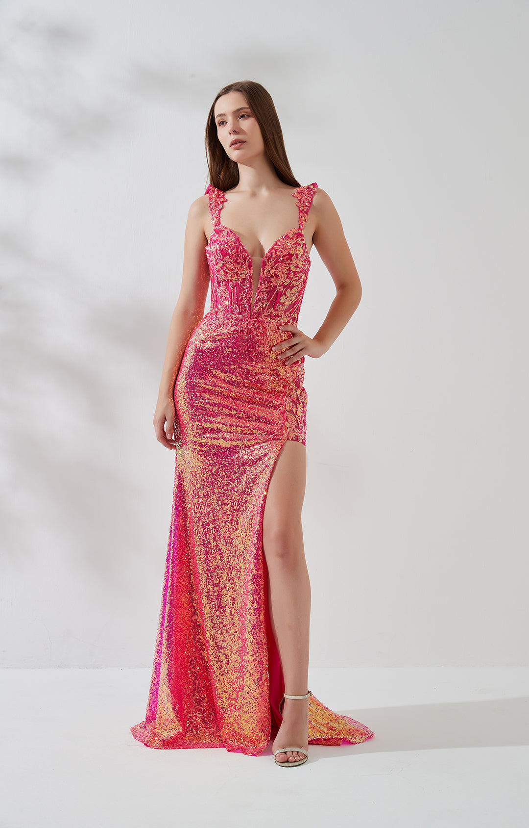 Robe de bal longue en dentelle à col en V profond et sequins, fendue sur le côté