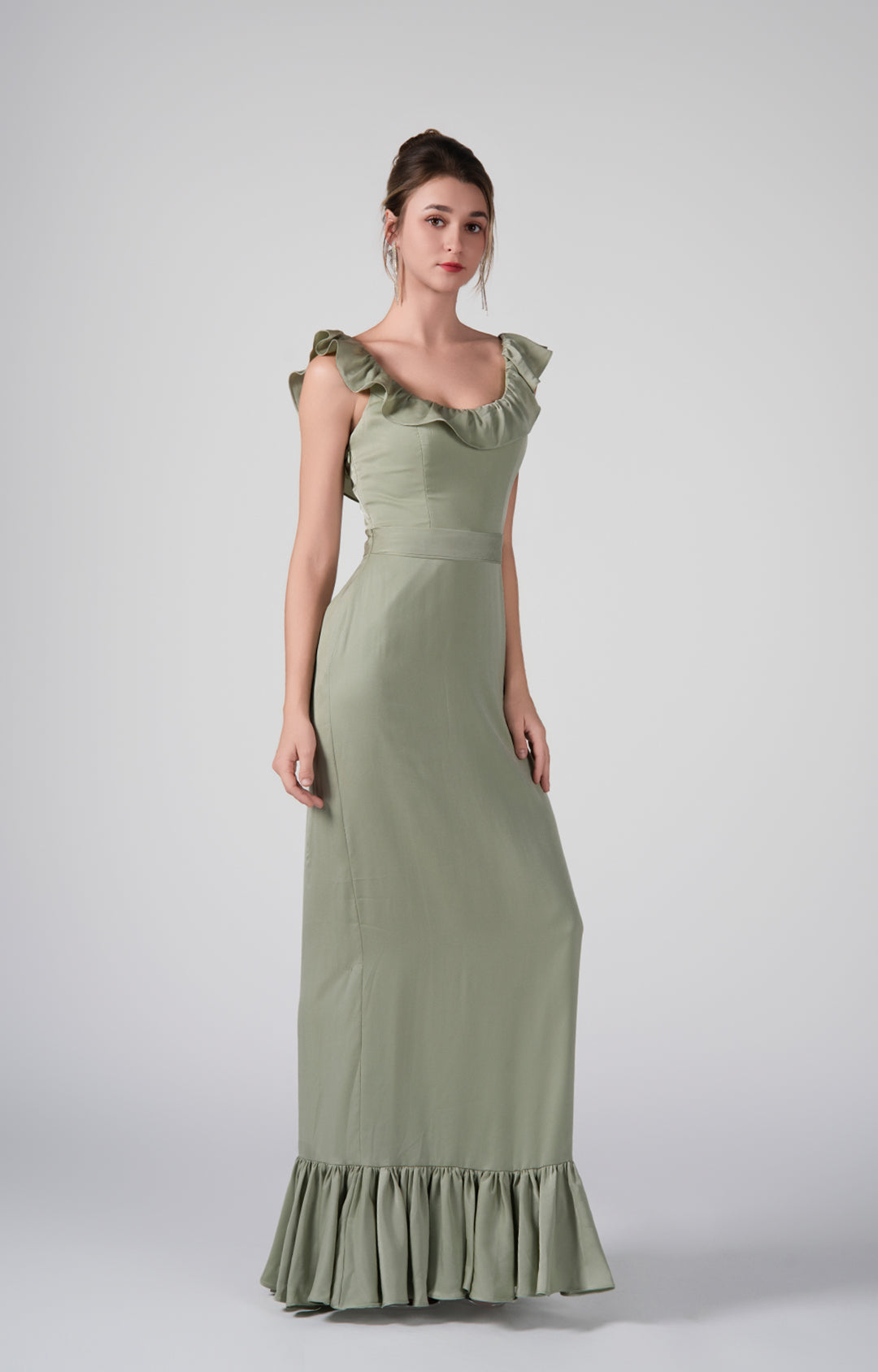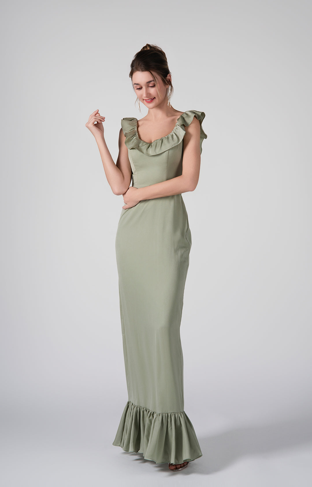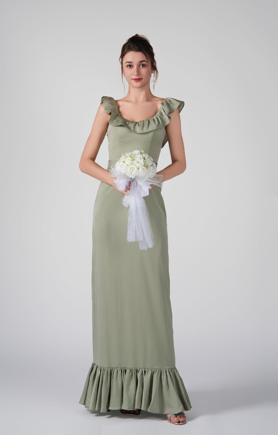 This matte acetate dress is perfect for evening events, formal parties, weddings, or any occasion that requires a graceful and sophisticated look. Its romantic design and elegant details make it a perfect choice for making a statement of style and elegance.