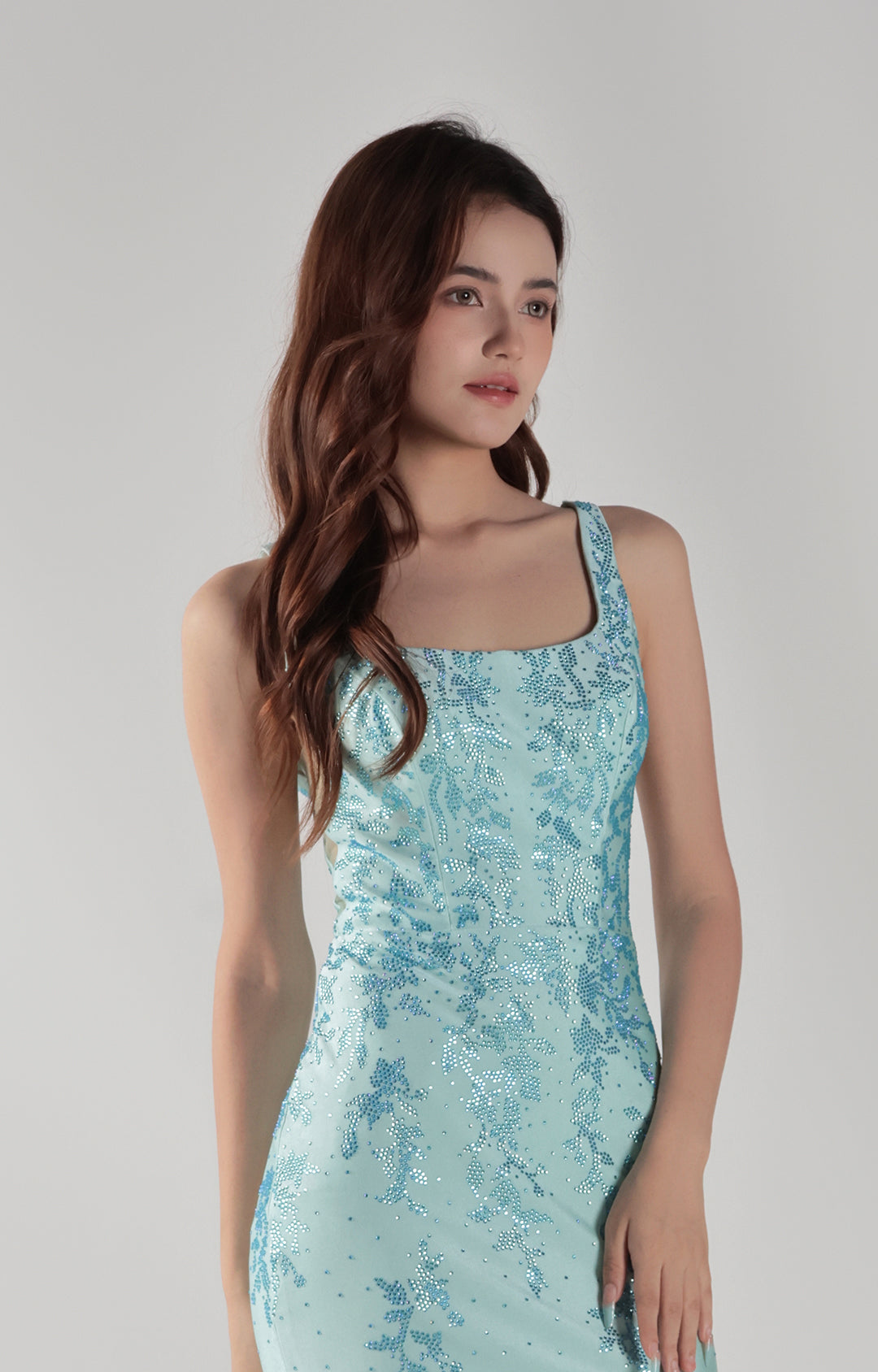 Square Neckline Wide Straps Appliqued V-Cut Back Mini Dress