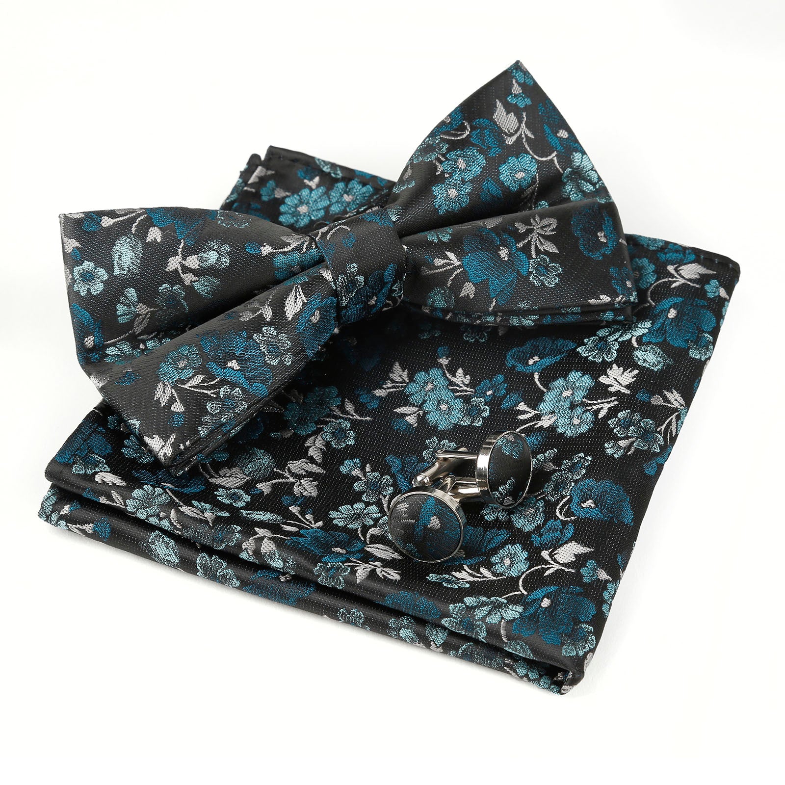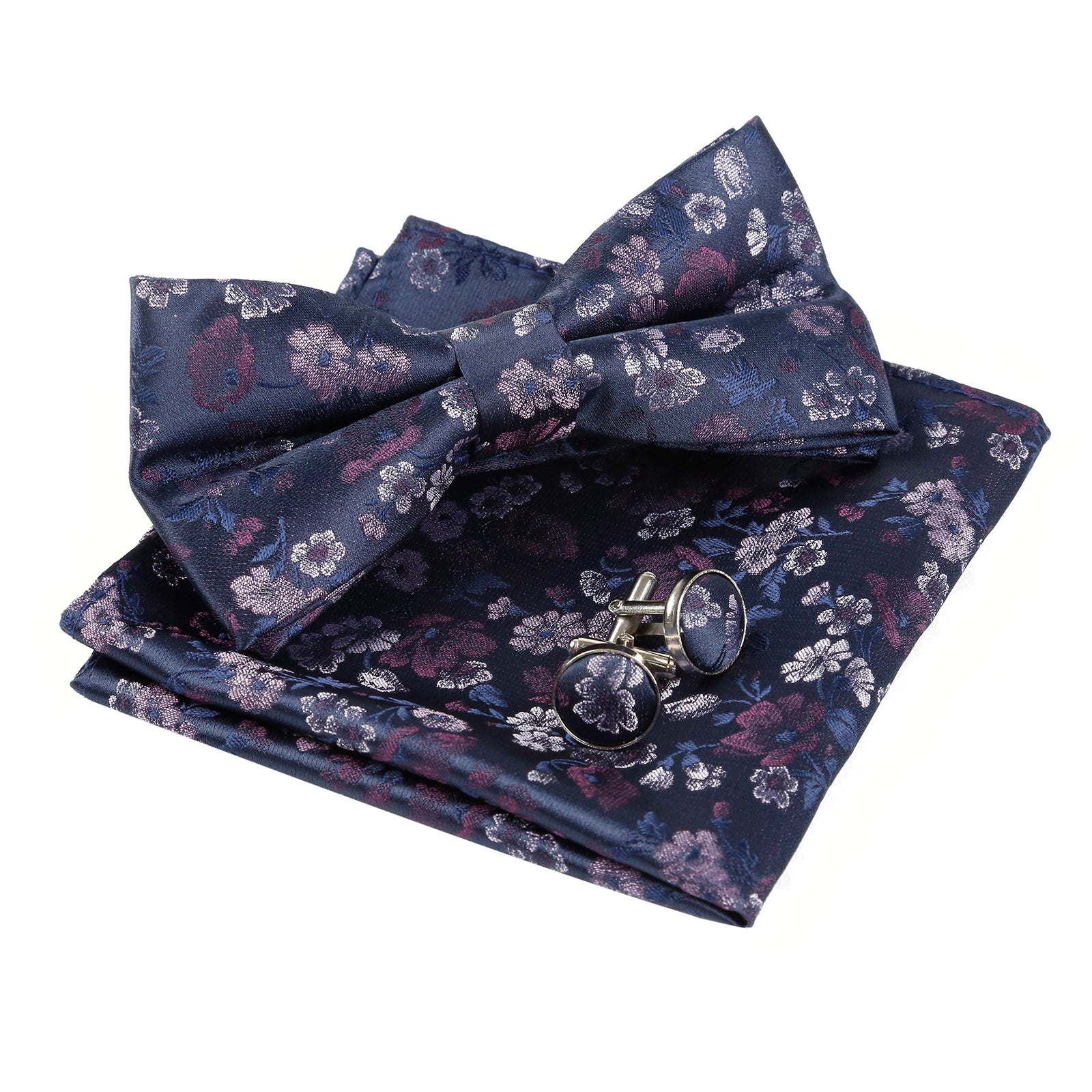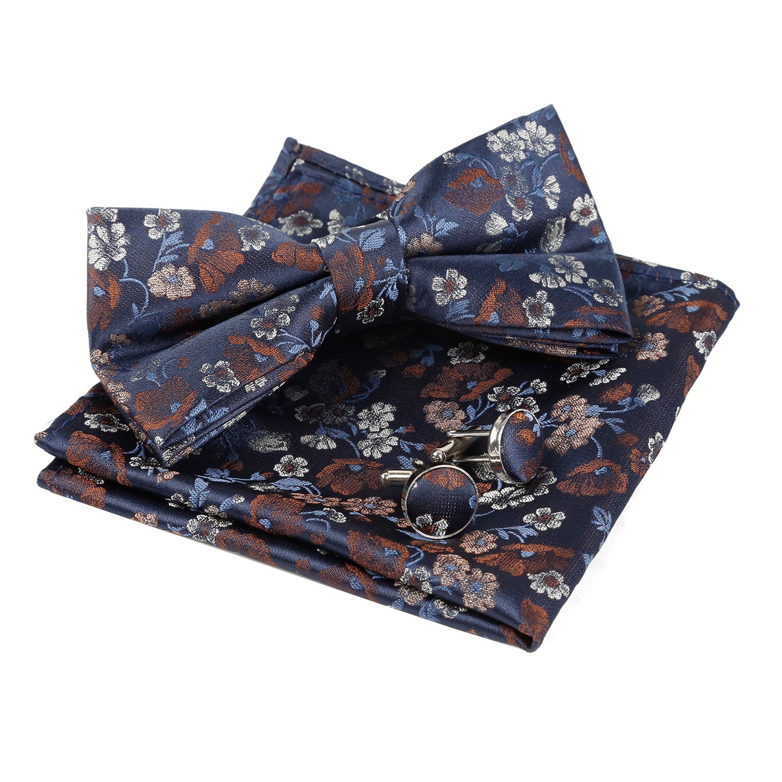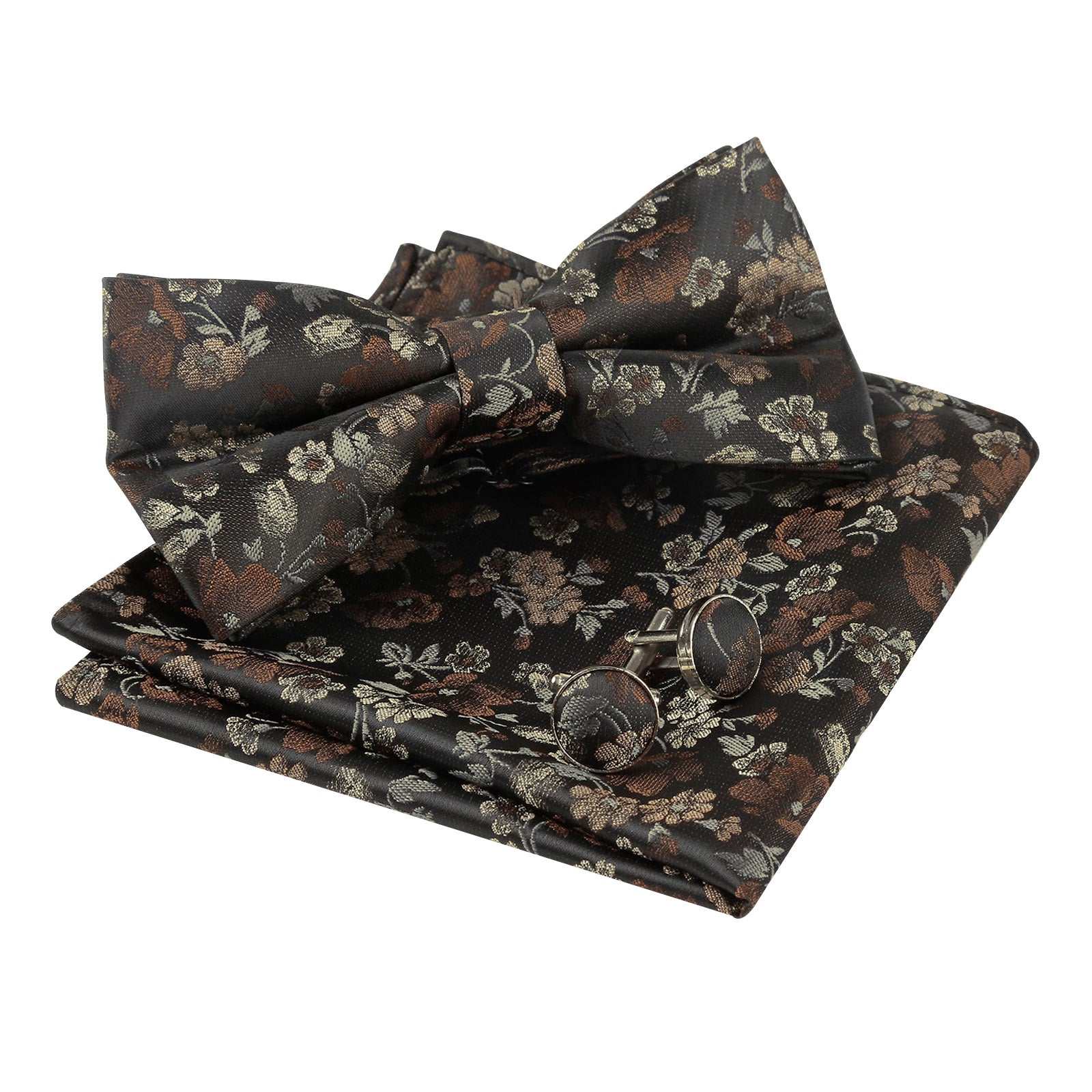 Mens Pre-tied Floral Woven Bow Tie, Handkerchief, Cufflinks Set-006