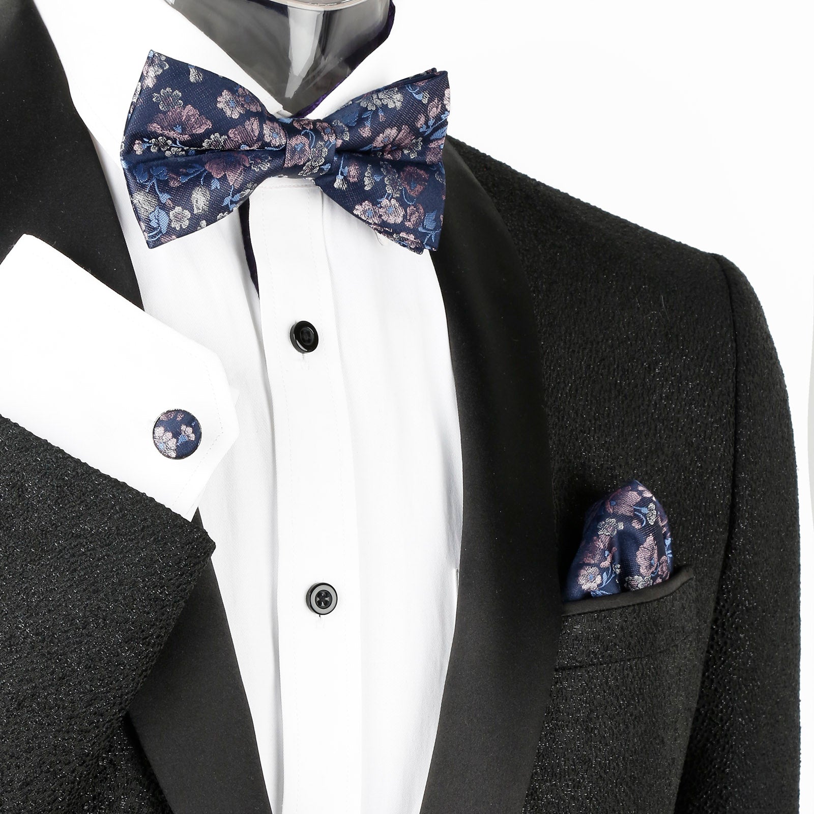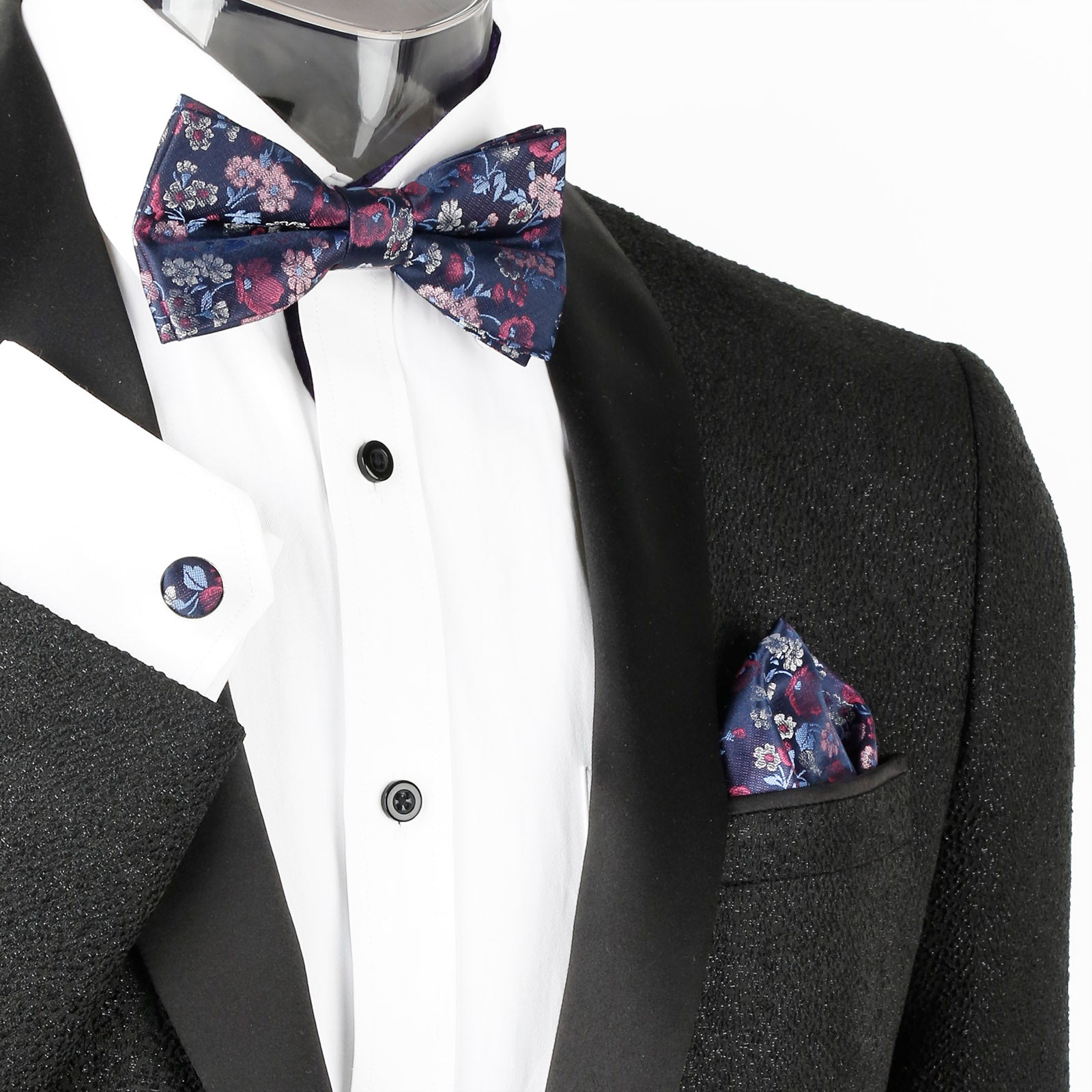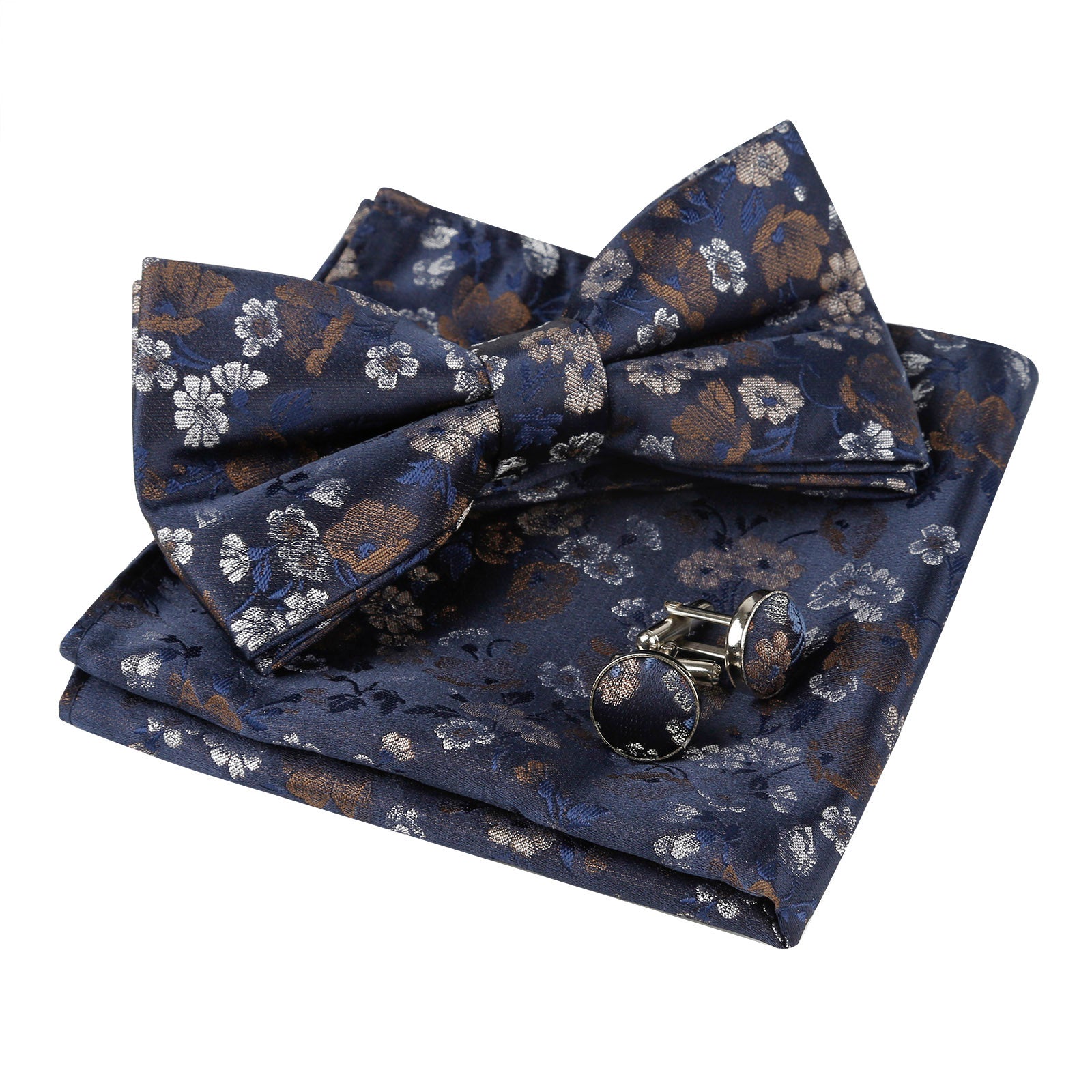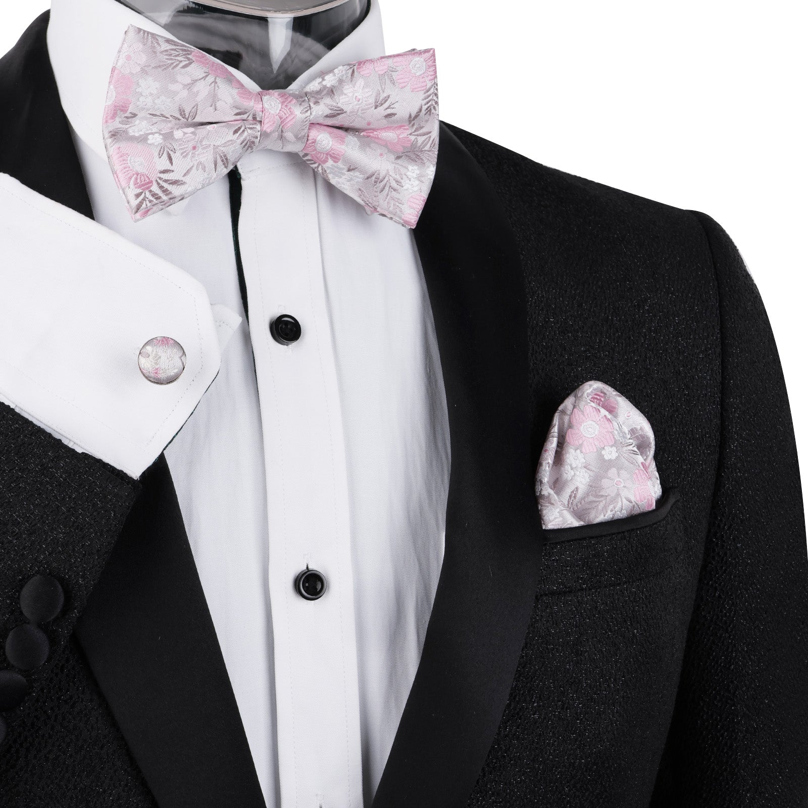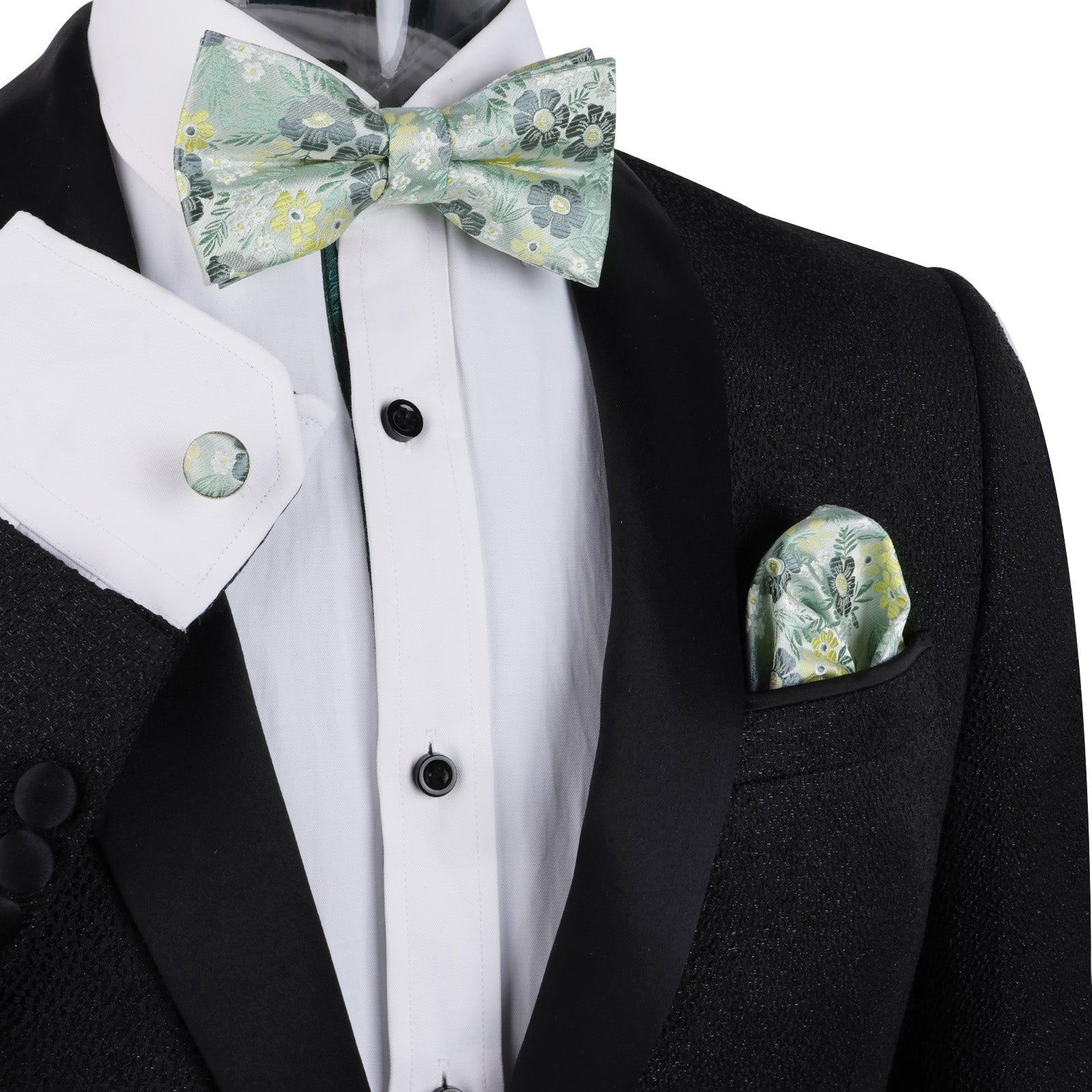 Mens Pre-tied Floral Woven Bow Tie, Handkerchief, Cufflinks Set-006