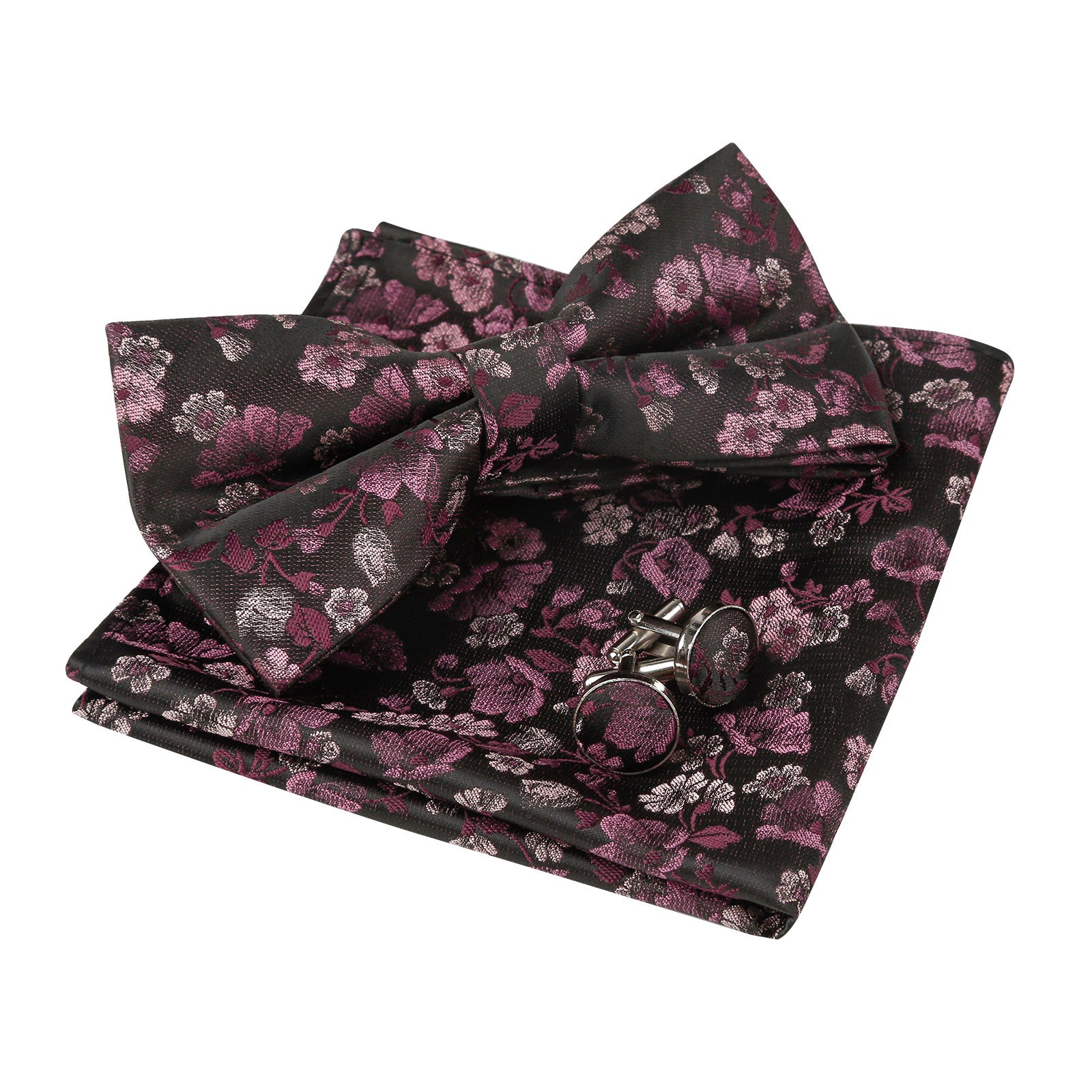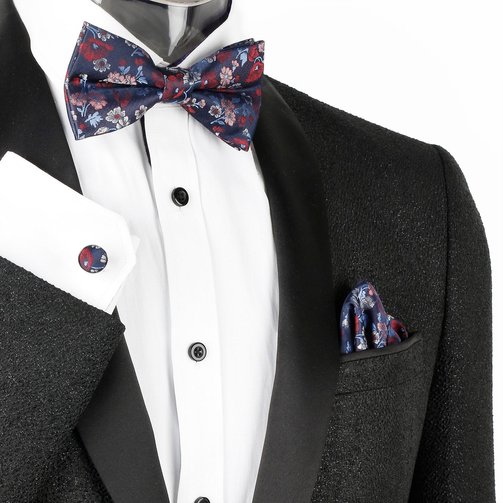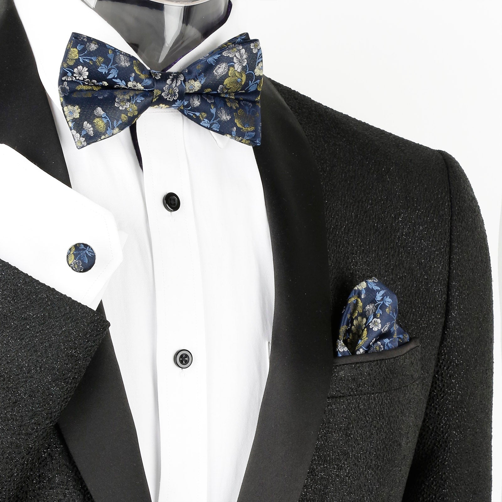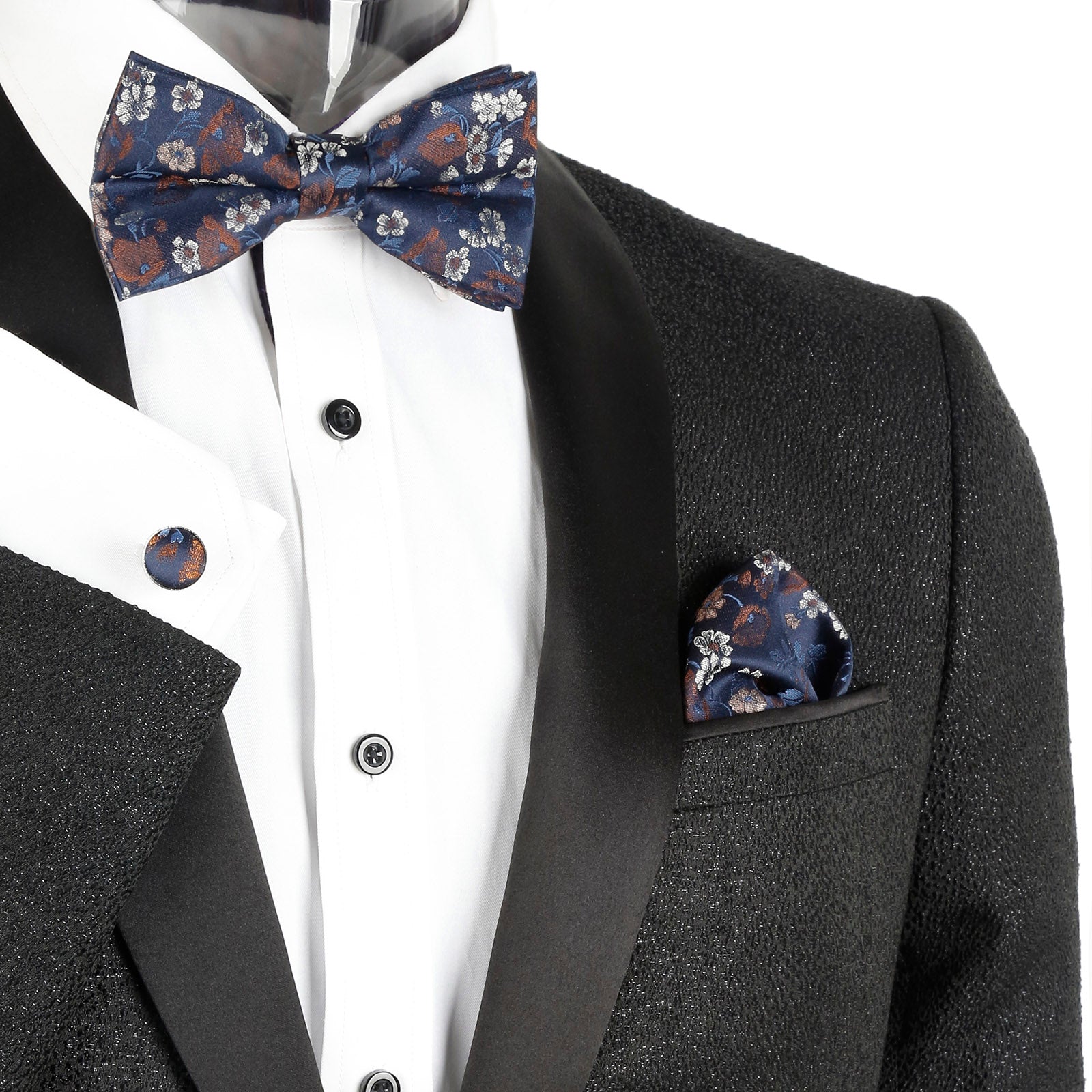 Mens Pre-tied Floral Woven Bow Tie, Handkerchief, Cufflinks Set-006